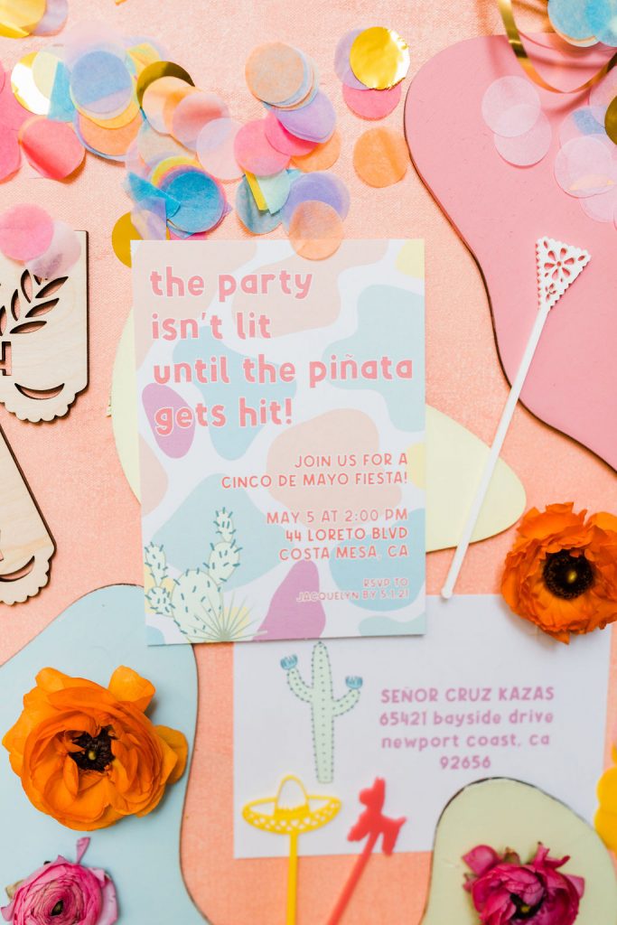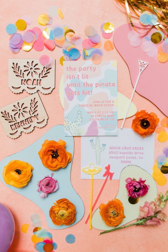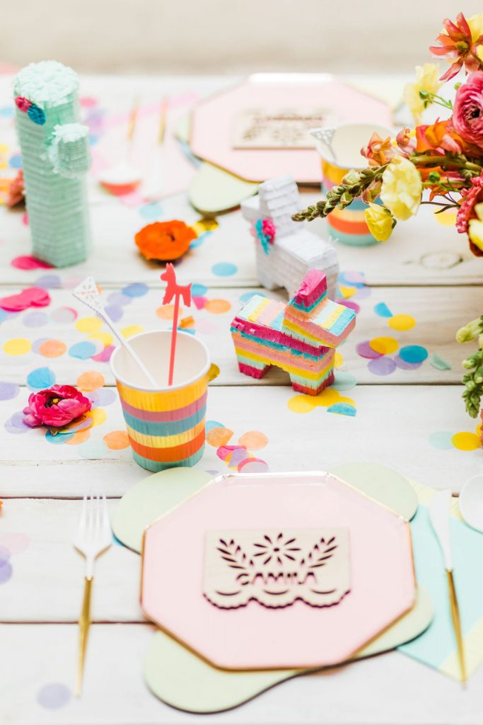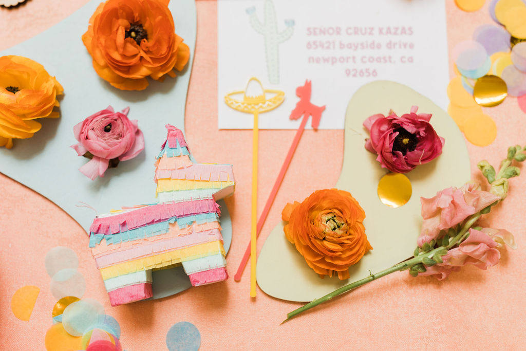 The invite by Poppy Jack Shop could not have been cuter, along with her fun Papel Picado inspired place cards and adorable stir sticks she created! She also did these fun color cut-outs for us to use throughout the shoot for styling or whatnot and I loved them! And how perfect is the wording on the invite – The party isn’t lit until the piñata gets hit!!