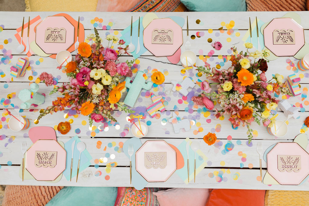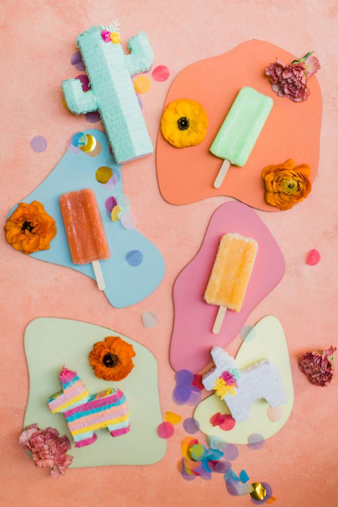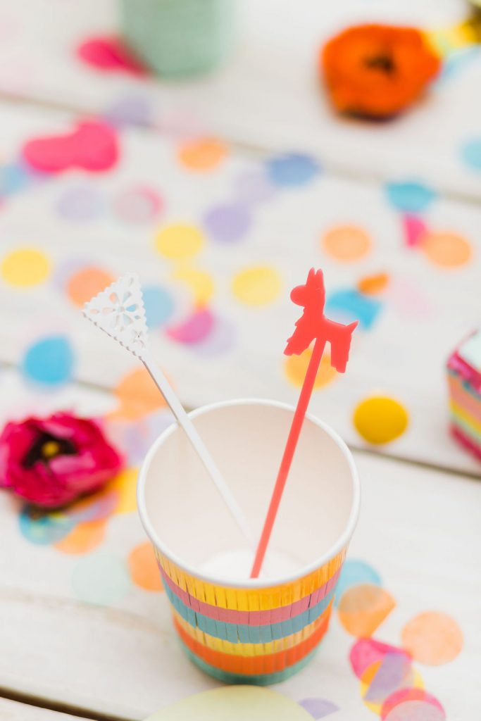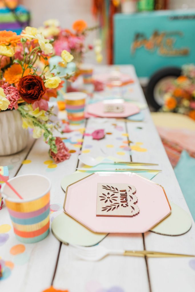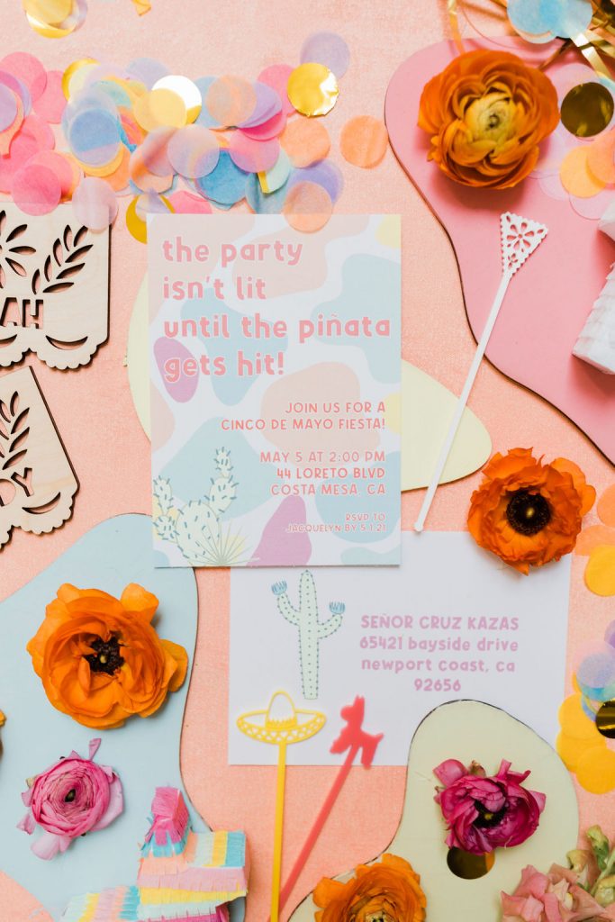 The invite by Poppy Jack Shop could not have been cuter, along with her fun Papel Picado inspired place cards and adorable stir sticks she created! She also did these fun color cut-outs for us to use throughout the shoot for styling or whatnot and I loved them! And how perfect is the wording on the invite – The party isn’t lit until the piñata gets hit!!