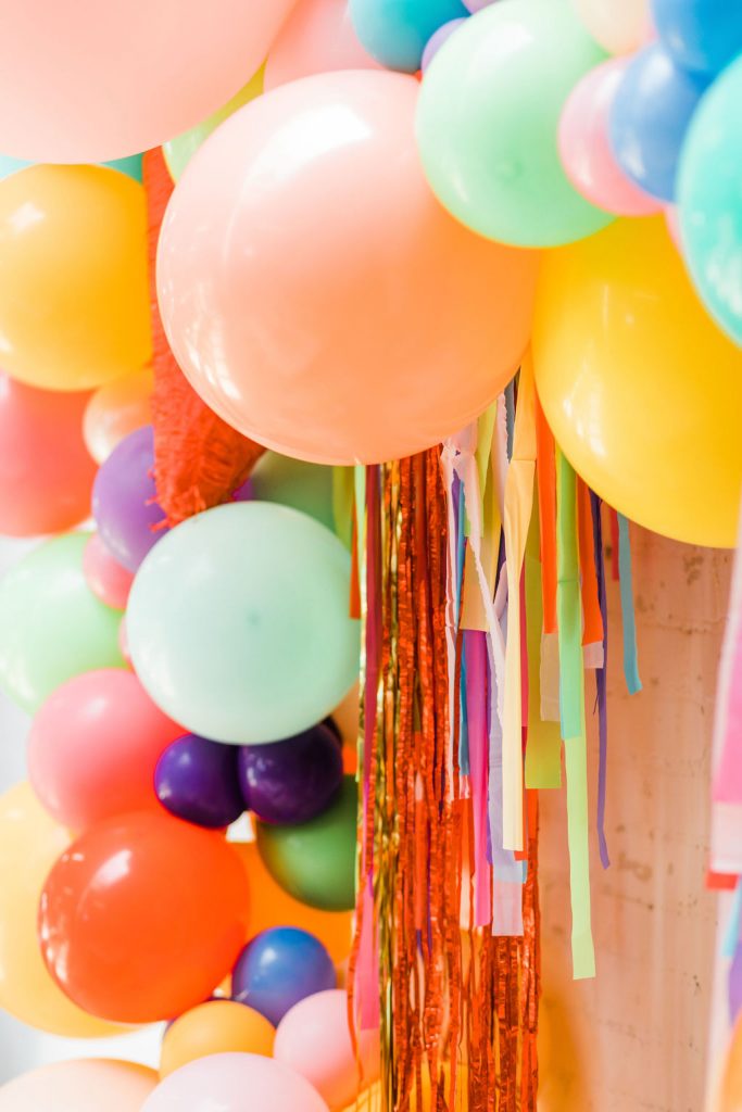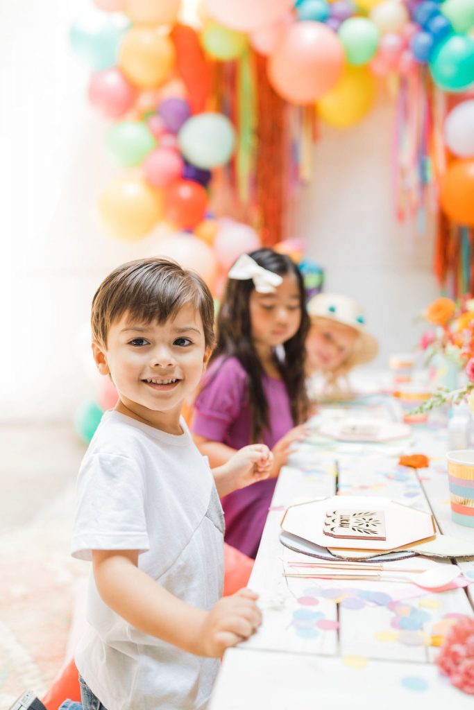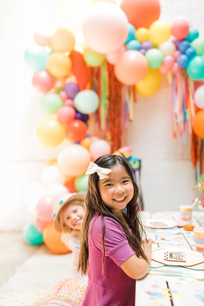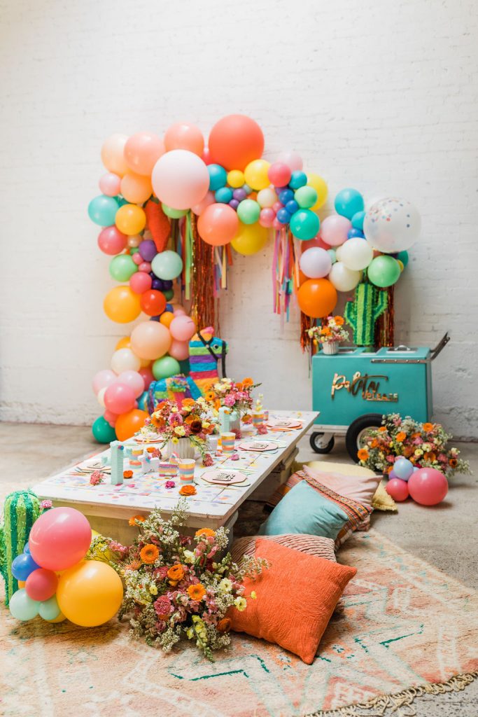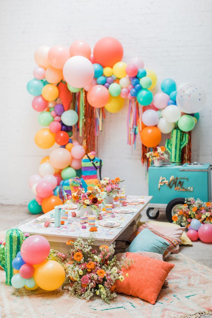 Obsessed is an understatement on this one!!! Of course, you have to have an incredible backdrop!  Ellen from The Pop Shop nailed it with all the different colored balloons and fun fringe!  Sprig & Spring had lots of fun with color on those florals, they were a definite wow factor!  The table was set with fun fringe napkins and cups from Meri Meri and Bonjour Fete, aren’t they fun?!  And you know my friend Marnie at Sweet Salvage Rentals is my go-to for all kid’s parties when it comes to rentals, her endless supply of fun and unique pieces add so much to this shoot!