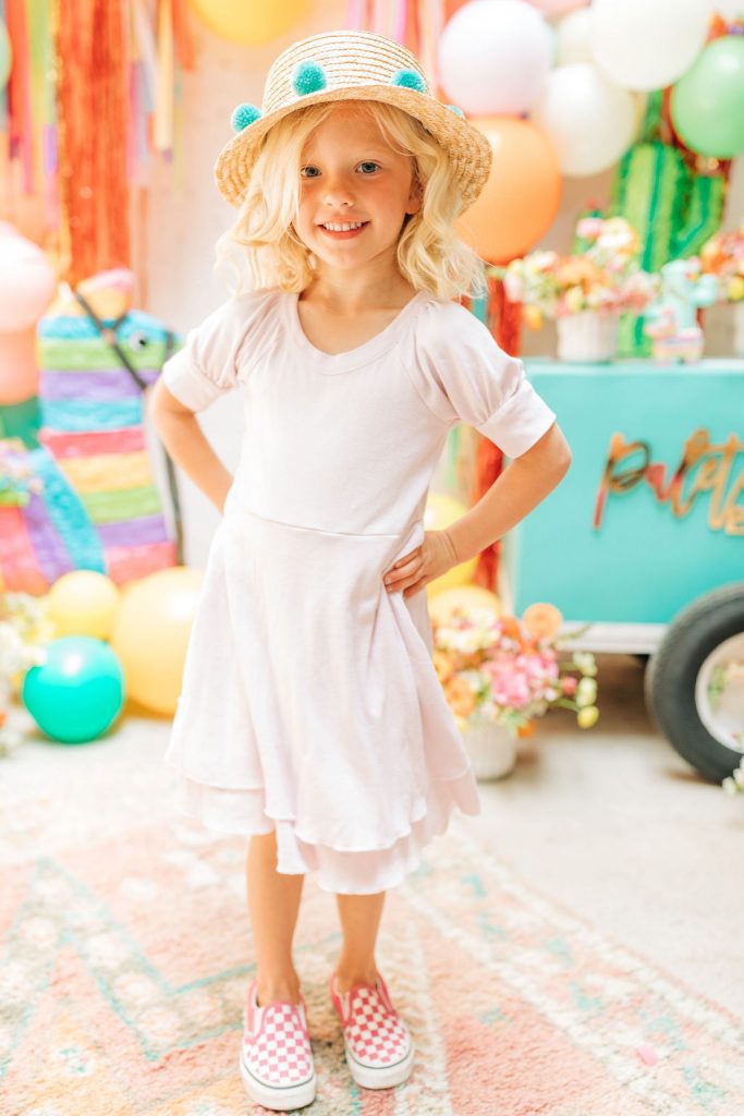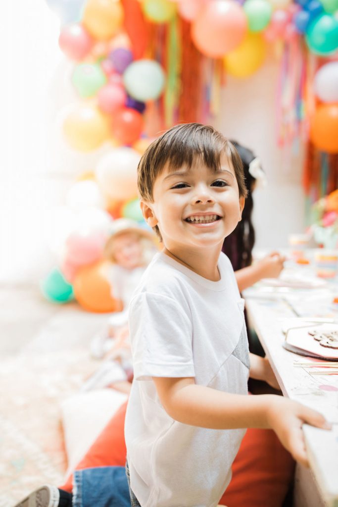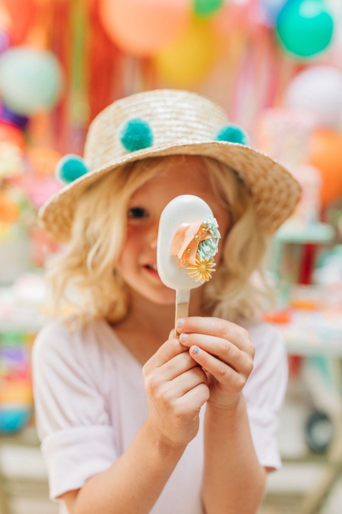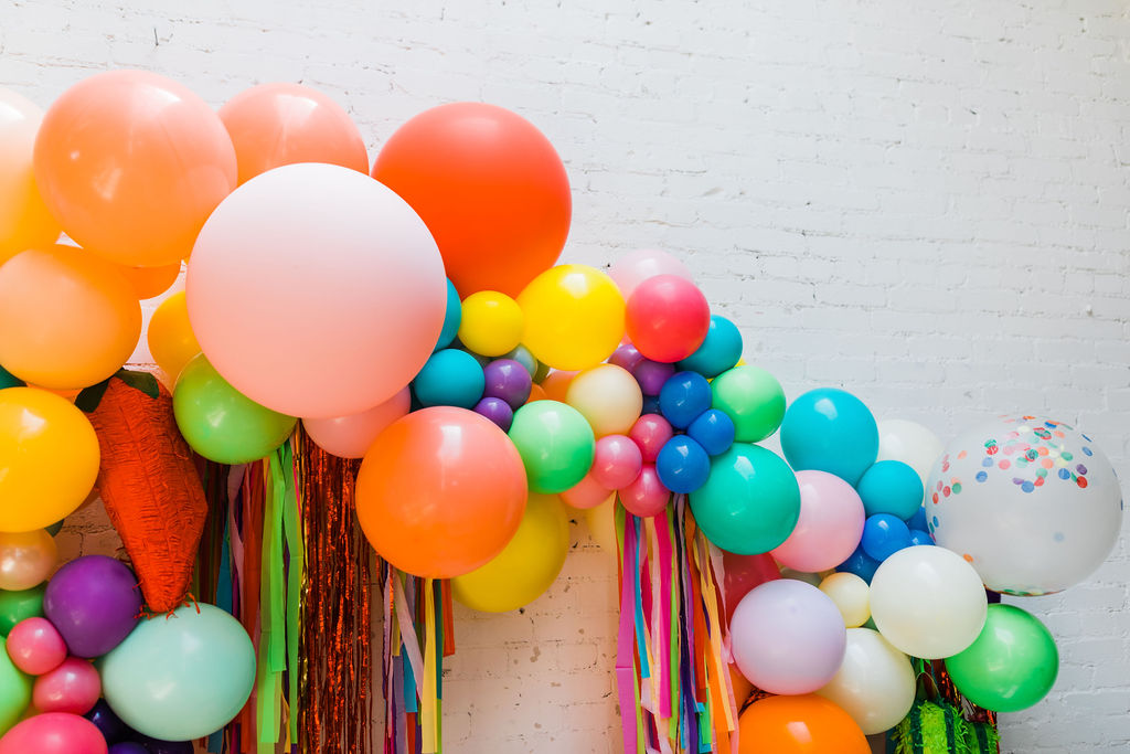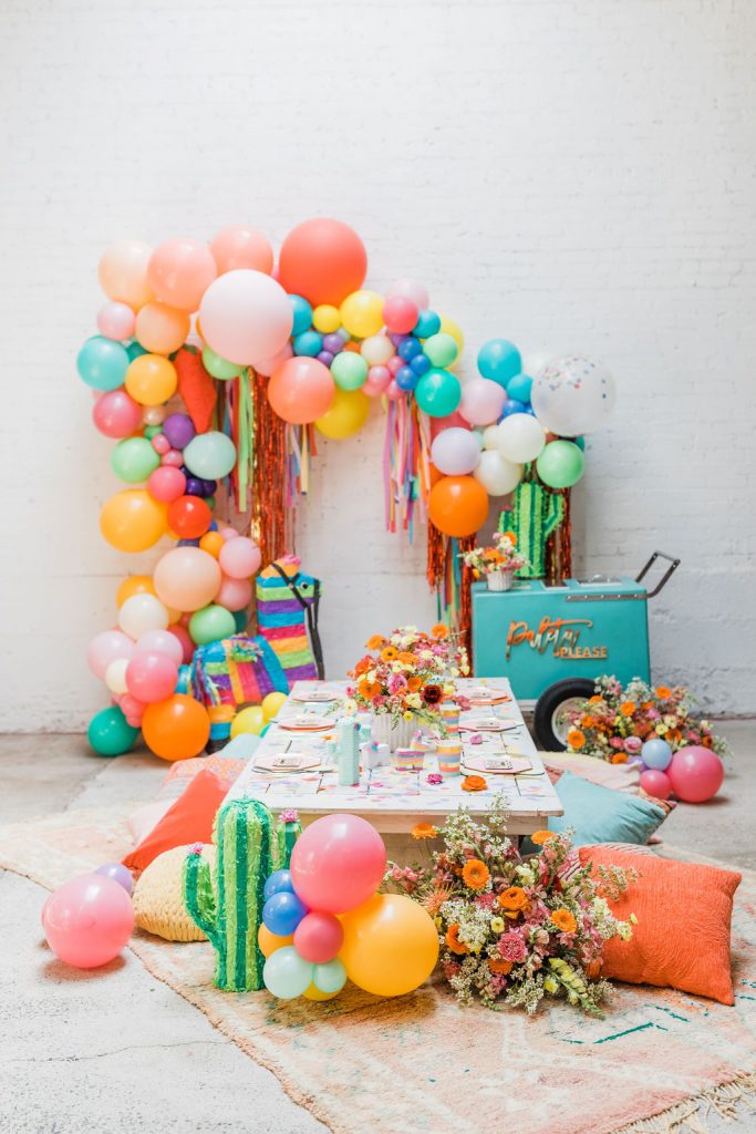 Obsessed is an understatement on this one!!! Of course, you have to have an incredible backdrop!  Ellen from The Pop Shop nailed it with all the different colored balloons and fun fringe!  Sprig & Spring had lots of fun with color on those florals, they were a definite wow factor!  The table was set with fun fringe napkins and cups from Meri Meri and Bonjour Fete, aren’t they fun?!  And you know my friend Marnie at Sweet Salvage Rentals is my go-to for all kid’s parties when it comes to rentals, her endless supply of fun and unique pieces add so much to this shoot!