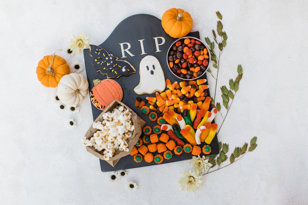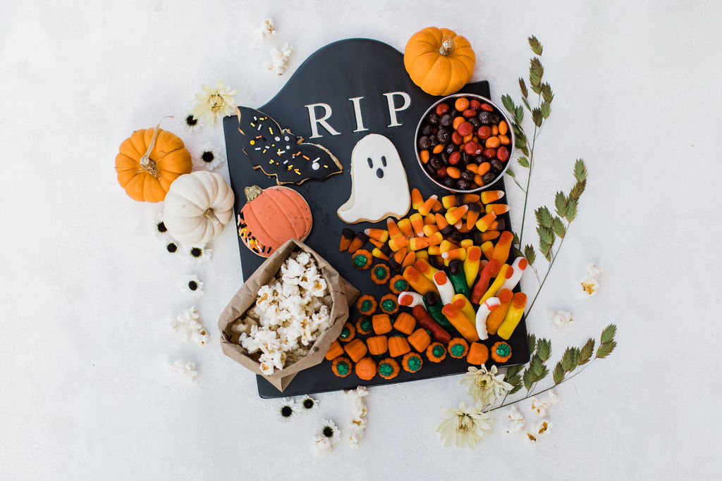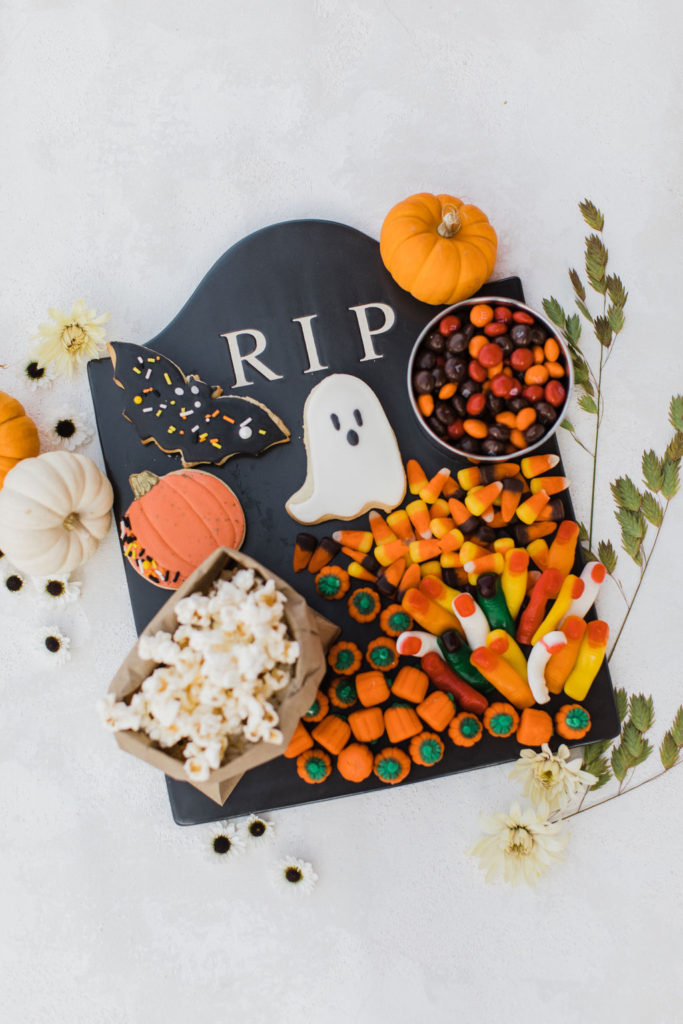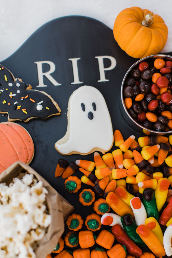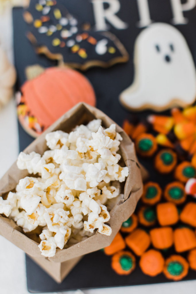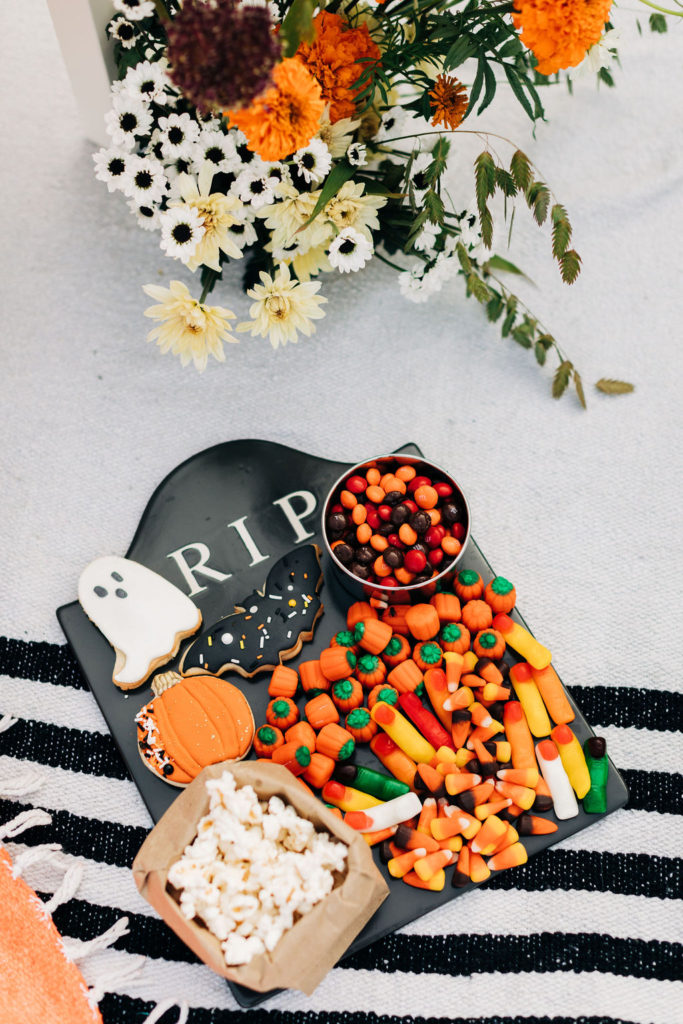 We brought the movie concessions stand home! Going to the movies and having treats goes hand in hand, so why wouldn’t we do that for our party? Pottery Barn has this amazing RIP platter, and I had to dress them up with all these yummy goodies. Frost Your Cookie did the adorable cookies, and the rest I grabbed at the grocery store.