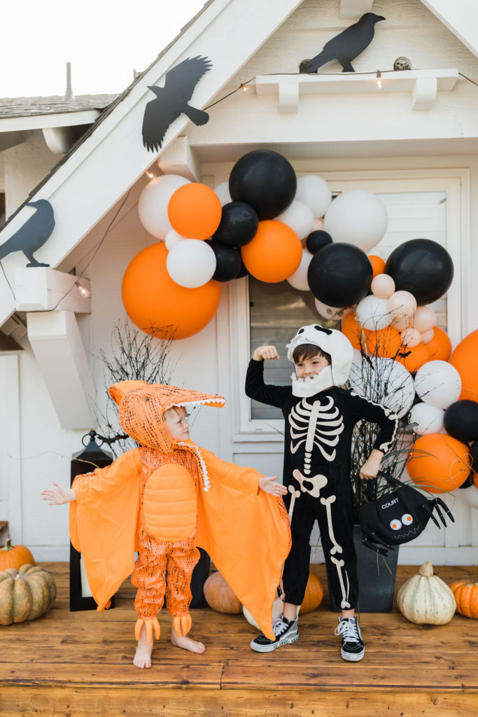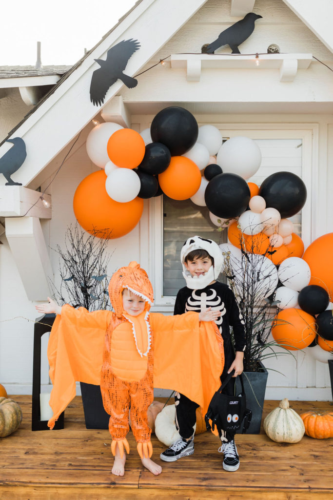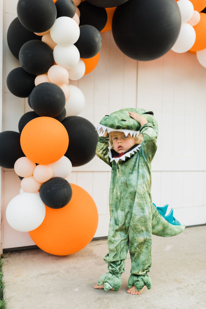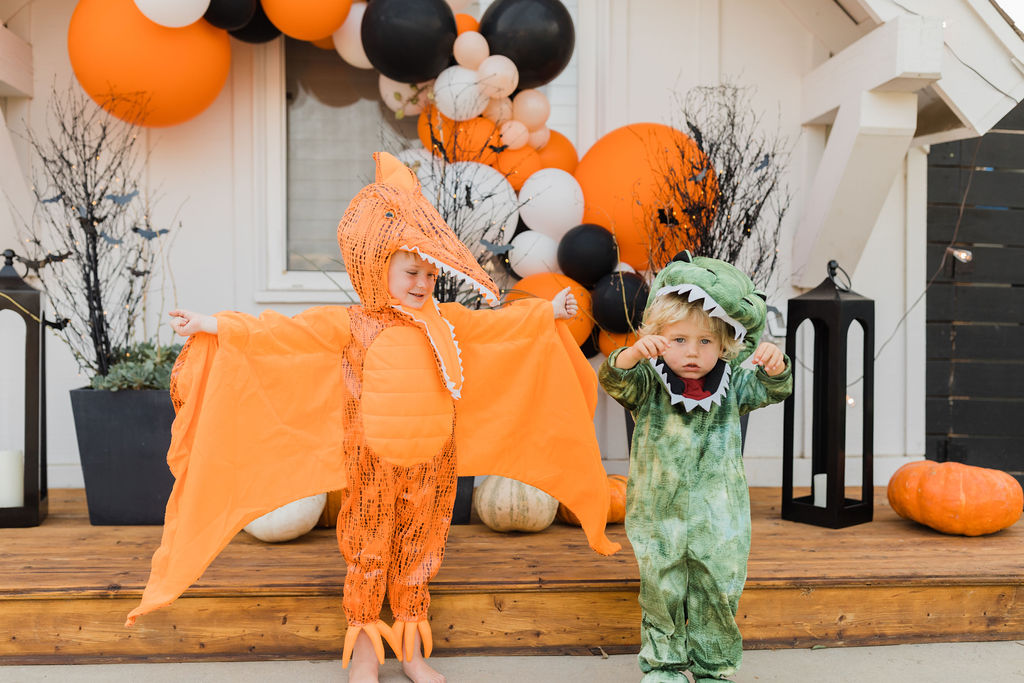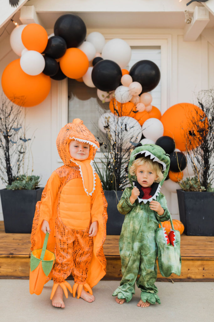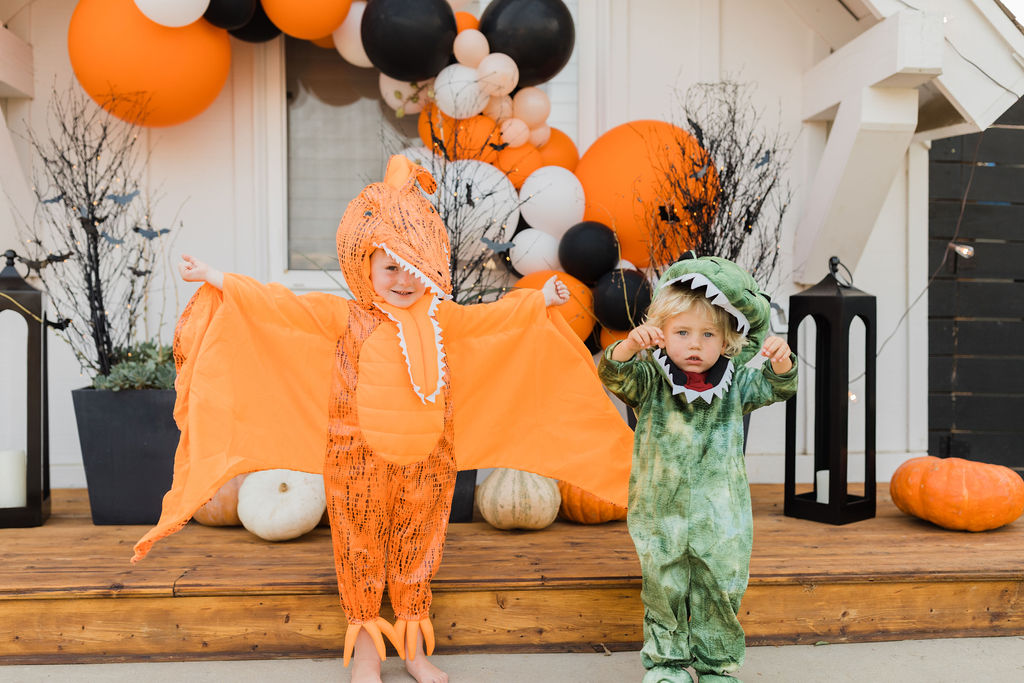 Starting with the cutest and scariest dinosaurs!! My son Cruz is still loving dinosaurs, you may remember last year he was that sweet little t-rex. Well, this year he let his friend Owen be a t-rex (an an adorable one at that) and he chose the orange pterodactyl! I can’t get enough of these two!