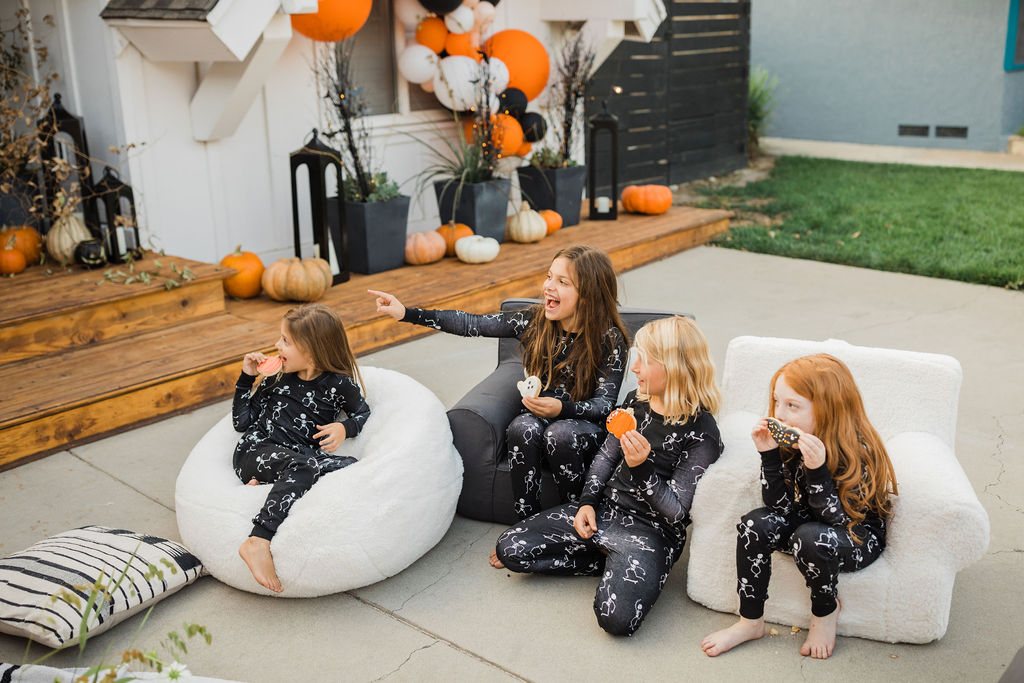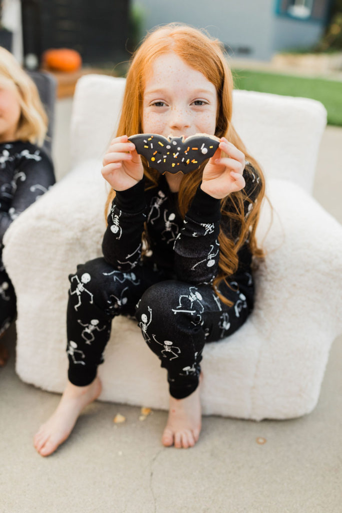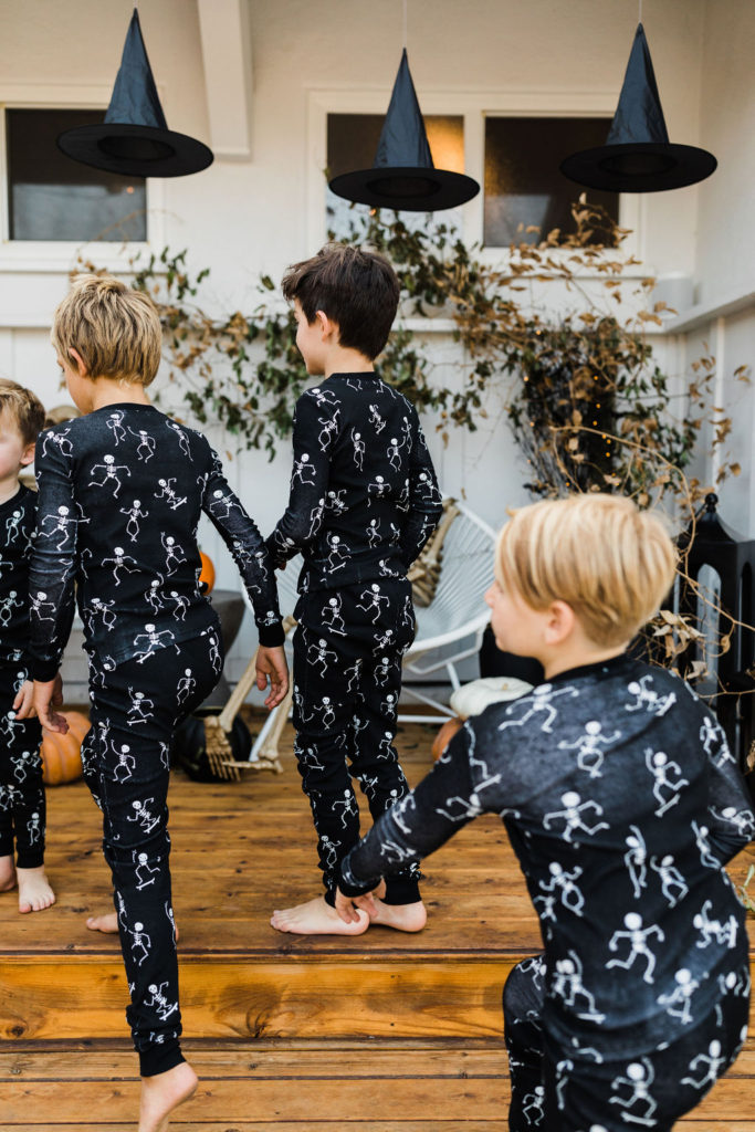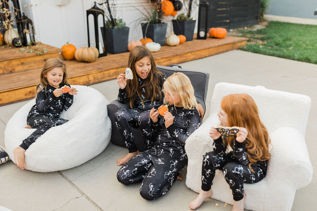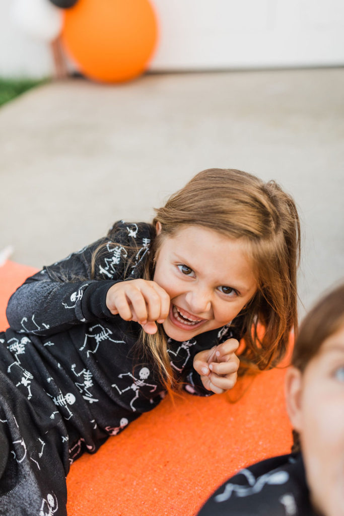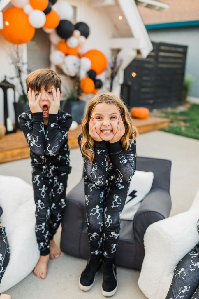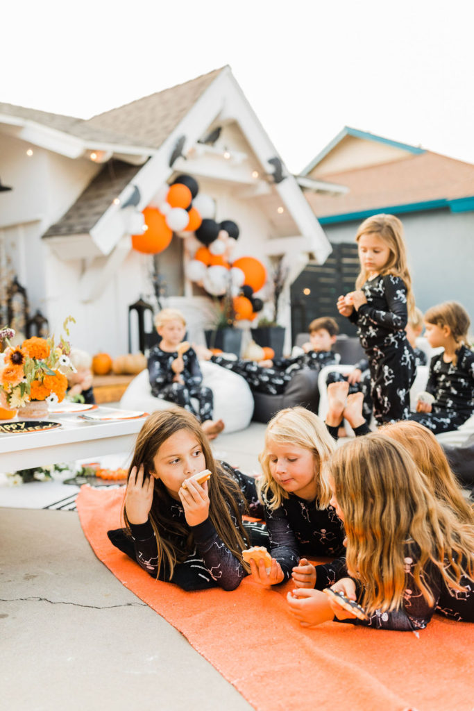 We are loving these glow in the dark skeleton pajamas from PBK. They are the super cozy and the seeing kids in matching pajamas is basically my favorite. What a fun way to end the night – getting in your jammies, eating all the treats and watching a movie with your friends. These kids are living their best lives!