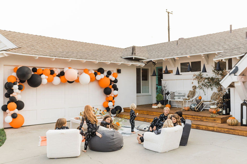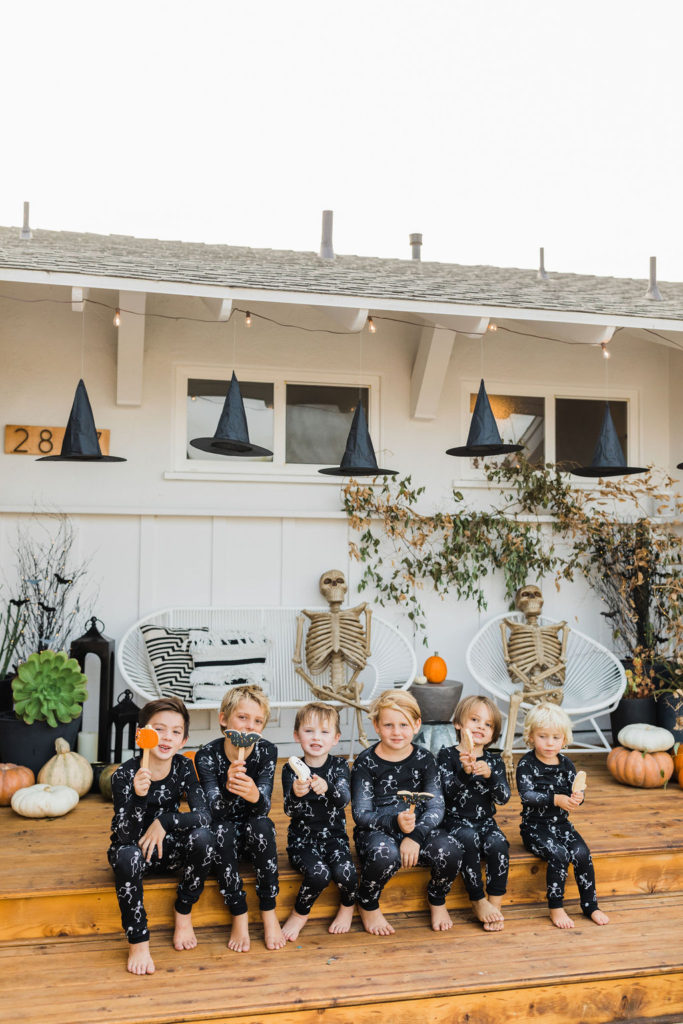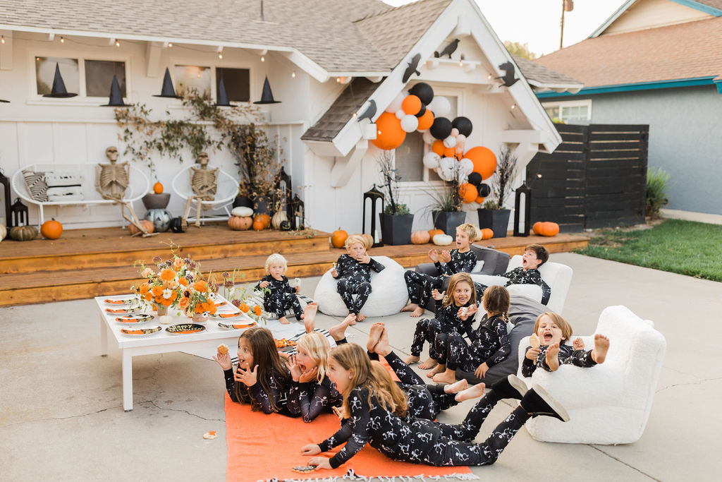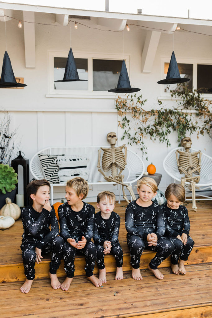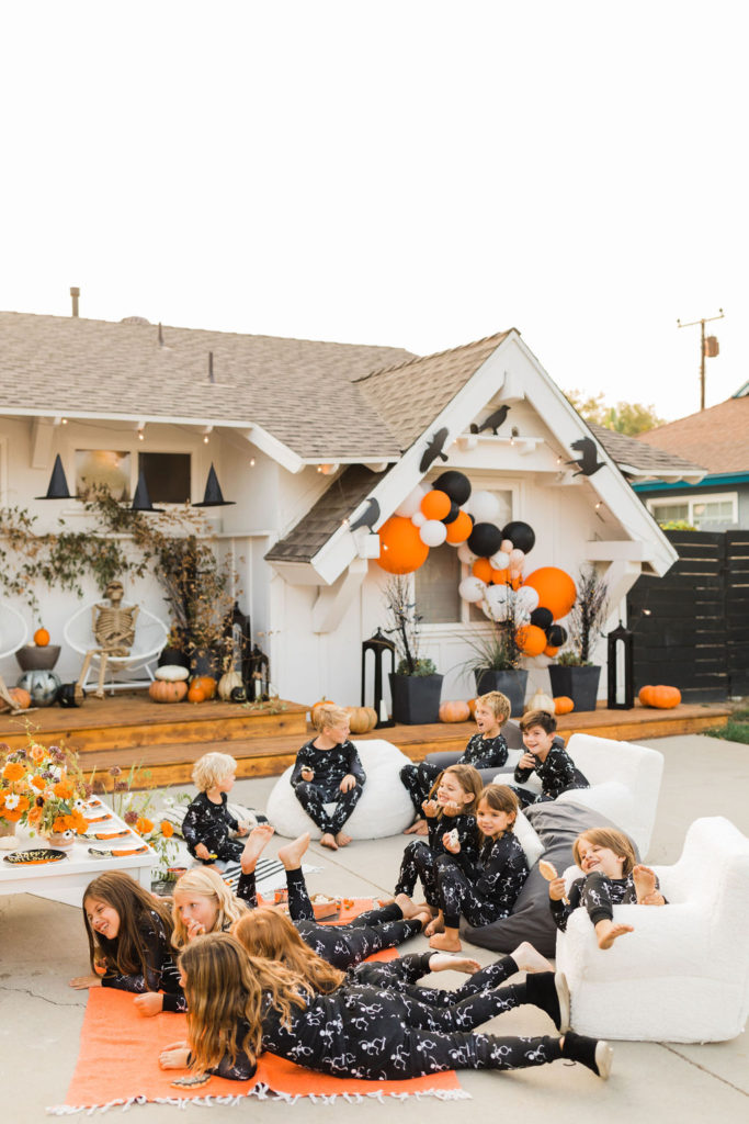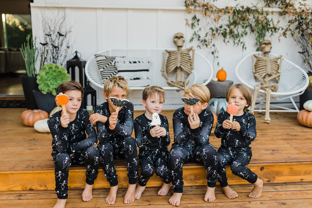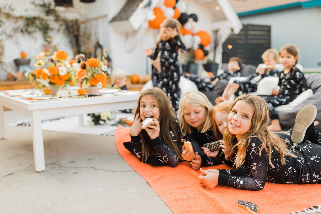 We are loving these glow in the dark skeleton pajamas from PBK. They are the super cozy and the seeing kids in matching pajamas is basically my favorite. What a fun way to end the night – getting in your jammies, eating all the treats and watching a movie with your friends. These kids are living their best lives!