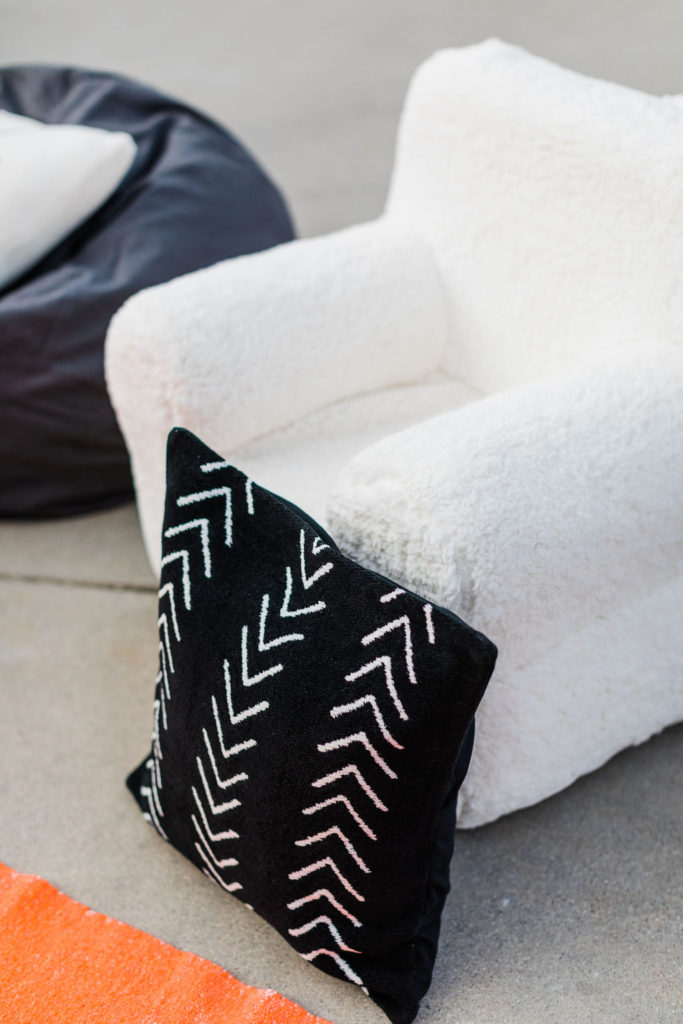 We added cozy chairs and bean bags from Pottery Barn Kids for everyone to snuggle up on. Not too shabby, I mean they look pretty darn comfortable compared to some of the movie theaters I go to! I also through in some pillows from Pottery Barn Kids and blankets from Gunn & Swain.