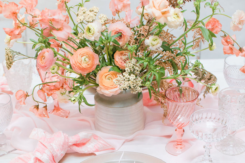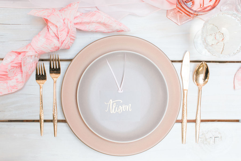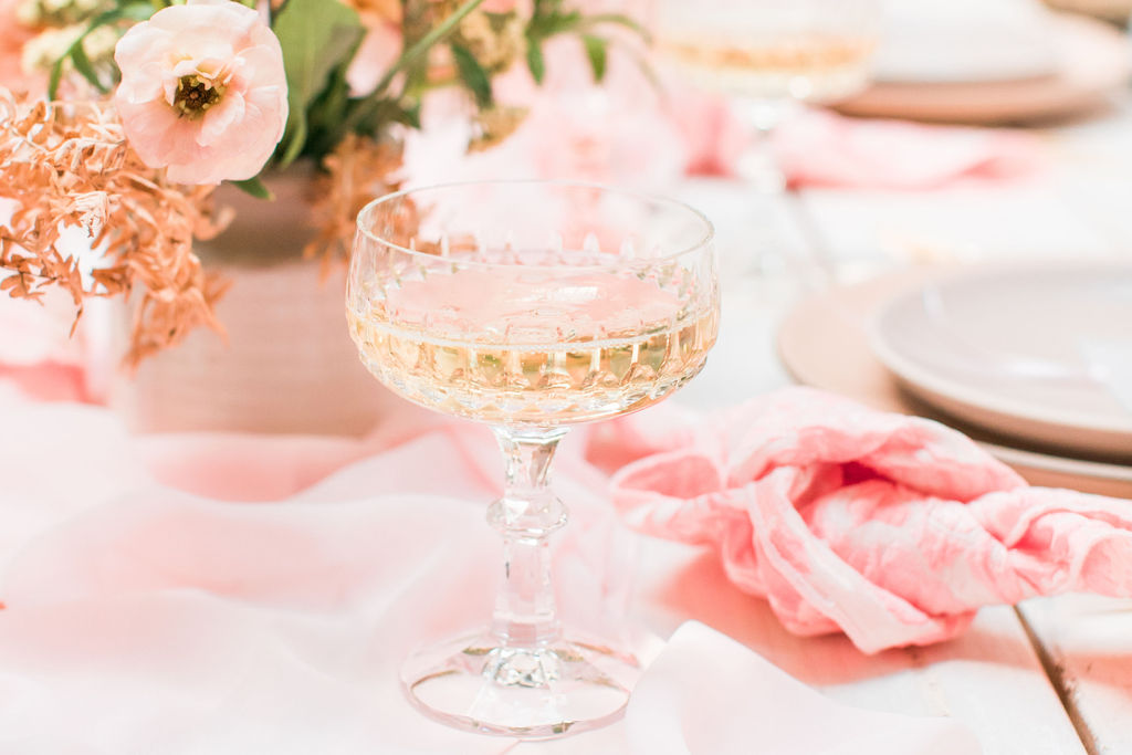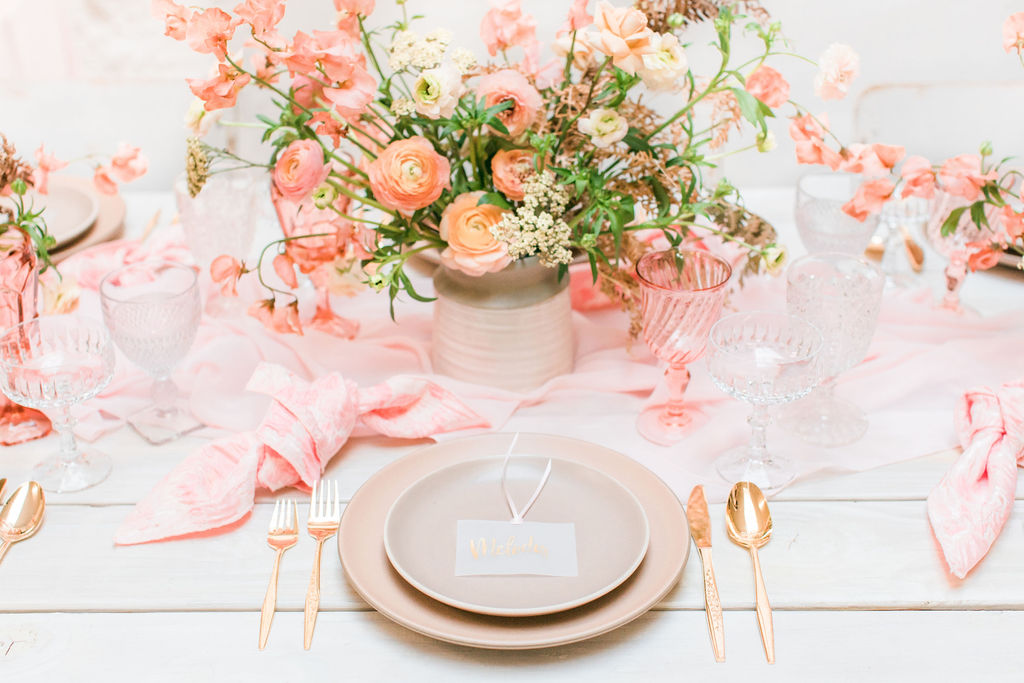 Next up is a pretty tablescape, which in my mind is #1, because you and your girls deserve it! Set the table with pretty pink plates & glassware and gold flatware, we got ours from Cherished Rentals. Next, you definitely need the most stunning floral arrangements, and our girl Alex from Third & Park didn’t disappoint! Of course you need an amazing set up – we love Sweet Salvage Rentals collection of gorgeous rugs, tables and chairs, her inventory is endless and amazing.  We added in some pretty details like Party Crush Studio’s gauzy runner and Hostess Haven’s pink napkins!