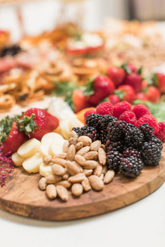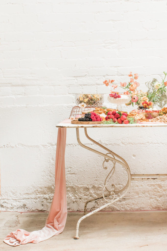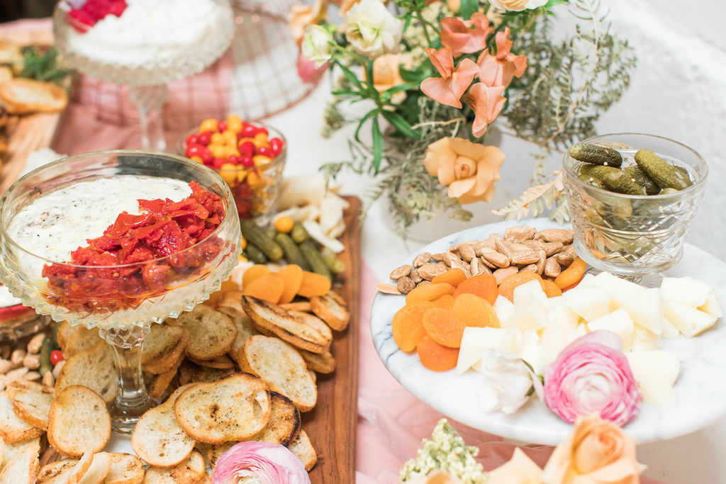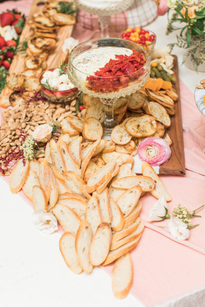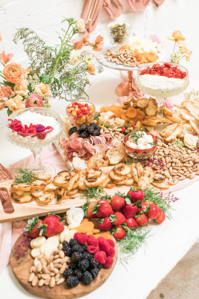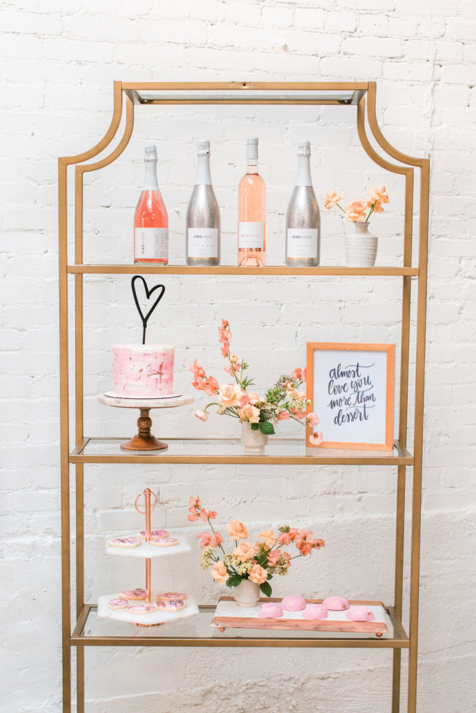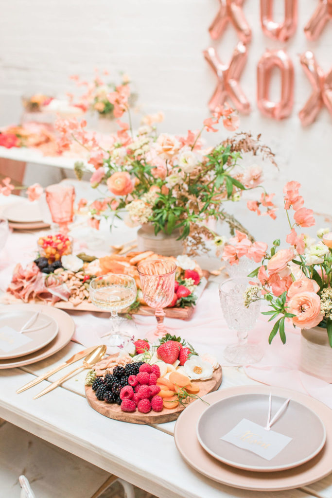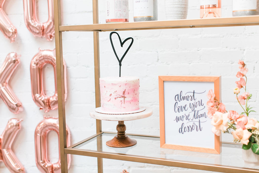 I can’t get enough of these flowers!!!!!Can we talk about these BALLOONS?!?! Our rose gold XO balloons from North Star Balloons stole the show and created the perfect backdrop!!  You could easily recreate this at home, and you have plenty of time so order these balloons here and go for it!  I love all my girls like XO so these really set the tone for the whole party!Holy cheese board heaven!!!  Colette’s Catering does it again!  They created this gorgeous spread and it wasn’t just yummy in our bellies but also incredible eye candy!!!  I love when the food is as pretty as the event itself!Every girl knows the way to our hearts are with desserts and champagne, so we had The Sweet Lemon Bakeshop create some yummy and fun desserts (how about that topper by Poppy Jack Shop?) and like I said, we got our champagne from the incredible One Hope.