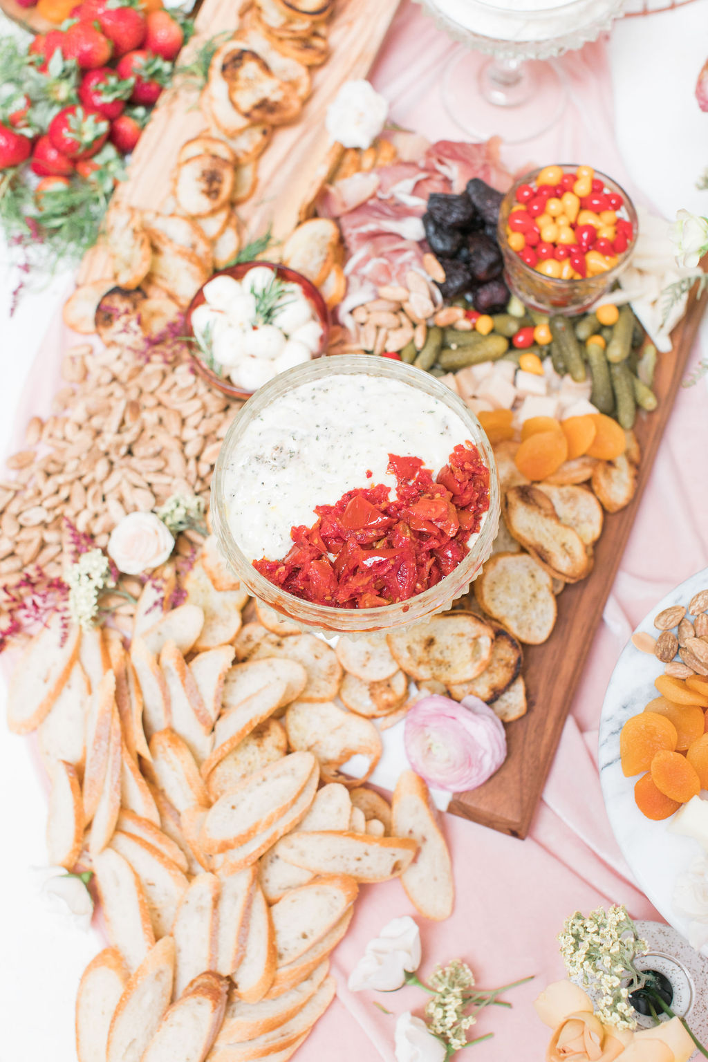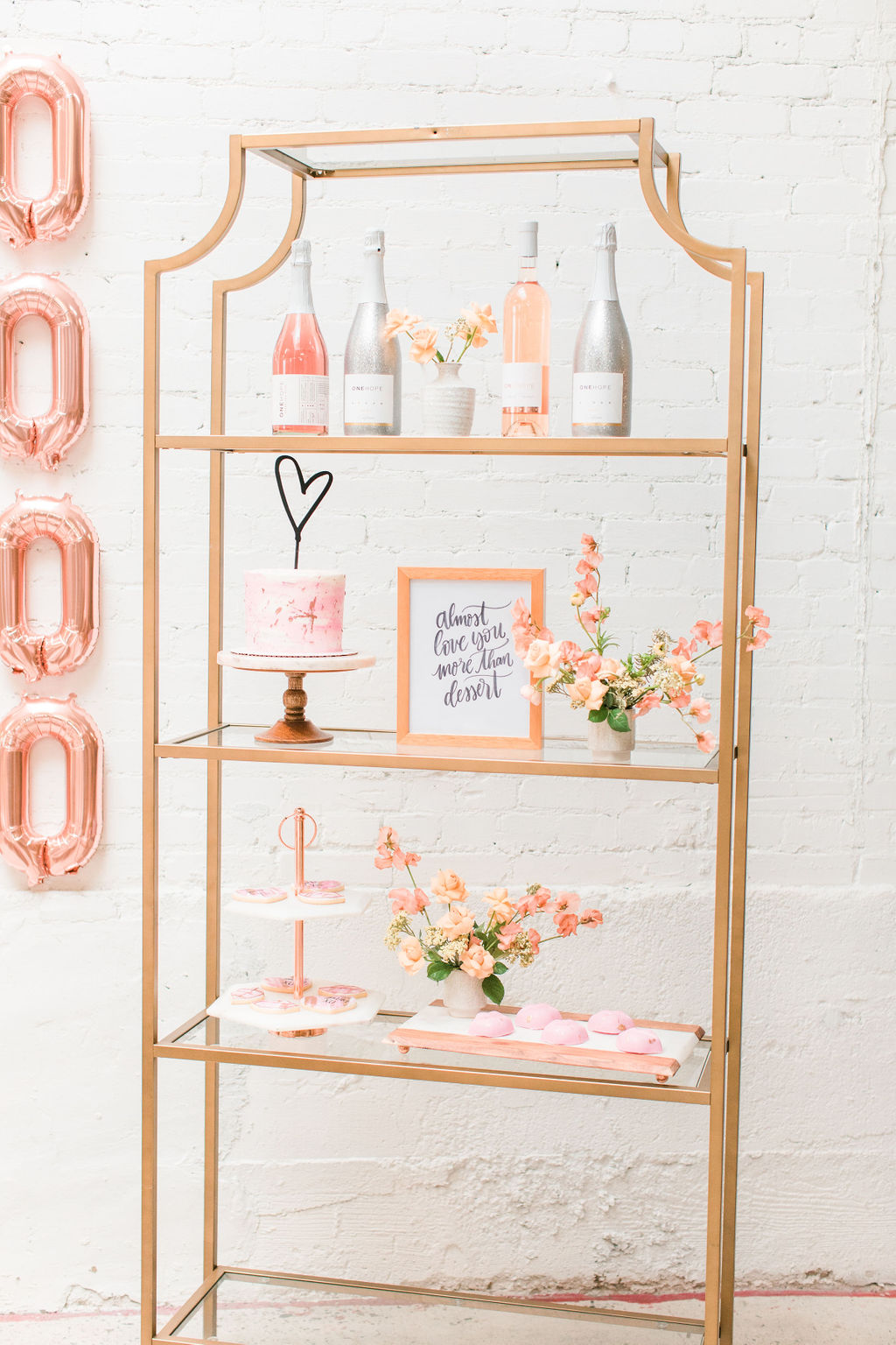 I can’t get enough of these flowers!!!!!Can we talk about these BALLOONS?!?! Our rose gold XO balloons from North Star Balloons stole the show and created the perfect backdrop!!  You could easily recreate this at home, and you have plenty of time so order these balloons here and go for it!  I love all my girls like XO so these really set the tone for the whole party!Holy cheese board heaven!!!  Colette’s Catering does it again!  They created this gorgeous spread and it wasn’t just yummy in our bellies but also incredible eye candy!!!  I love when the food is as pretty as the event itself!Every girl knows the way to our hearts are with desserts and champagne, so we had The Sweet Lemon Bakeshop create some yummy and fun desserts (how about that topper by Poppy Jack Shop?) and like I said, we got our champagne from the incredible One Hope.