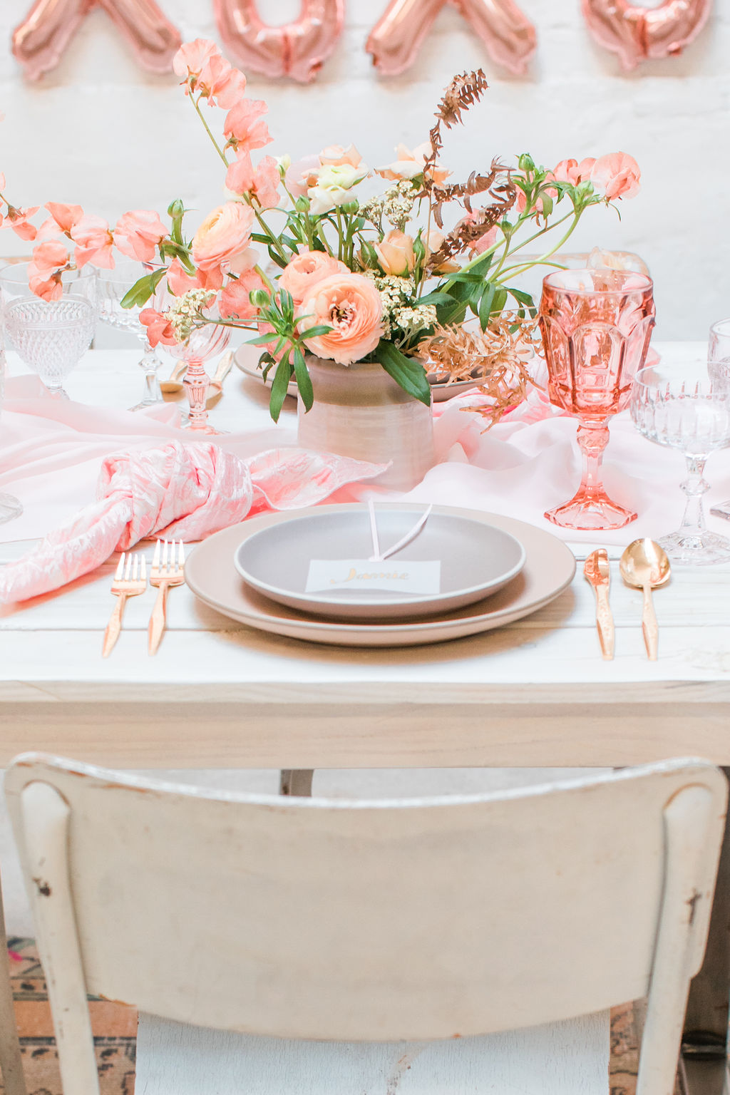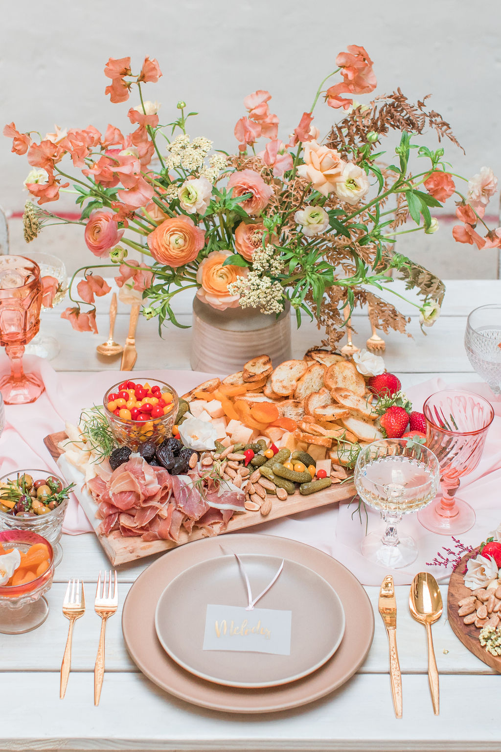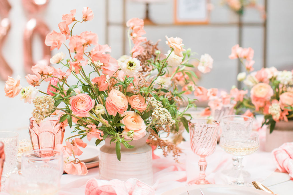 Next up is a pretty tablescape, which in my mind is #1, because you and your girls deserve it! Set the table with pretty pink plates & glassware and gold flatware, we got ours from Cherished Rentals. Next, you definitely need the most stunning floral arrangements, and our girl Alex from Third & Park didn’t disappoint! Of course you need an amazing set up – we love Sweet Salvage Rentals collection of gorgeous rugs, tables and chairs, her inventory is endless and amazing.  We added in some pretty details like Party Crush Studio’s gauzy runner and Hostess Haven’s pink napkins!