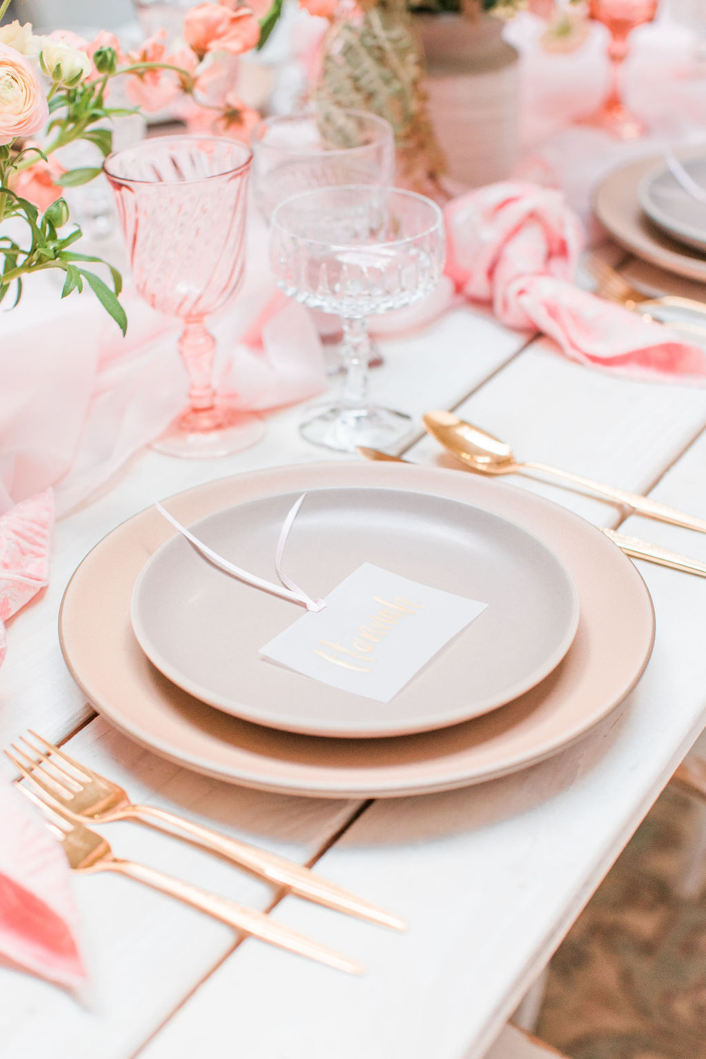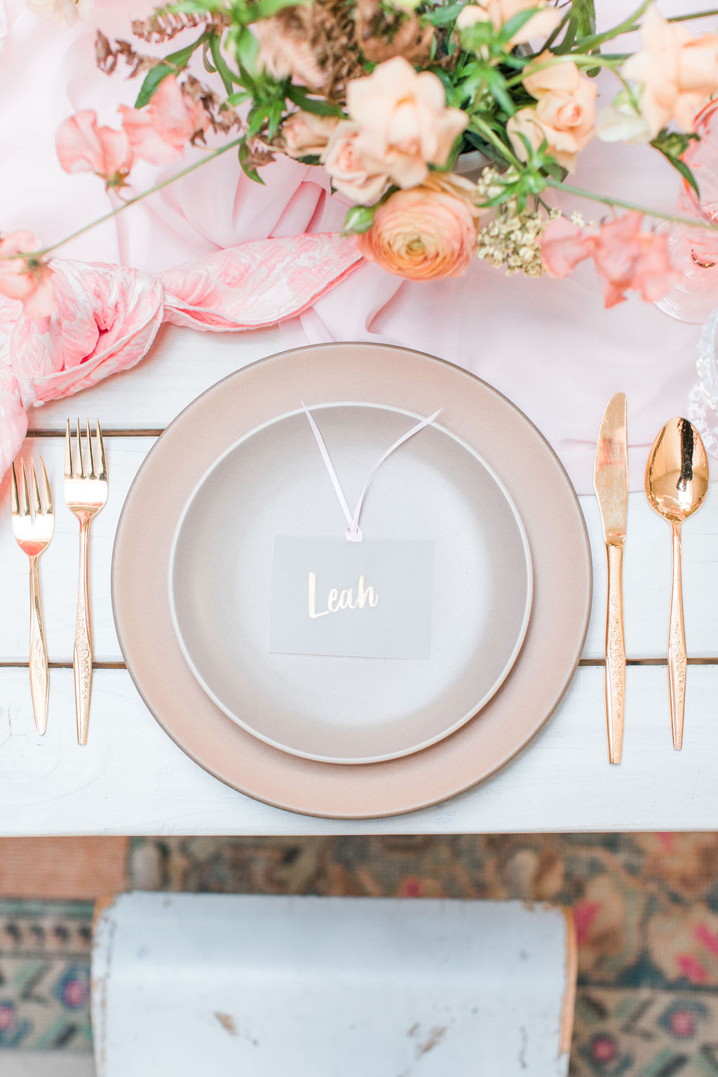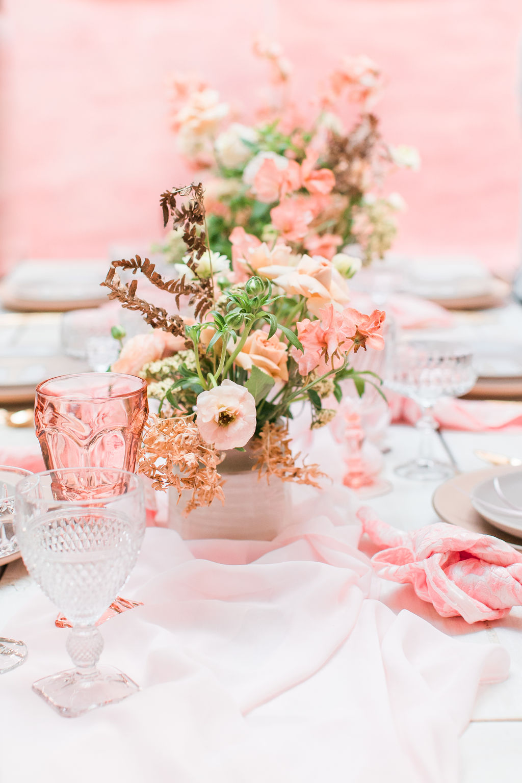 Next up is a pretty tablescape, which in my mind is #1, because you and your girls deserve it! Set the table with pretty pink plates & glassware and gold flatware, we got ours from Cherished Rentals. Next, you definitely need the most stunning floral arrangements, and our girl Alex from Third & Park didn’t disappoint! Of course you need an amazing set up – we love Sweet Salvage Rentals collection of gorgeous rugs, tables and chairs, her inventory is endless and amazing.  We added in some pretty details like Party Crush Studio’s gauzy runner and Hostess Haven’s pink napkins!