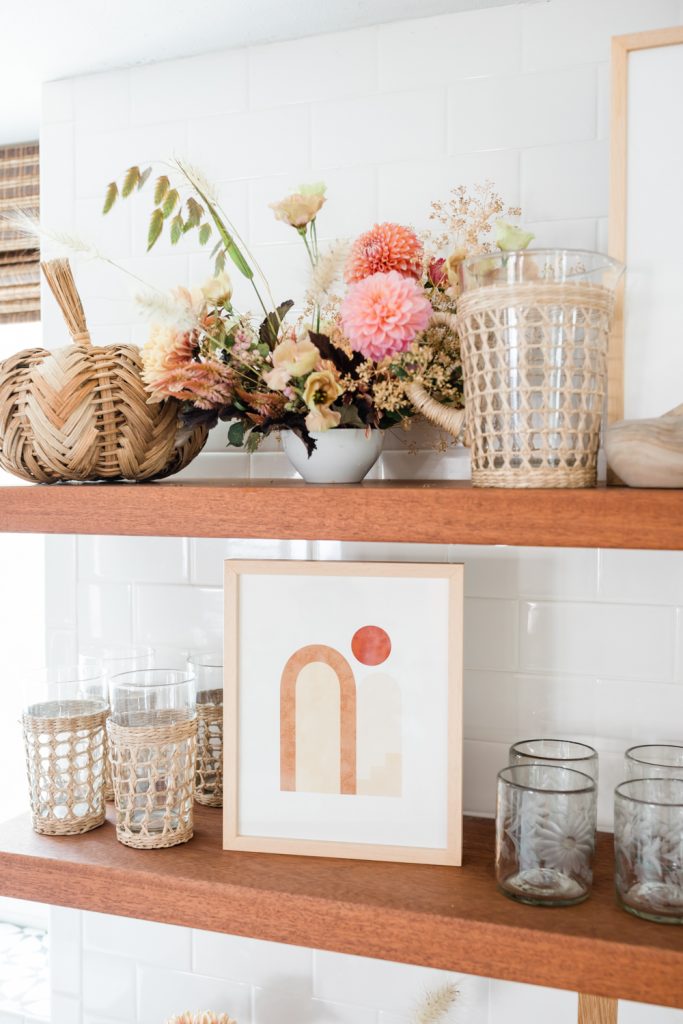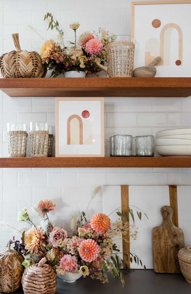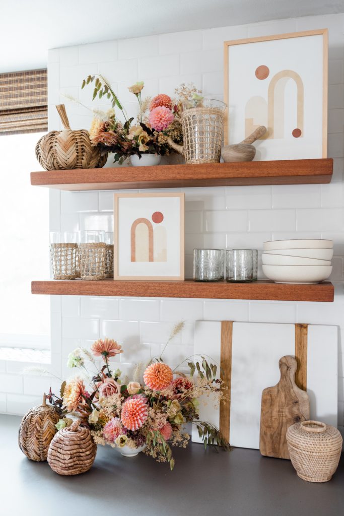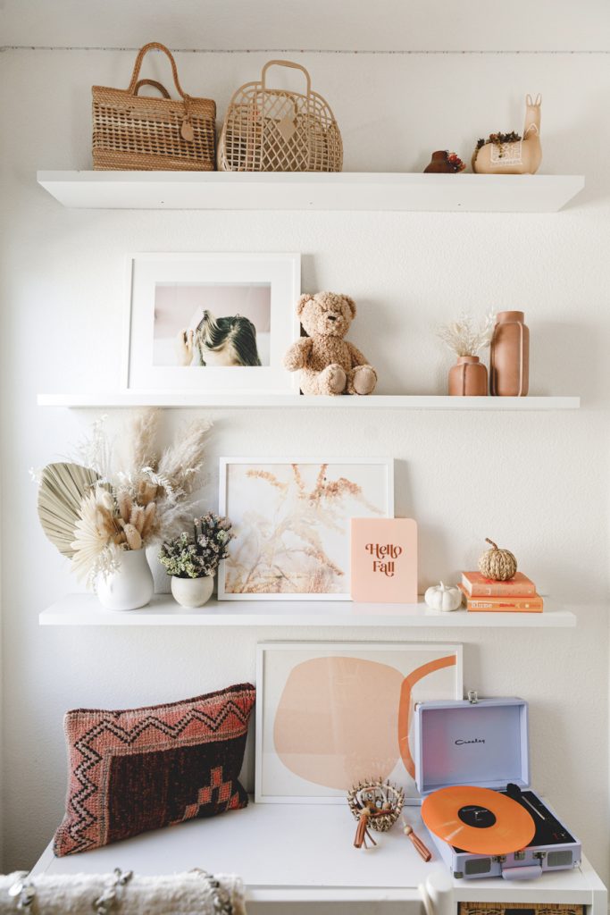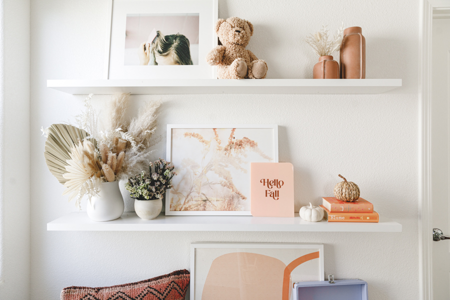 Fall is my favorite time of the year! The crisp wind is flowing through, soups are back, and we are switching out our summer decor for something a bit warmer colored. Dylan’s shelves have seen so many seasons, and she loves it. She will always ask, “What are going to do with my shelves for fall/Halloween/holidays/etc.”. So it’s now become a fun tradition to sit down together and pick out some new prints, and I loved what we came up with. Right away, we both loved the Poppy Joy art print, with pretty drawn poppies and that burnt orange color. It just screams fall! Then we kept with the warm colors of orange and gold with the Autumn breath IV and Organics_9_2_A. Any good seasonal shelf wouldn’t be complete without some Proper Letter decor like this cute Hello Fall acrylic sign. Lastly, add in some rattan and ceramic pumpkins for that true fall feel. Oh, and let’s not forget the floors. I’m really loving using dried flowers; lately, they last forever! Some look so fresh and pretty, like these preserved rice flowers from The Blaithin Blair Shop.