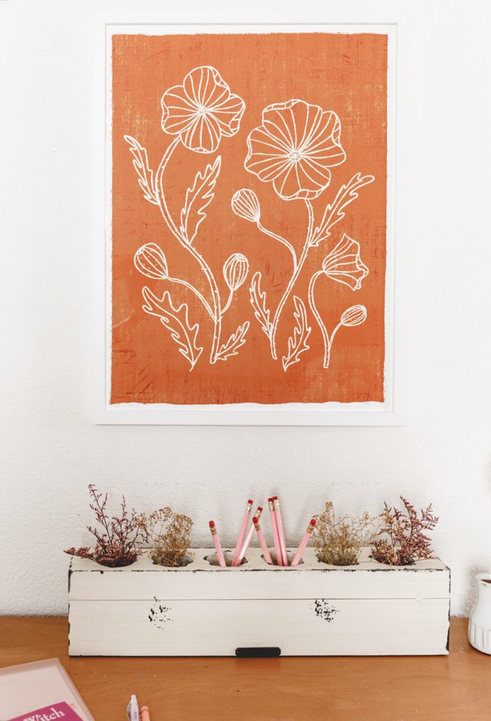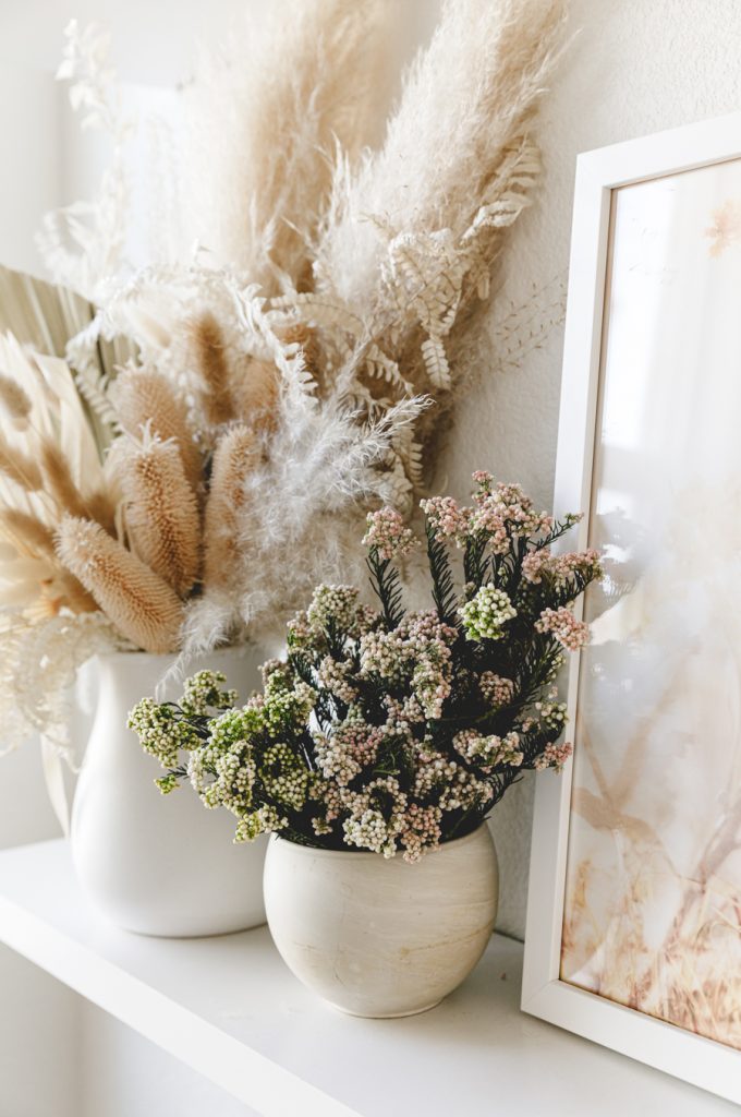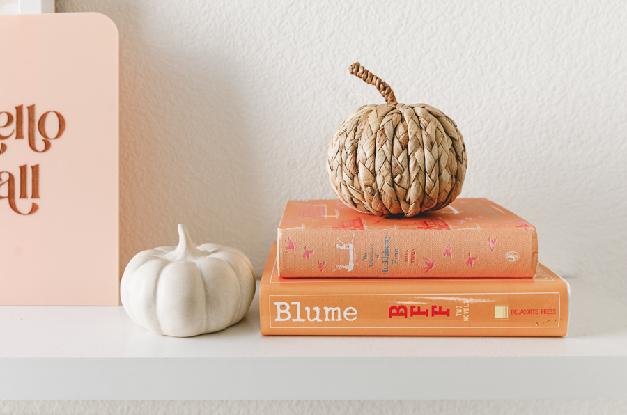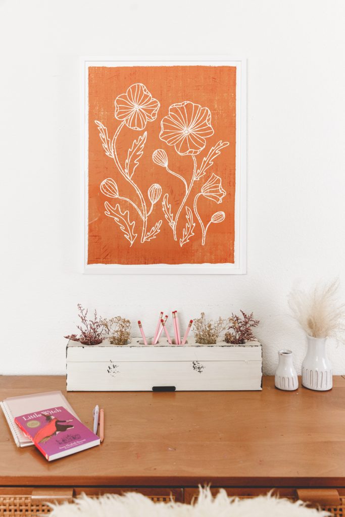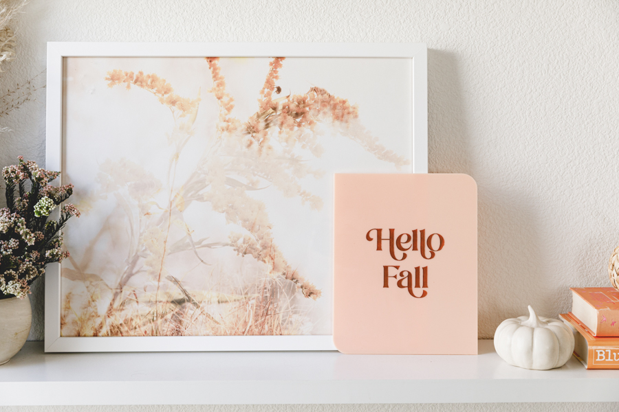 Fall is my favorite time of the year! The crisp wind is flowing through, soups are back, and we are switching out our summer decor for something a bit warmer colored. Dylan’s shelves have seen so many seasons, and she loves it. She will always ask, “What are going to do with my shelves for fall/Halloween/holidays/etc.”. So it’s now become a fun tradition to sit down together and pick out some new prints, and I loved what we came up with. Right away, we both loved the Poppy Joy art print, with pretty drawn poppies and that burnt orange color. It just screams fall! Then we kept with the warm colors of orange and gold with the Autumn breath IV and Organics_9_2_A. Any good seasonal shelf wouldn’t be complete without some Proper Letter decor like this cute Hello Fall acrylic sign. Lastly, add in some rattan and ceramic pumpkins for that true fall feel. Oh, and let’s not forget the floors. I’m really loving using dried flowers; lately, they last forever! Some look so fresh and pretty, like these preserved rice flowers from The Blaithin Blair Shop.