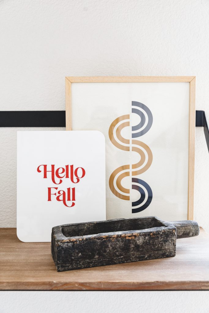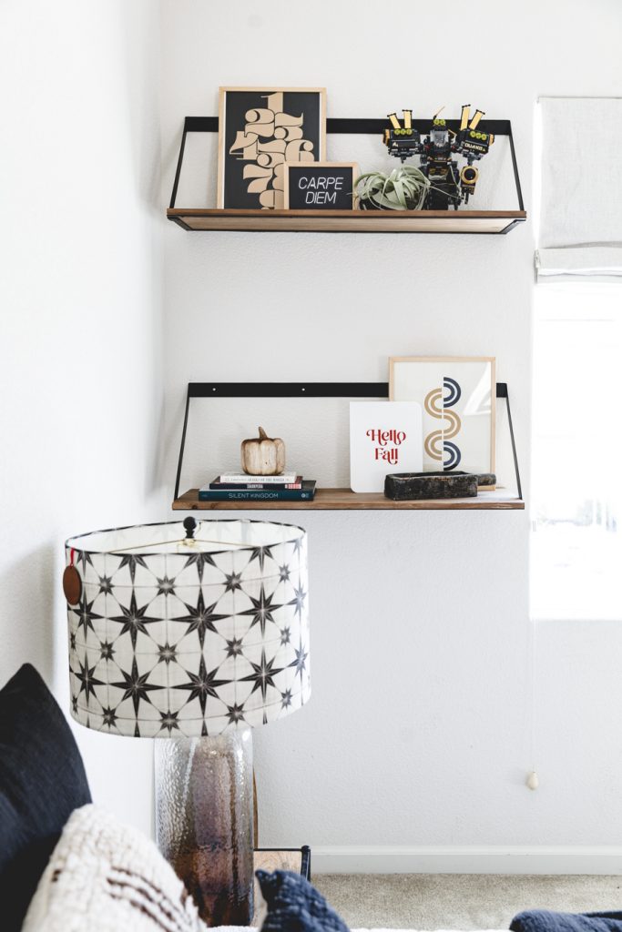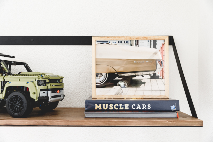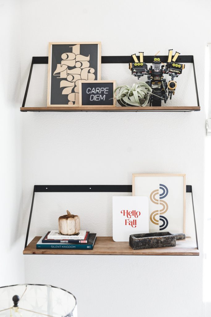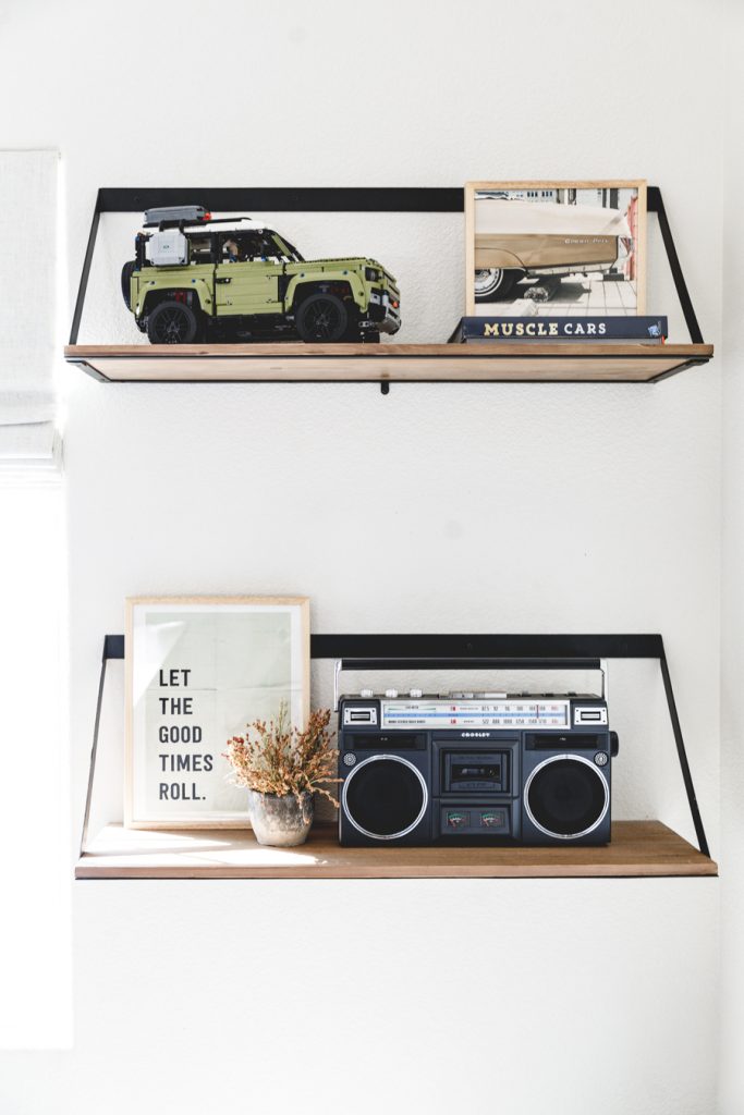 When choosing art for Jett’s shelves, we went with darker muted colors to tie in with what he already has on his bookcases. The 1st one we picked out was the Path art print that brings in some abstract mid-century vibe. A fun neutral neon-inspired Carpe Diem was added for some daily motivation to seize each day! This goes great with the Let the Good Times Roll Art Print that sits behind his Crosley Boombox. Which, by the way, records songs off the radio with a tape cassette. You remember those days, right?!? Finally, I added some more neutral tones with this cool Memphis Art Print. He is a big car guy right now, so this shelf was a perfect home for that cool car print. Added in some wooden pumpkins for that fall feel, and I kept up some of his legos he built that had those fall colors we love so much! Lastly, Proper Letter’s Fall Sign that we love so much!