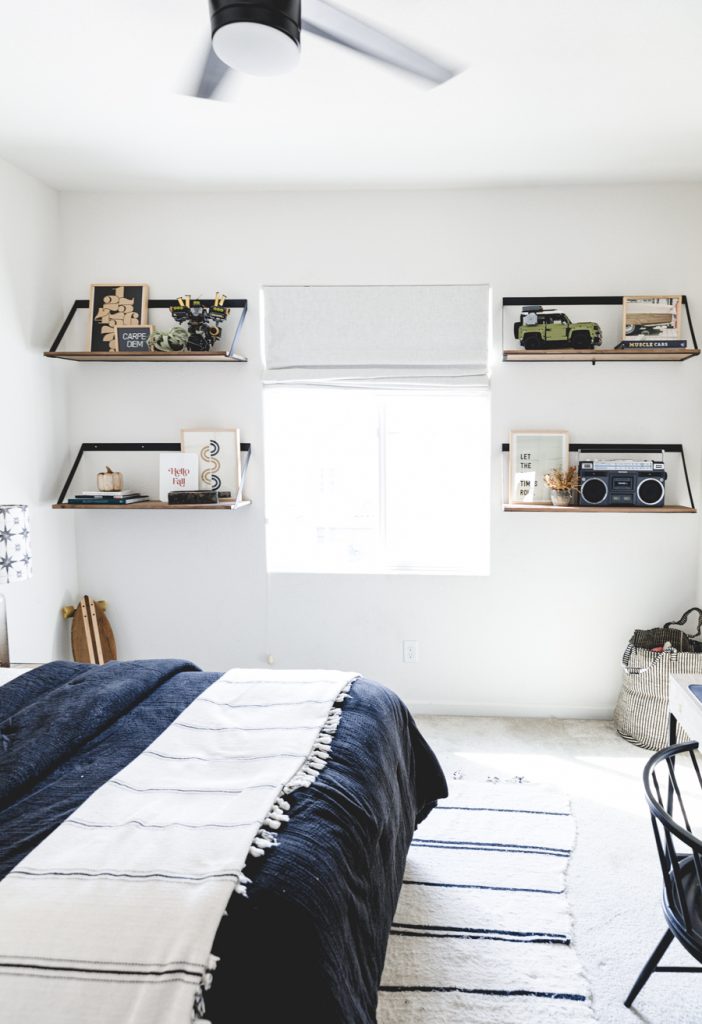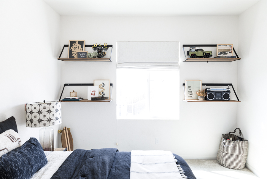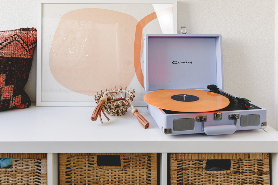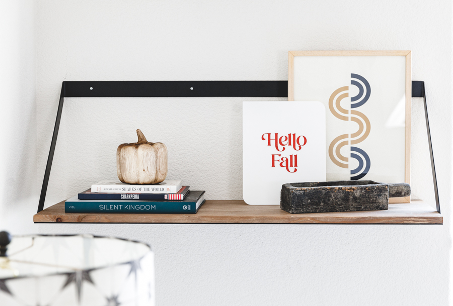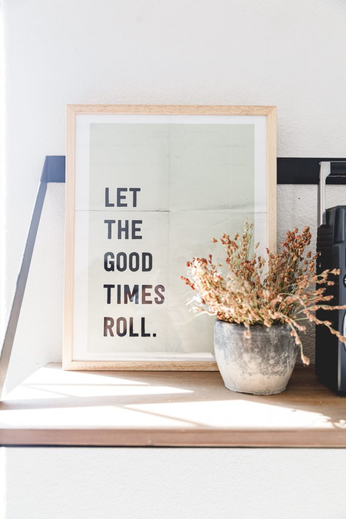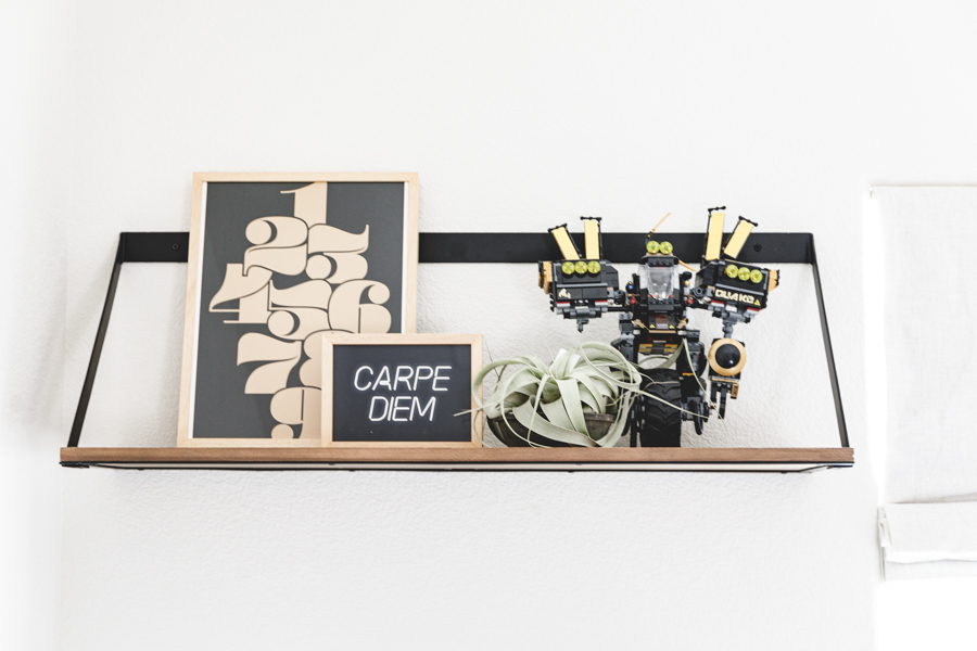 When choosing art for Jett’s shelves, we went with darker muted colors to tie in with what he already has on his bookcases. The 1st one we picked out was the Path art print that brings in some abstract mid-century vibe. A fun neutral neon-inspired Carpe Diem was added for some daily motivation to seize each day! This goes great with the Let the Good Times Roll Art Print that sits behind his Crosley Boombox. Which, by the way, records songs off the radio with a tape cassette. You remember those days, right?!? Finally, I added some more neutral tones with this cool Memphis Art Print. He is a big car guy right now, so this shelf was a perfect home for that cool car print. Added in some wooden pumpkins for that fall feel, and I kept up some of his legos he built that had those fall colors we love so much! Lastly, Proper Letter’s Fall Sign that we love so much!