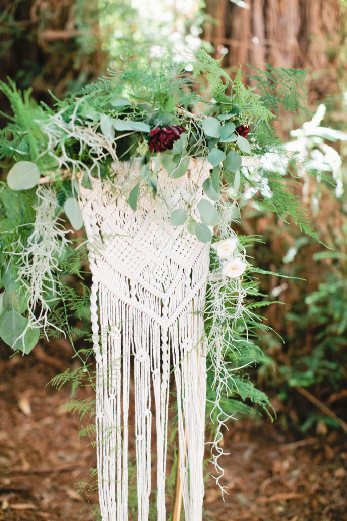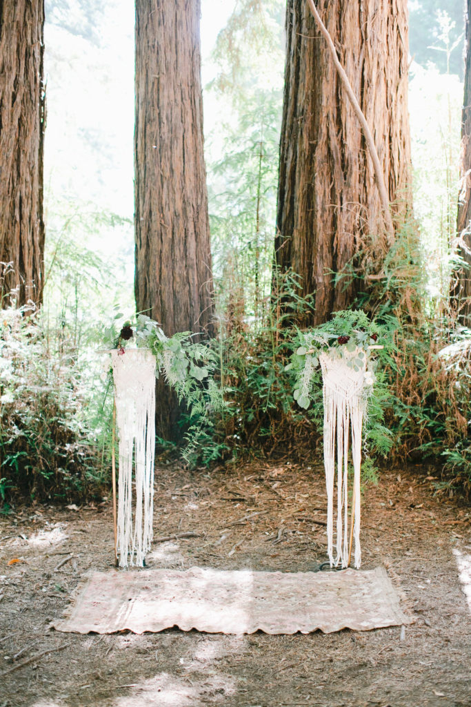 Let’s start with this sweet ceremony setup… we kept it simple with a couple vintage rugs and a macrame backdrop. You were surrounded by tall beautiful redwood trees and we wanted to let nature speak for itself.