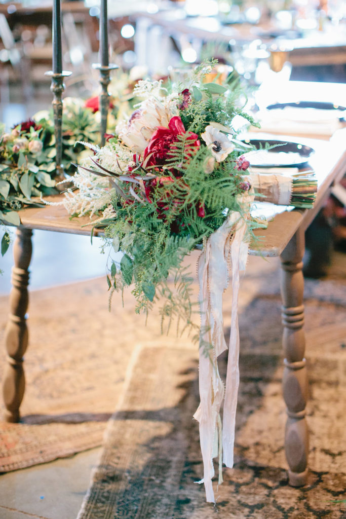A moody sweetheart table with moody jewel tone florals, brass candlesticks, vintage glassware, and vintage rugs from Cultivate Rentals to complete the look.
