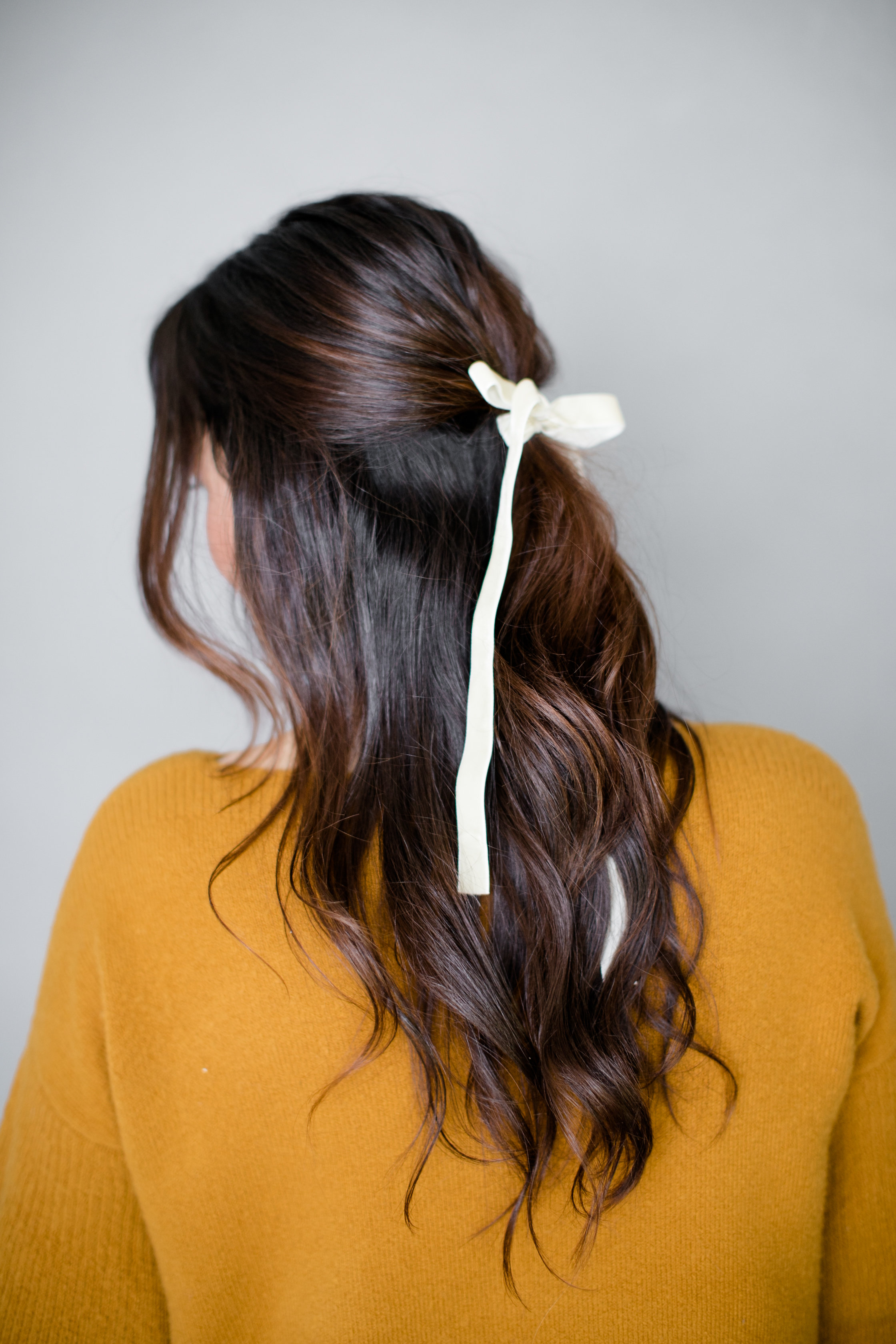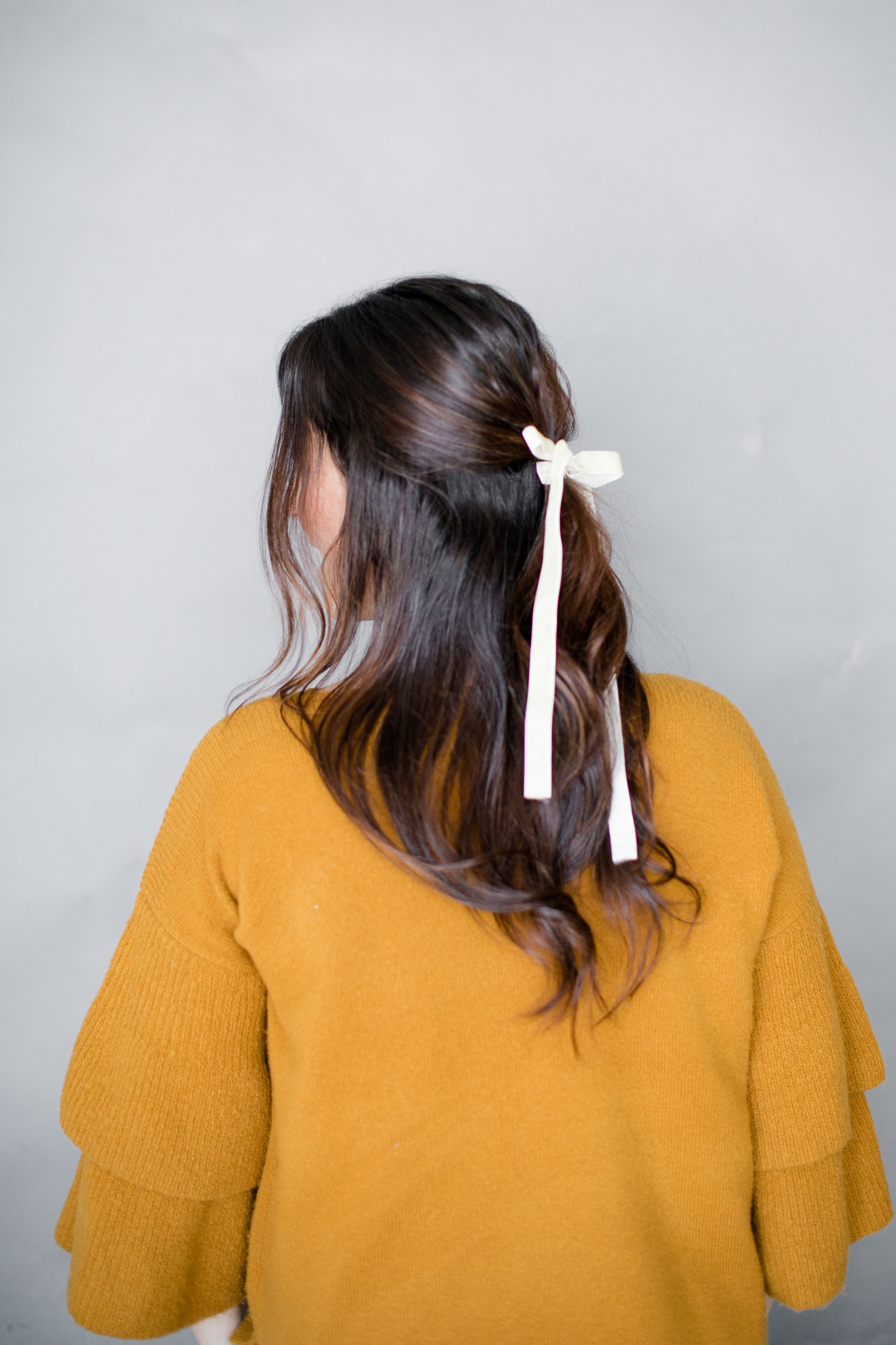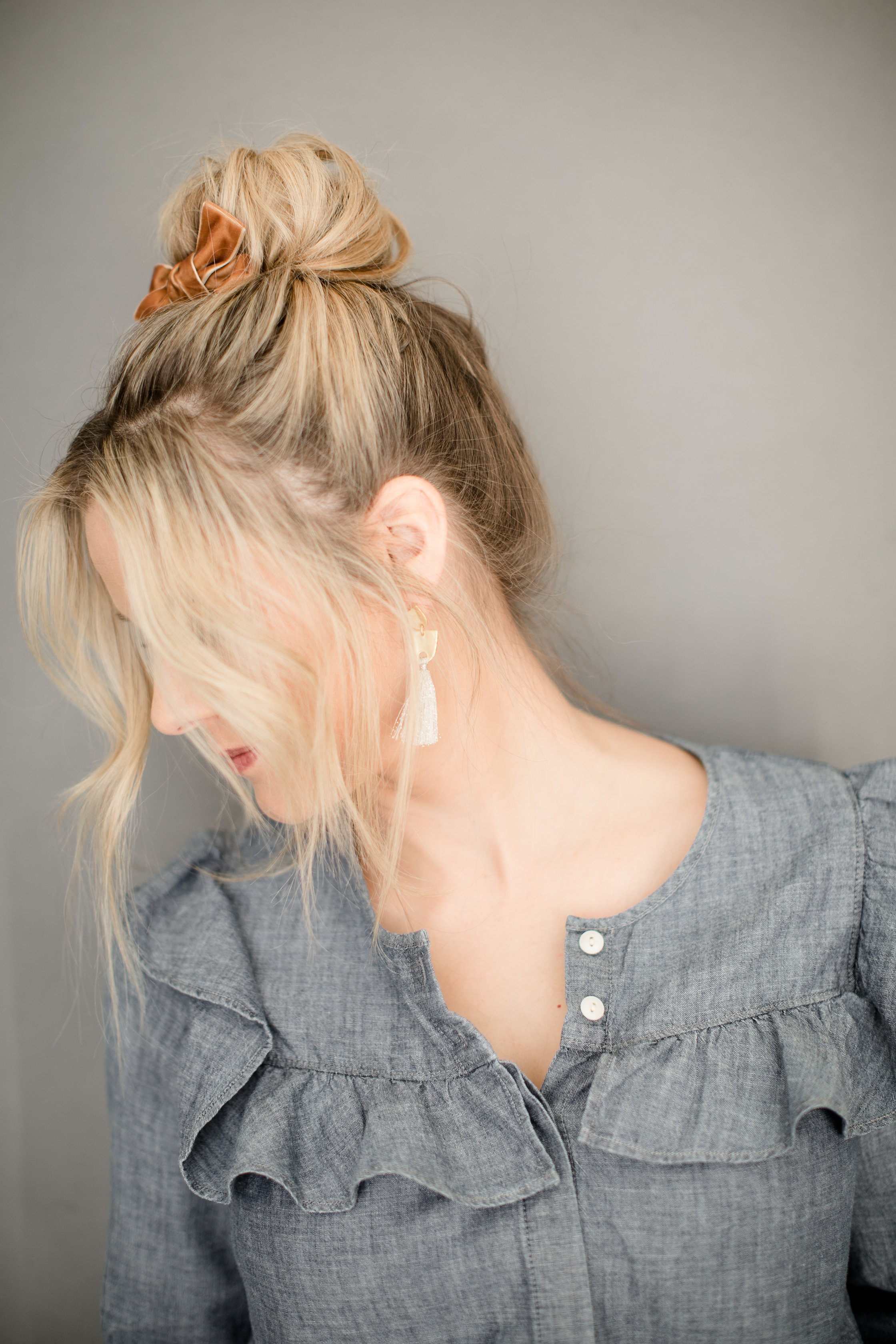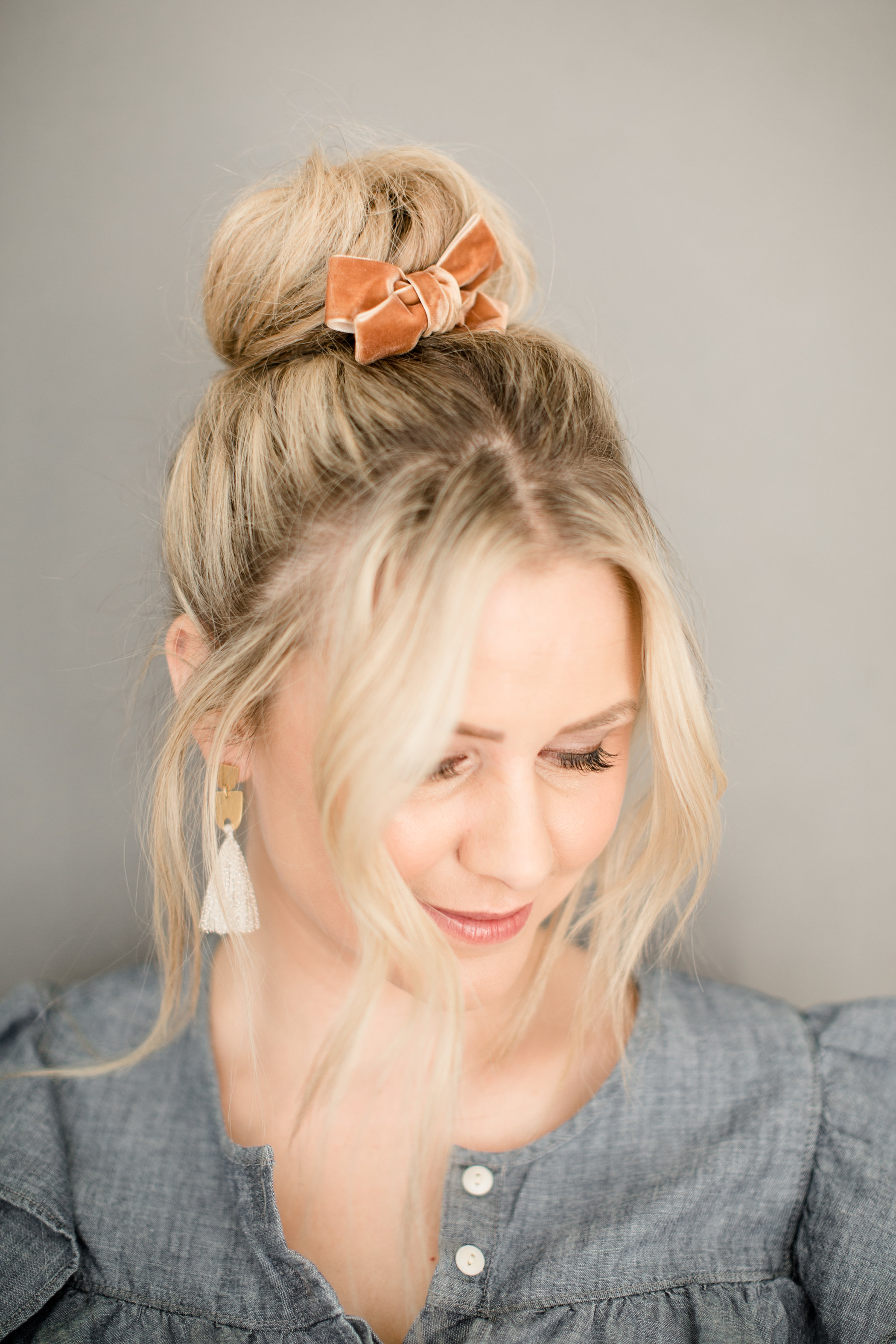 “Don’t be afraid to have a messy bun, since you’re placing a pretty bow along side it. I think a little imperfection makes it perfection”