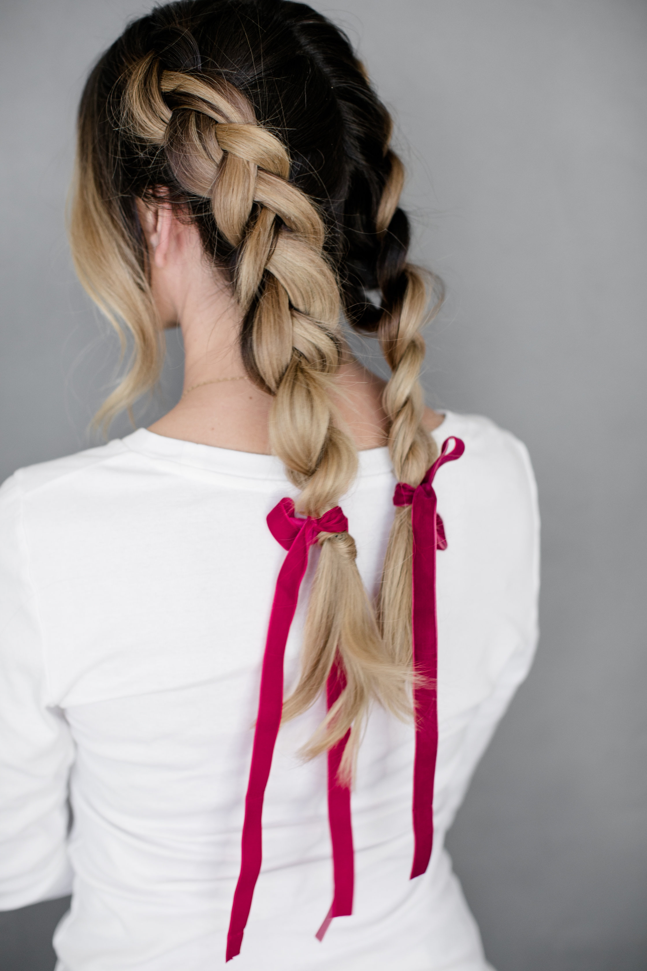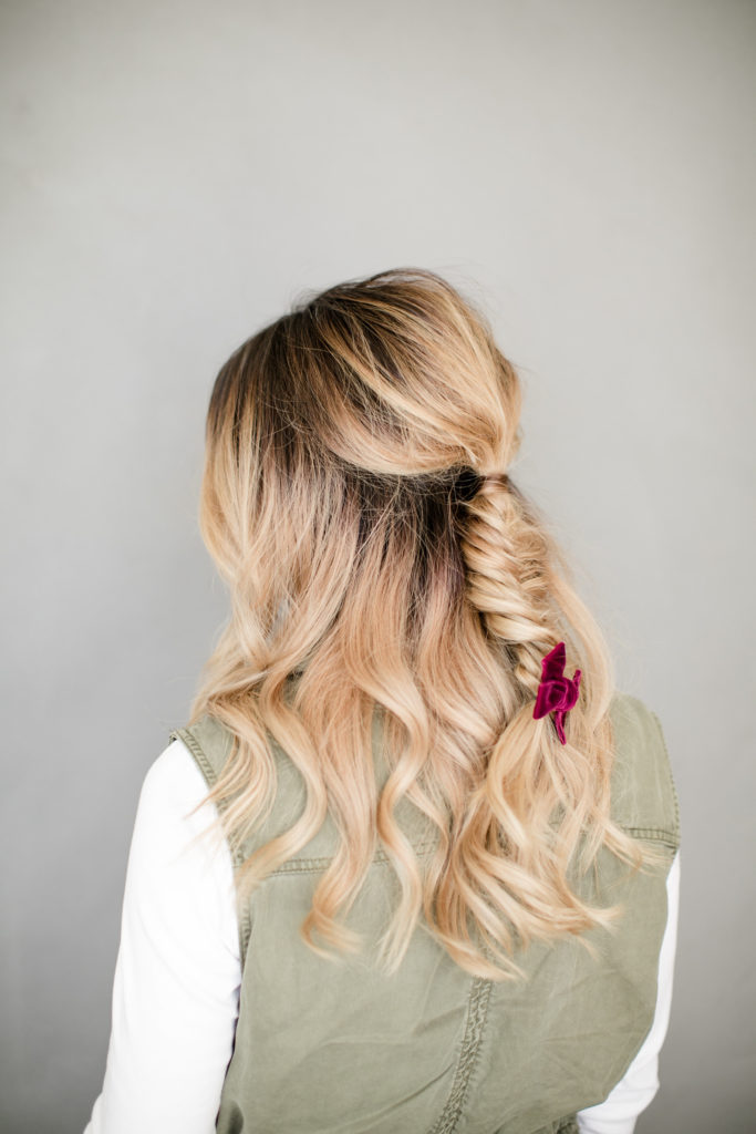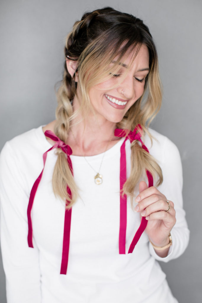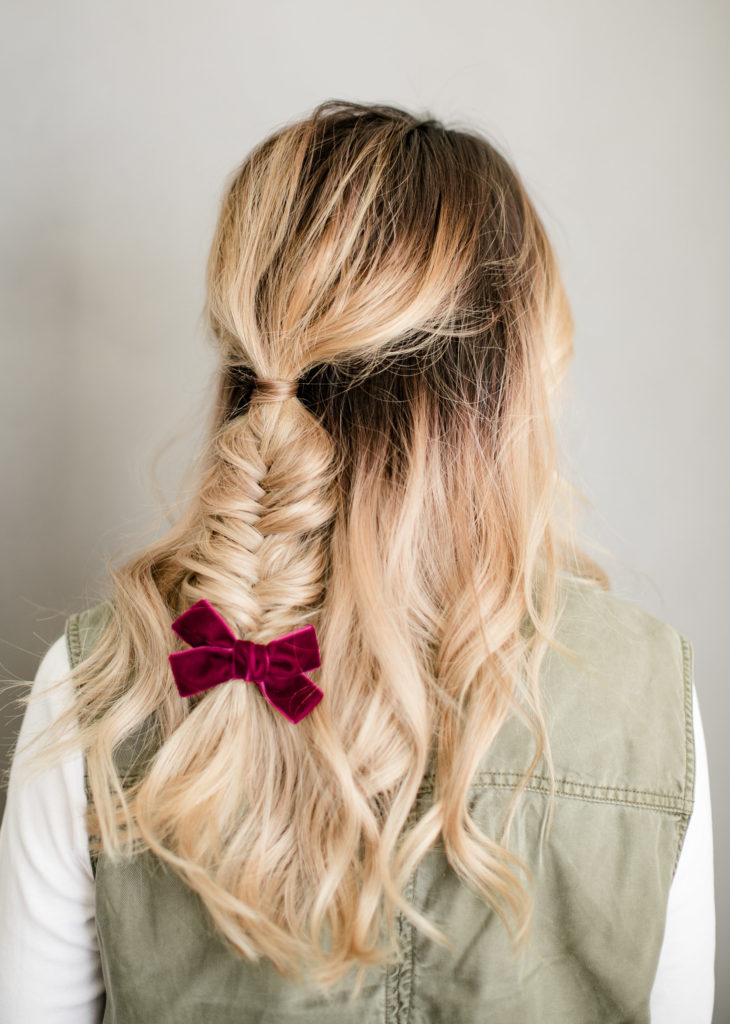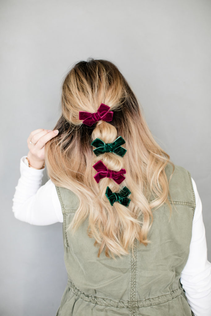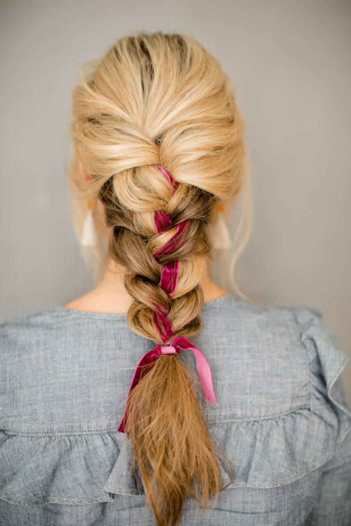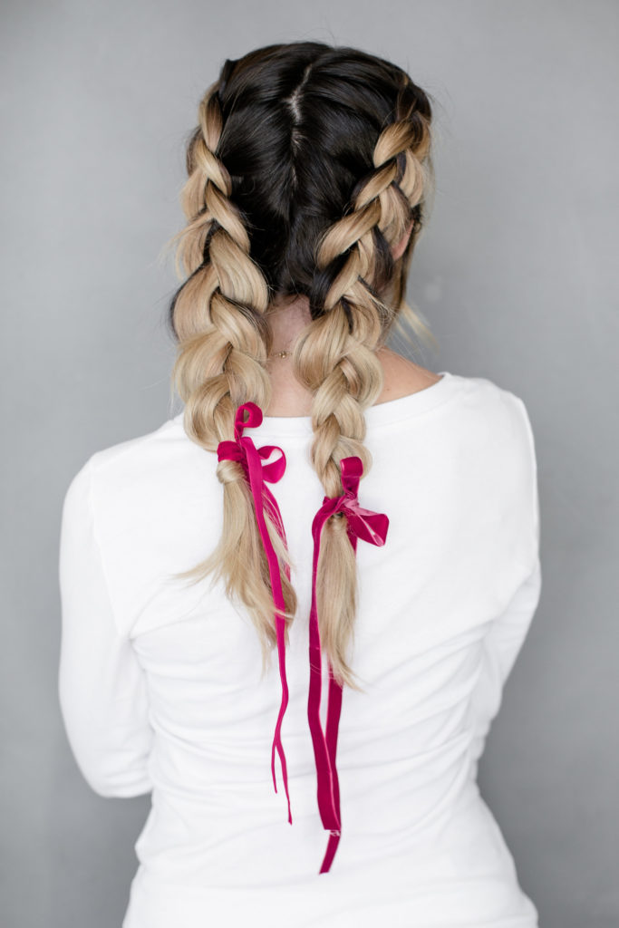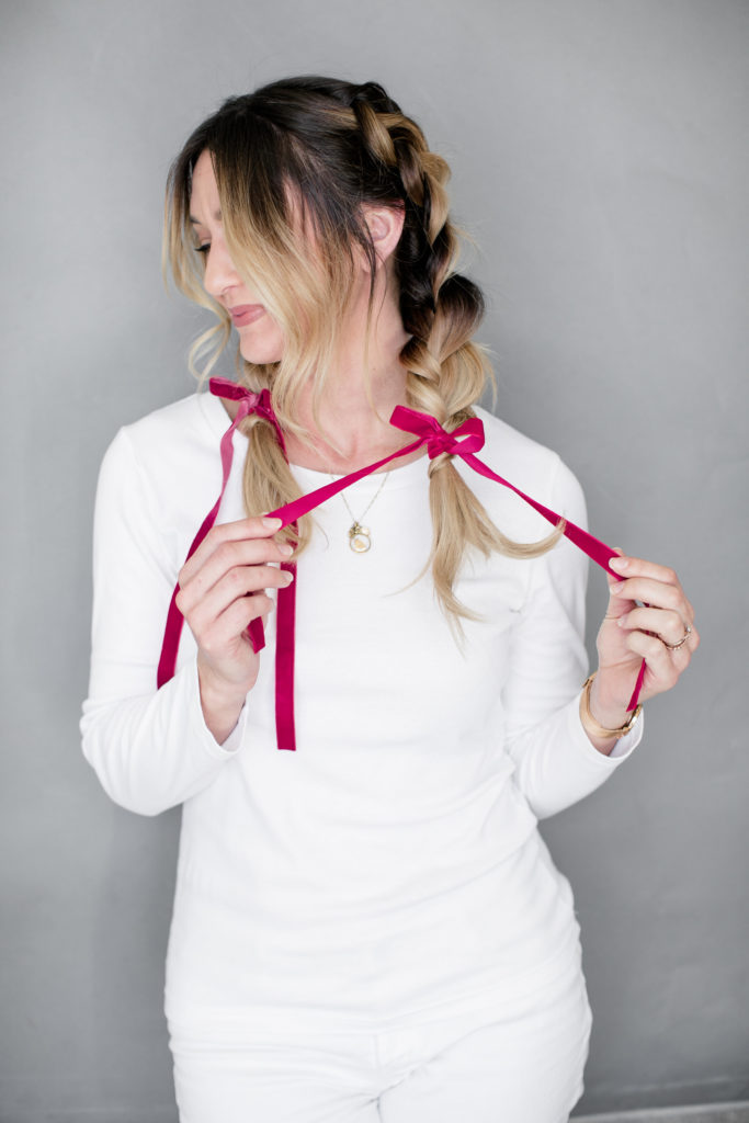 Last braided looks is this cute pig tail braid secured with some long ribbon. Sort of nostalgic to me and totally works for a holiday party! Such a fun way to dress up a playful hairstyle and give it a a fun detail…