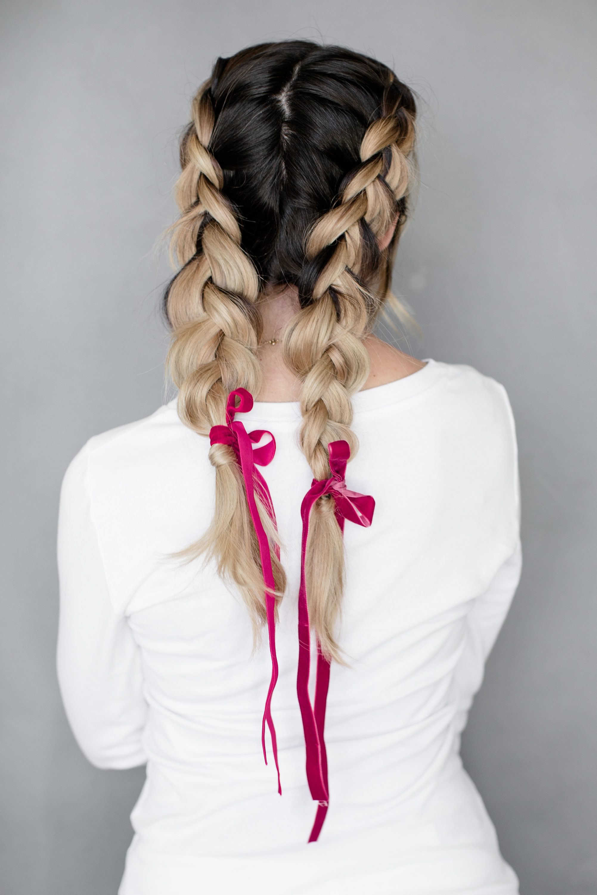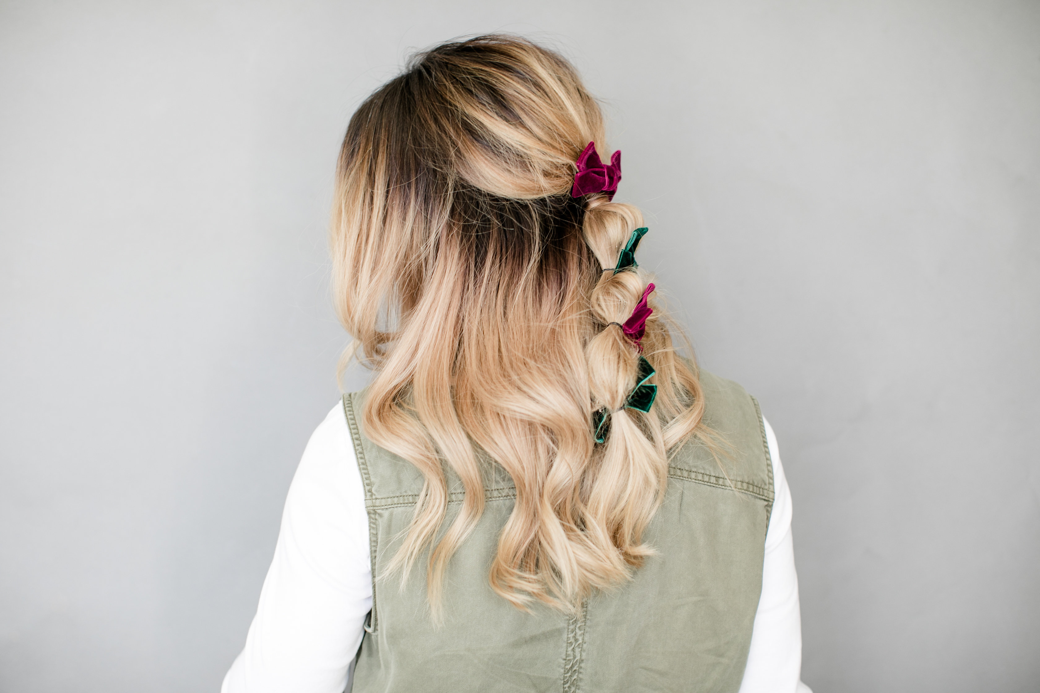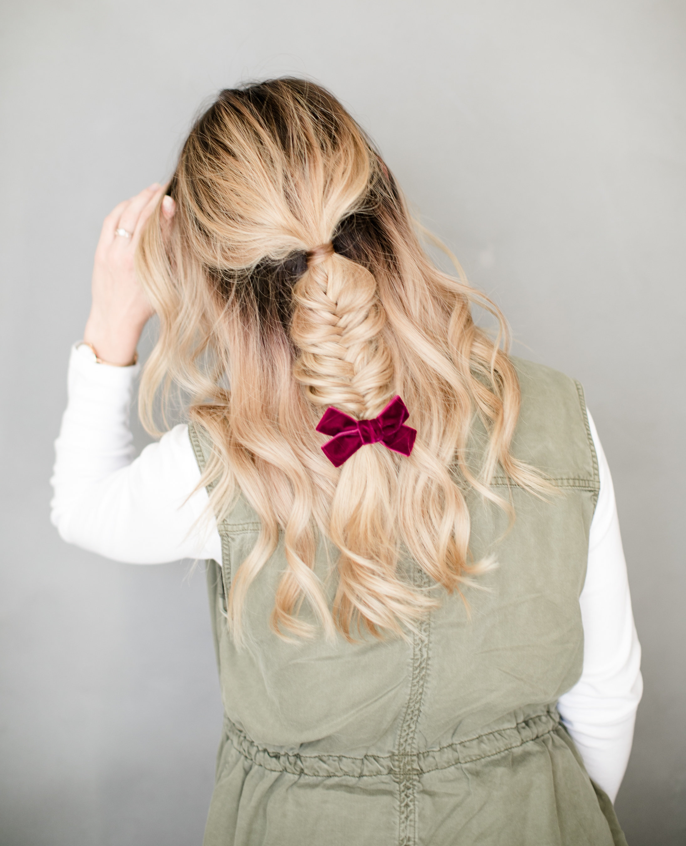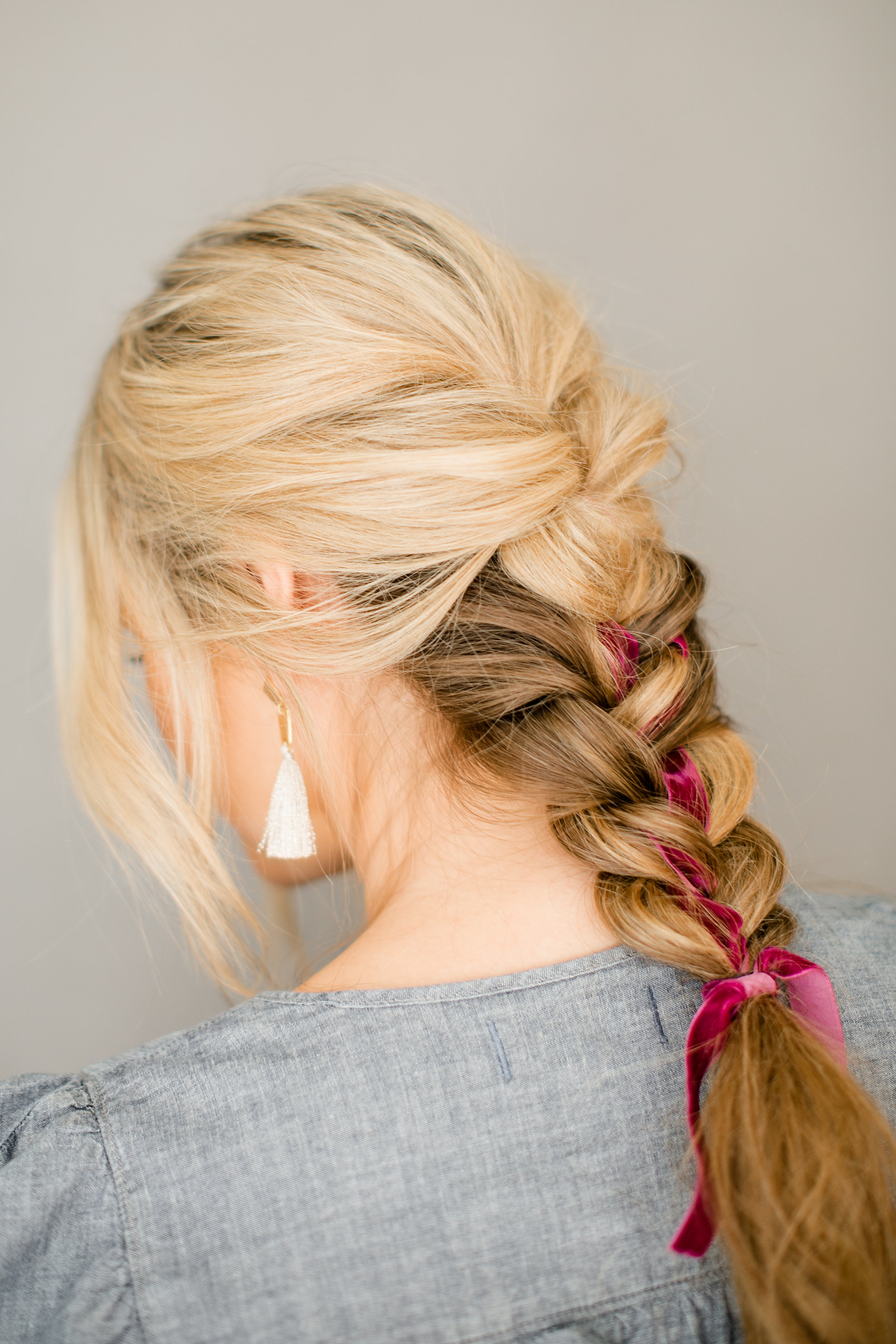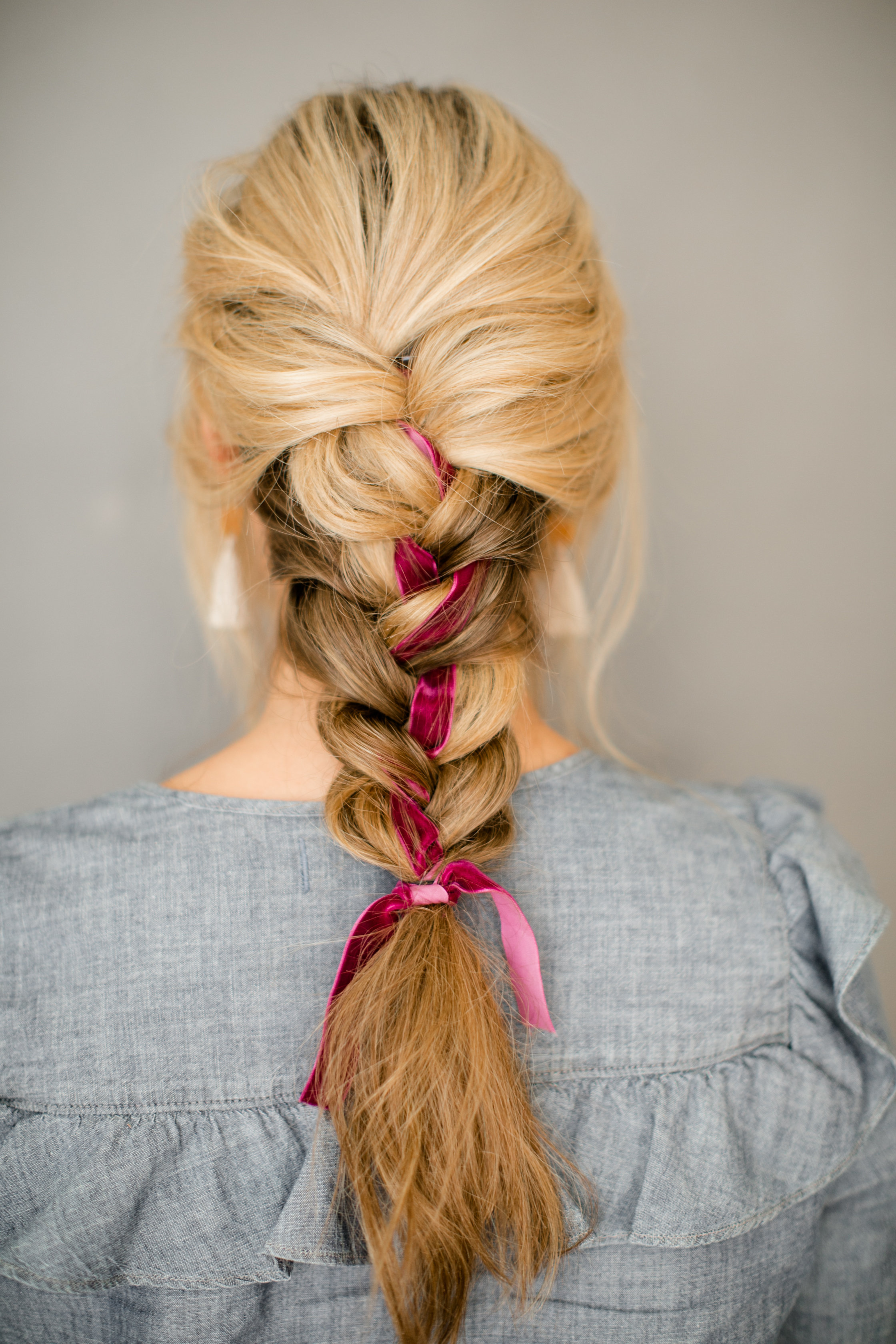 We used a couple of long velvet ribbons as well to mix it up a bit! Erica infused this long ribbon into a classic French braid, and it’s a game changer! Here’s some more advice from the hair guru…
