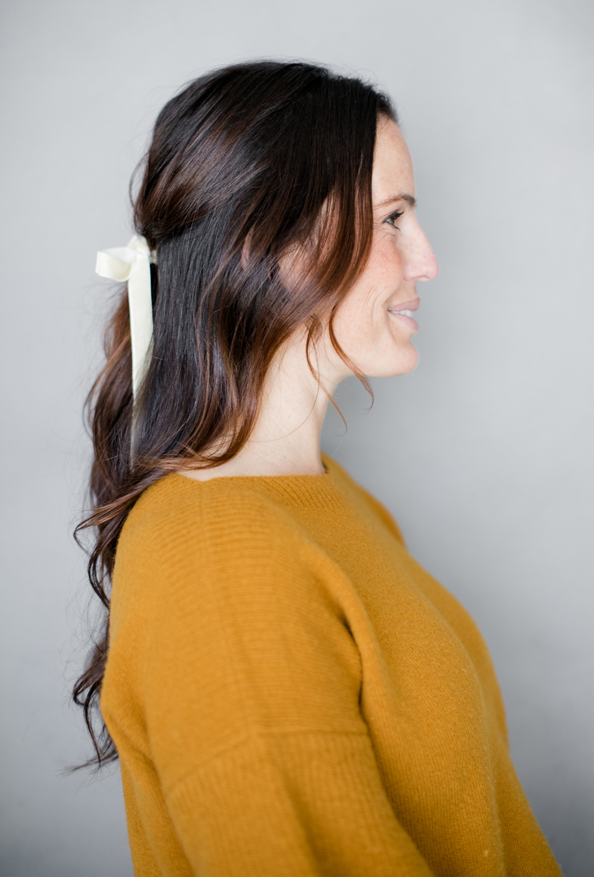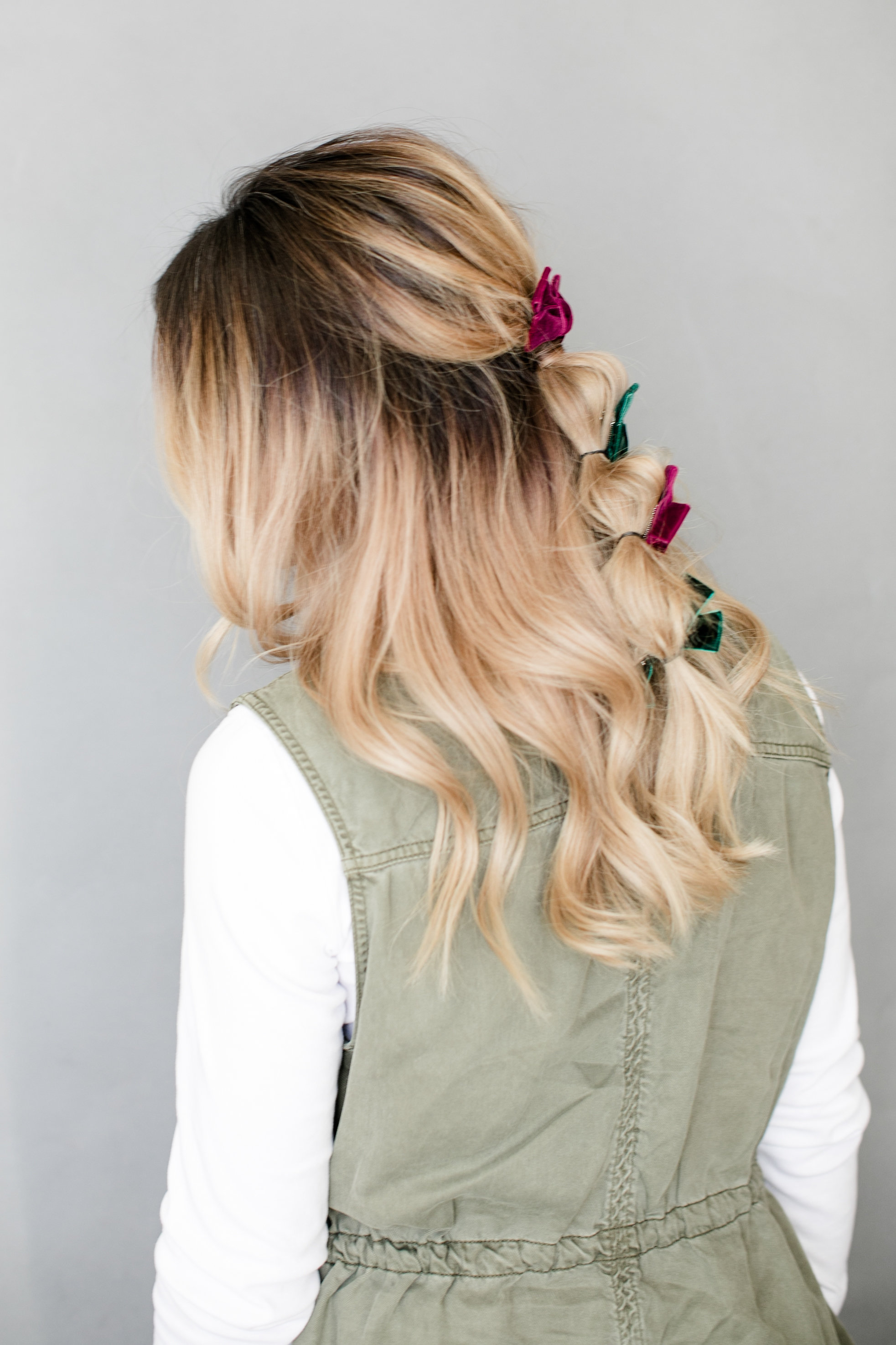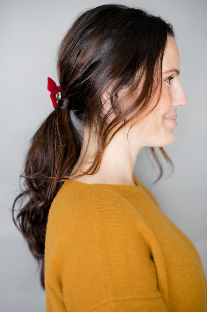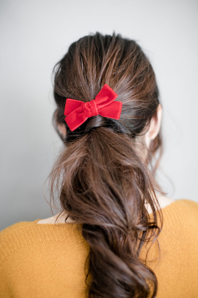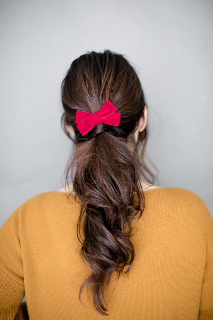 Next up is yours truly with a simple ponytail that gets dressed up with a bow too! It’s so amazing what a little bow can do to a hairstyle. Another tip from Erica…