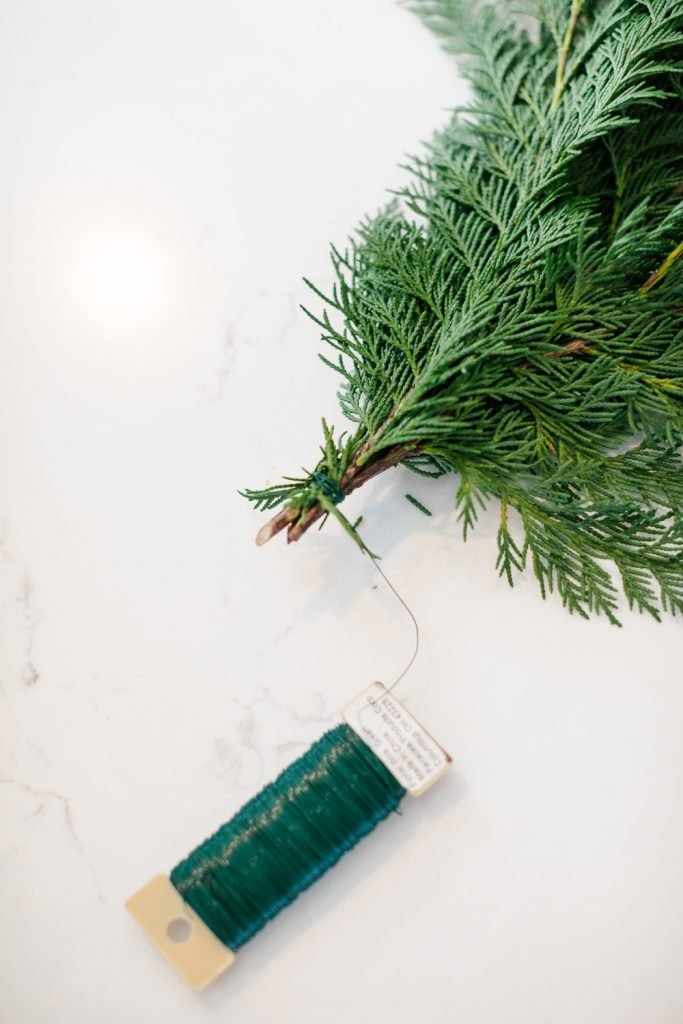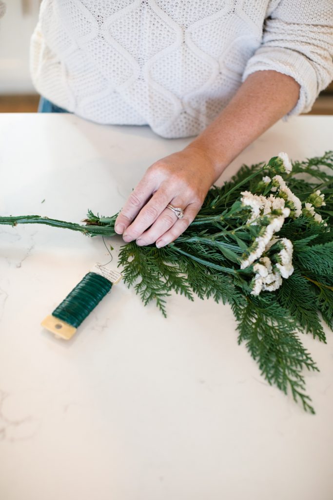Bundle greenery, dried berries, and statice together and wire at top of bundle to hold in place.