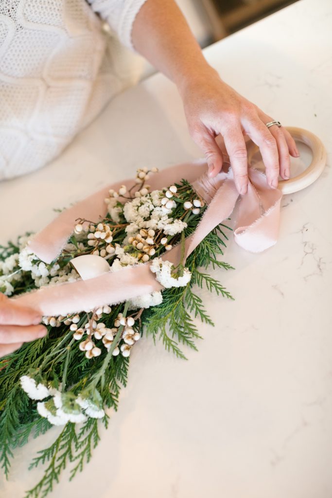 Wrap ribbon around top of bundle to conceal wire and hoop and tie a bow.