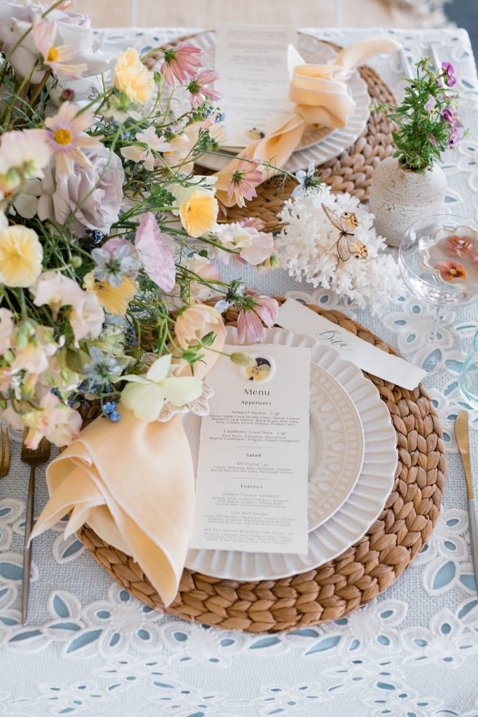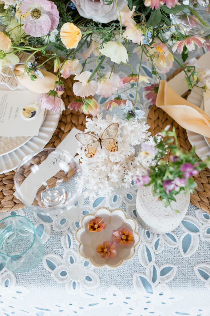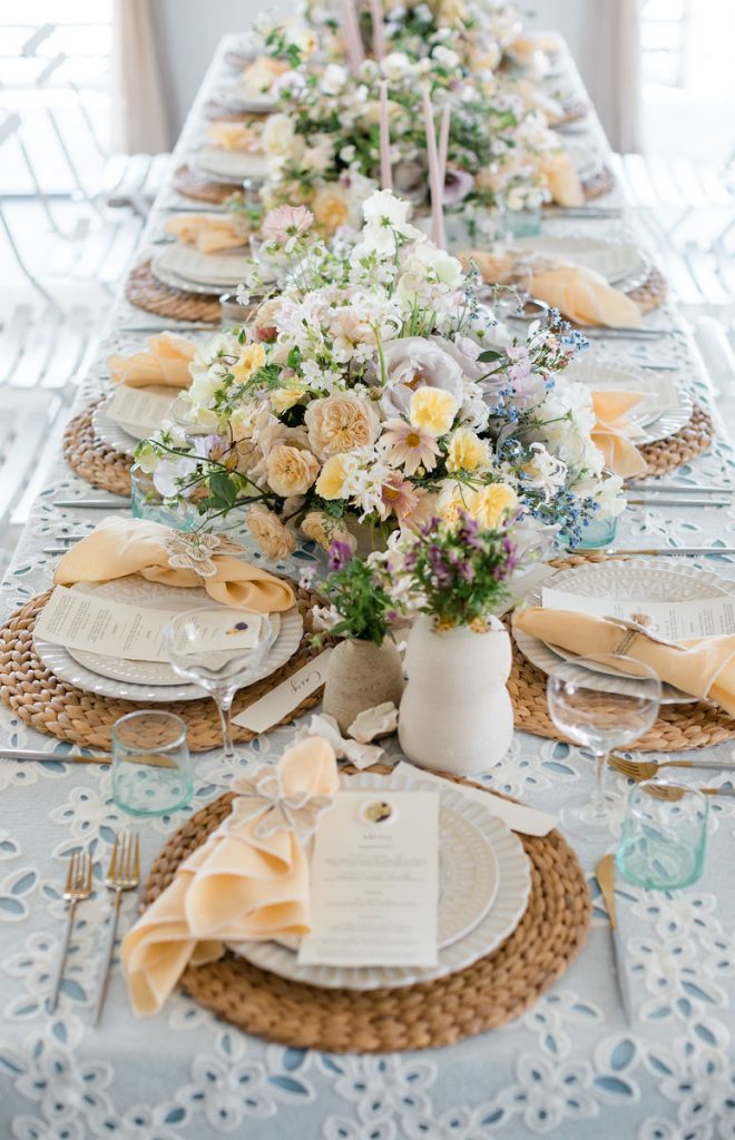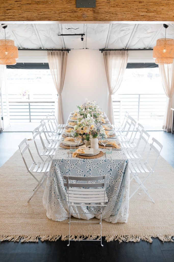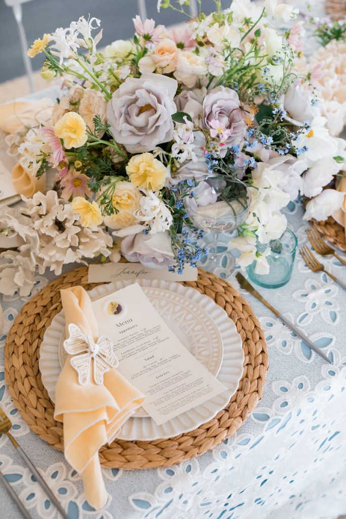 Where do I start with this table?! There are SO many stunning elements. First, we layered linens from La Tavola using a pale blue and eyelet lace tablecloth to create that beautiful look. We then used tabletop rentals from Hostess Haven for each place setting. The chargers, plates, flatware, and glassware all looked so beautiful together. Each piece was elegant and unique, but together really worked so well!