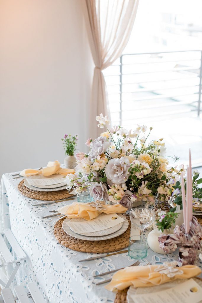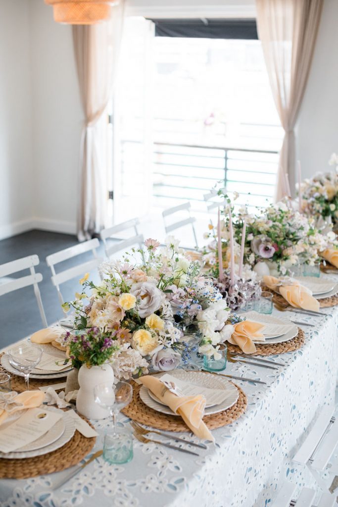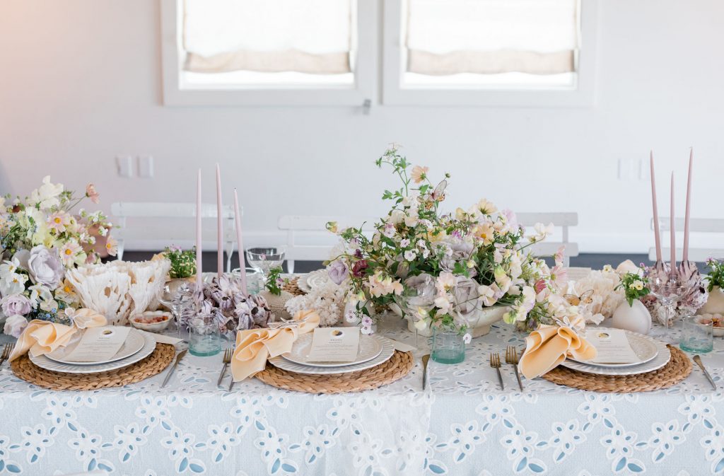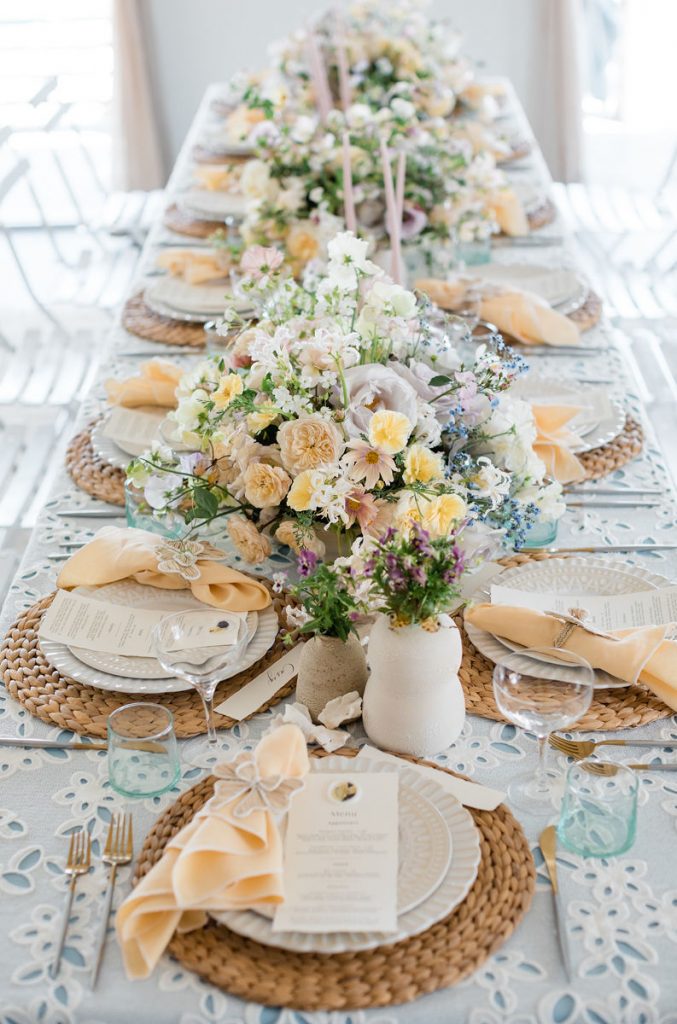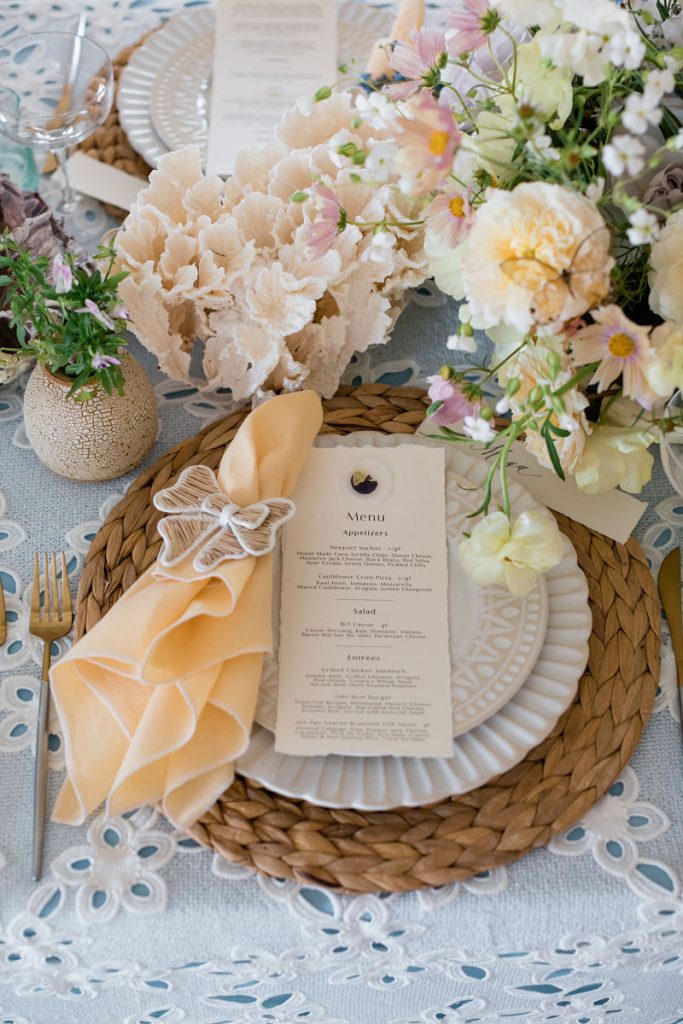 Where do I start with this table?! There are SO many stunning elements. First, we layered linens from La Tavola using a pale blue and eyelet lace tablecloth to create that beautiful look. We then used tabletop rentals from Hostess Haven for each place setting. The chargers, plates, flatware, and glassware all looked so beautiful together. Each piece was elegant and unique, but together really worked so well!