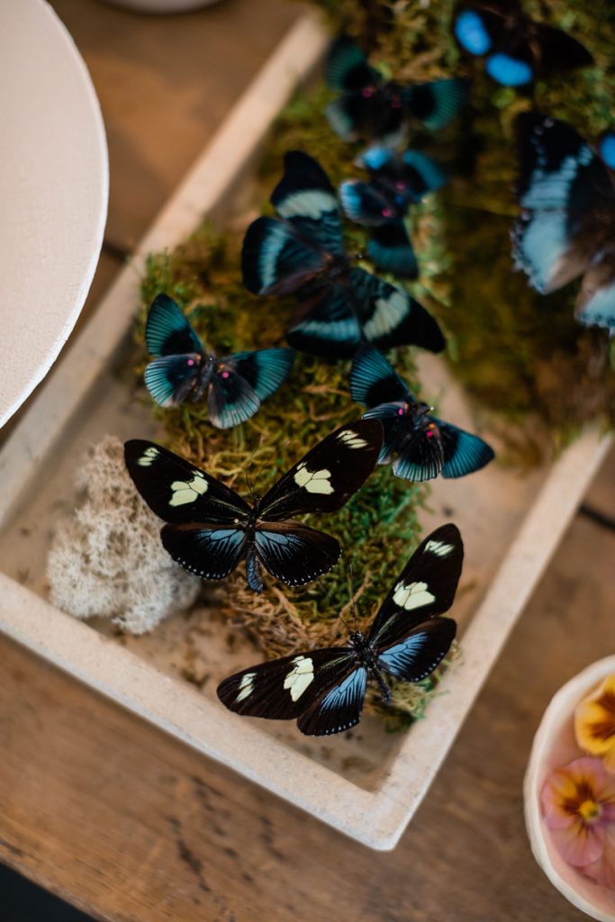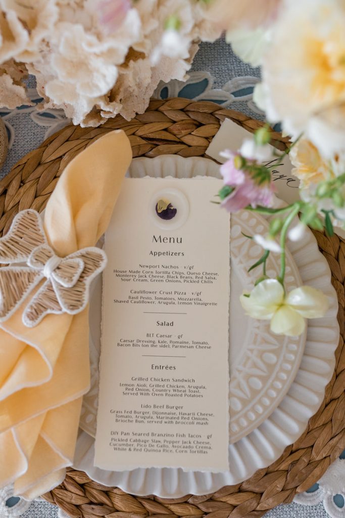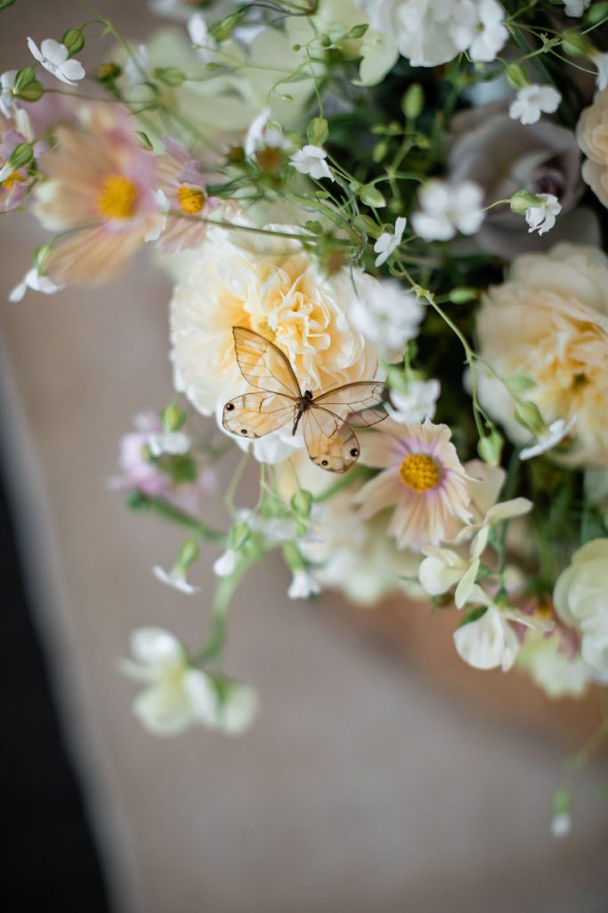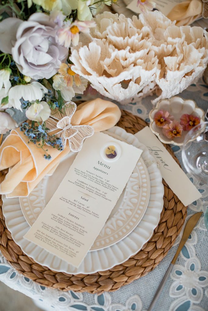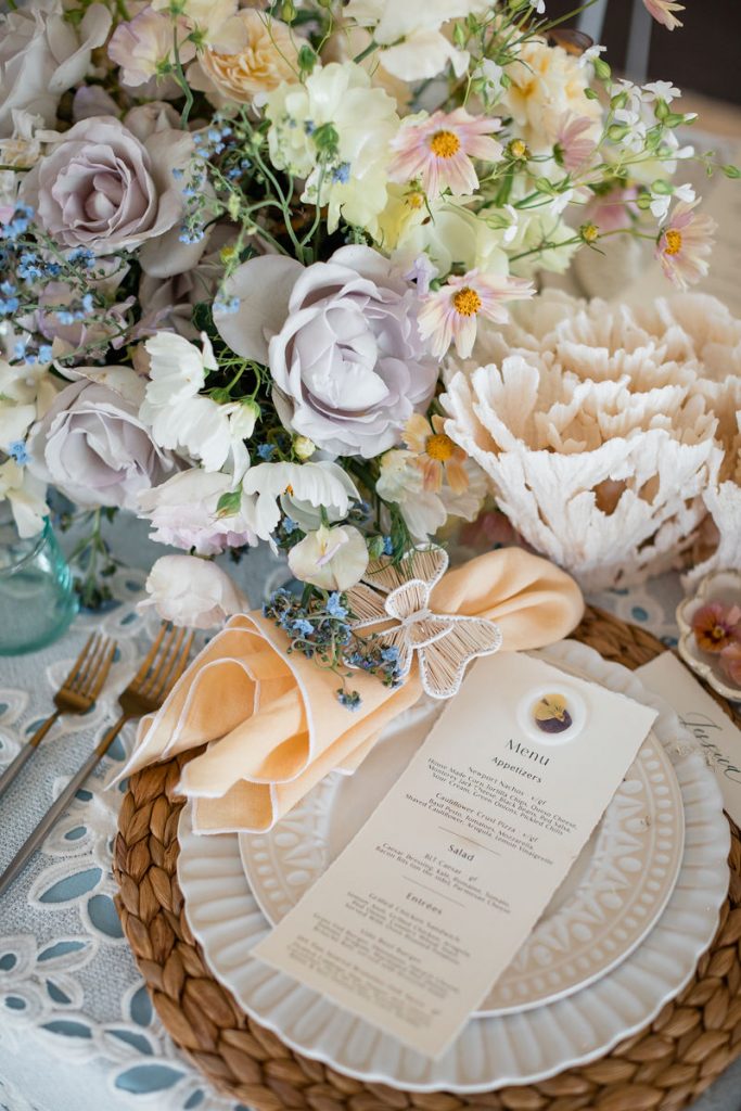 So… You may have noticed the amazing florals along this table, I mean how could you not?! They were absolutely breathtaking! The talented lady responsible for this beauty is Nicole Chapman Design. She was also lucky enough to floralize Michelle’s wedding! The two became very close over all the planning so she was able to execute Michelle’s bridal shower vision perfectly. Nicole mixed gorgeous florals with faux butterflies and elements of the sea-like coral as a nod to our venue location. The whole design was truly incredible.