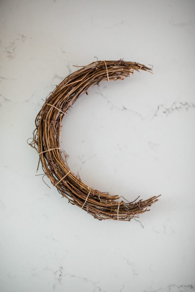 Cut and shape loose grapevine into a moon shape. Bind together at top, middle, and bottom to secure in place