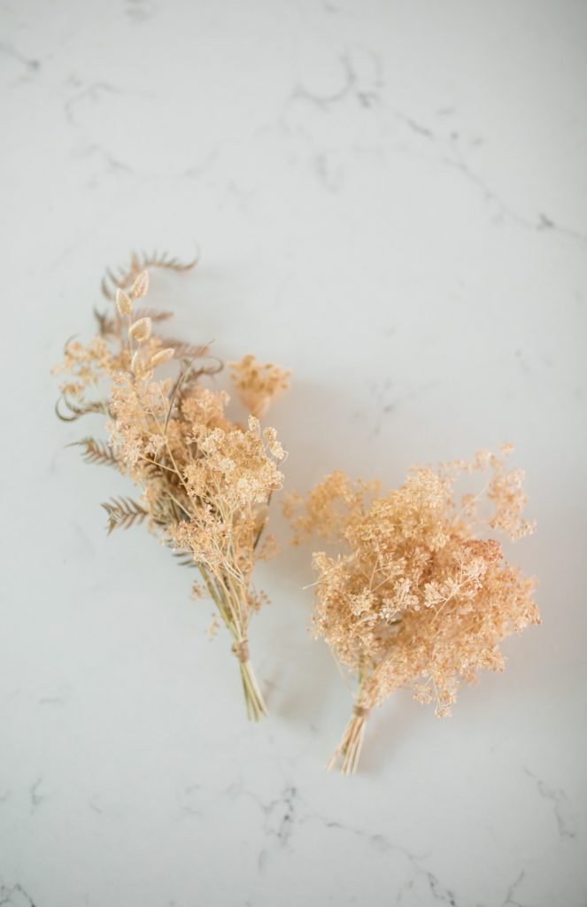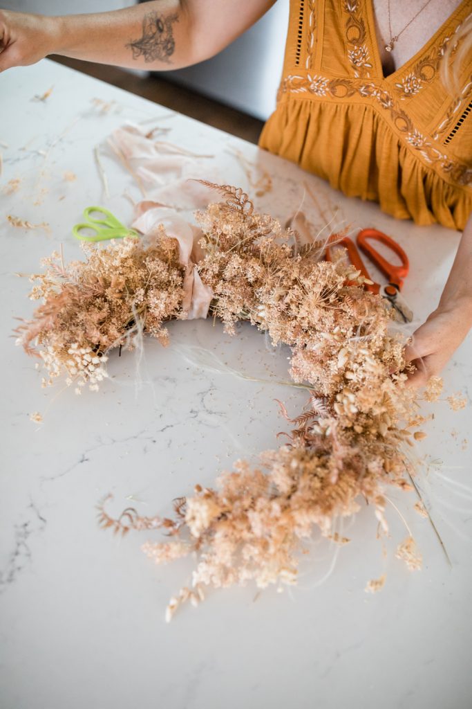 Gather your dried foliage into small bundles, secure with bind wire. Krista used Dried pepper weed, dried fern, dried Queen Anne’s lace, and quaking grass for foliage.