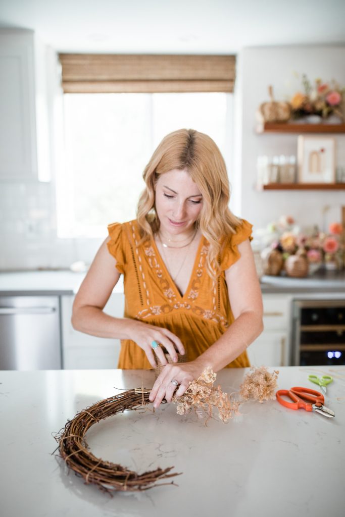 Poke in any extra foliage or flowers straight into the wreath to shape and fill in any gaps. Lastly, tie on a pretty ribbon!