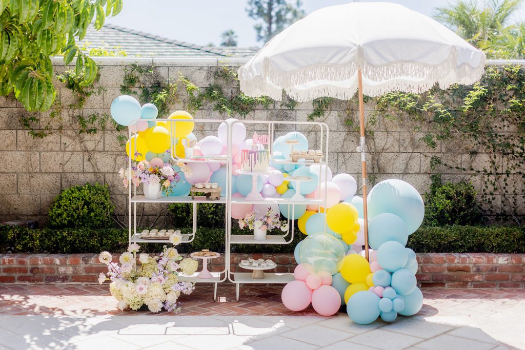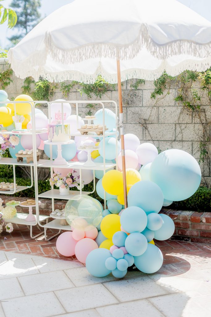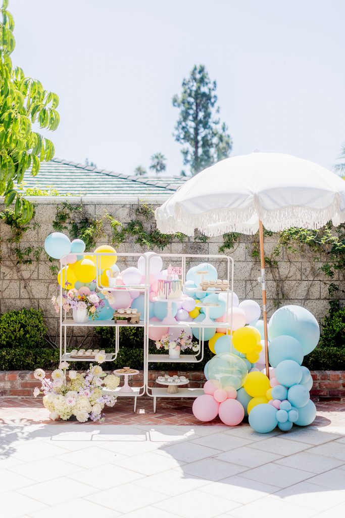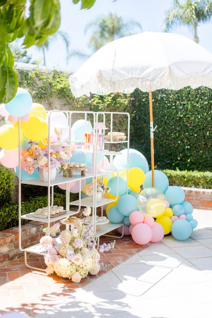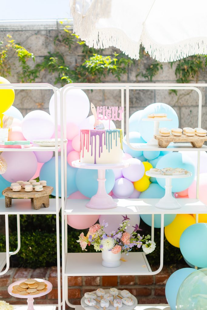 The dessert setup was one for the books! I love using these amazing shelves from Sweet Salvage Rentals to display a variety of themed sweet treats. Add in amazing balloons from The Pop Shop and florals from The Lamb & Poppy and you’ve got one gorgeous situation. Plus, wait till you see the cake…
