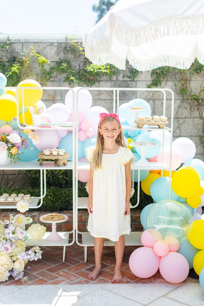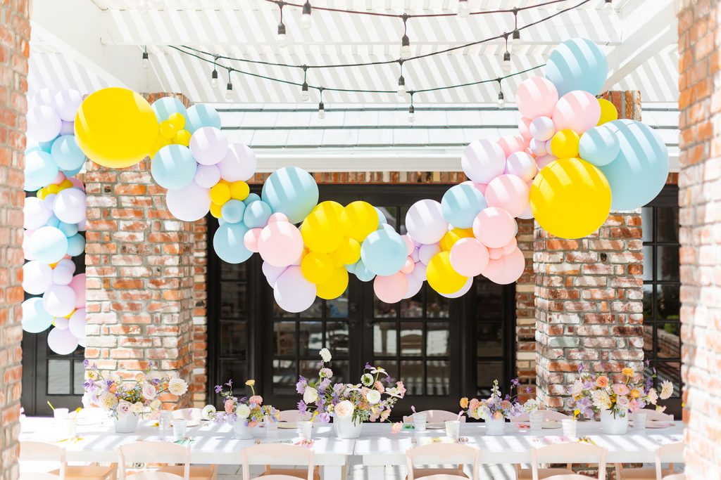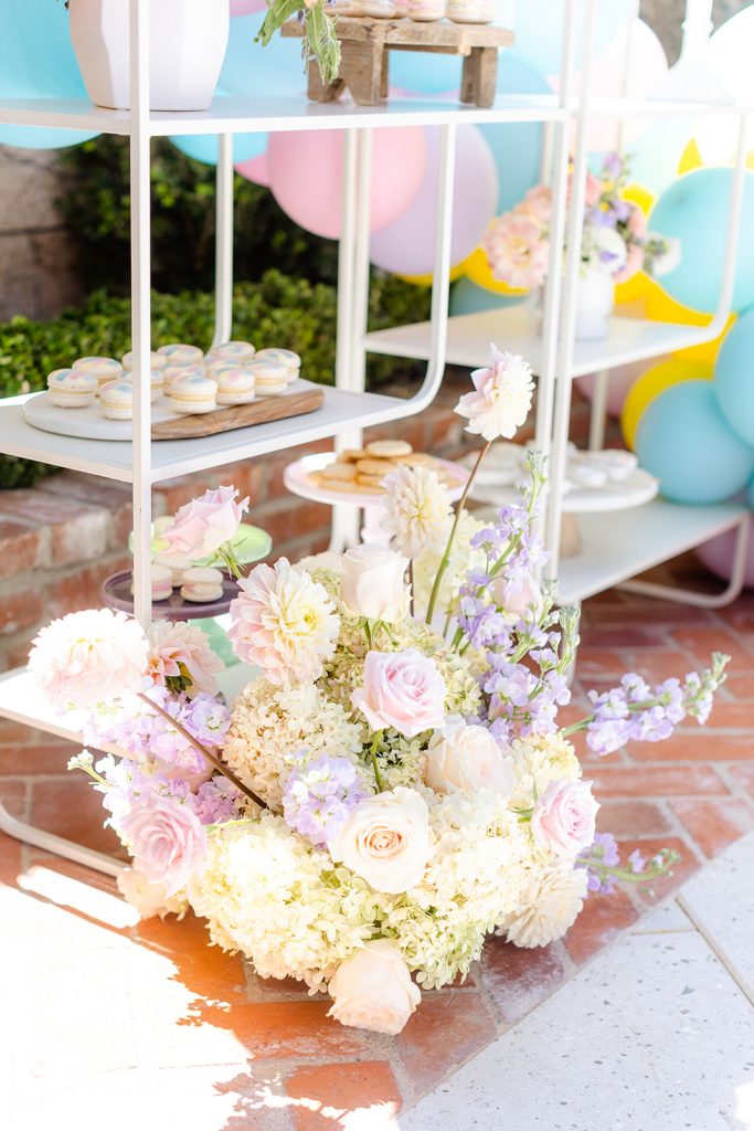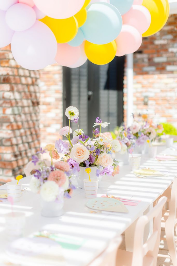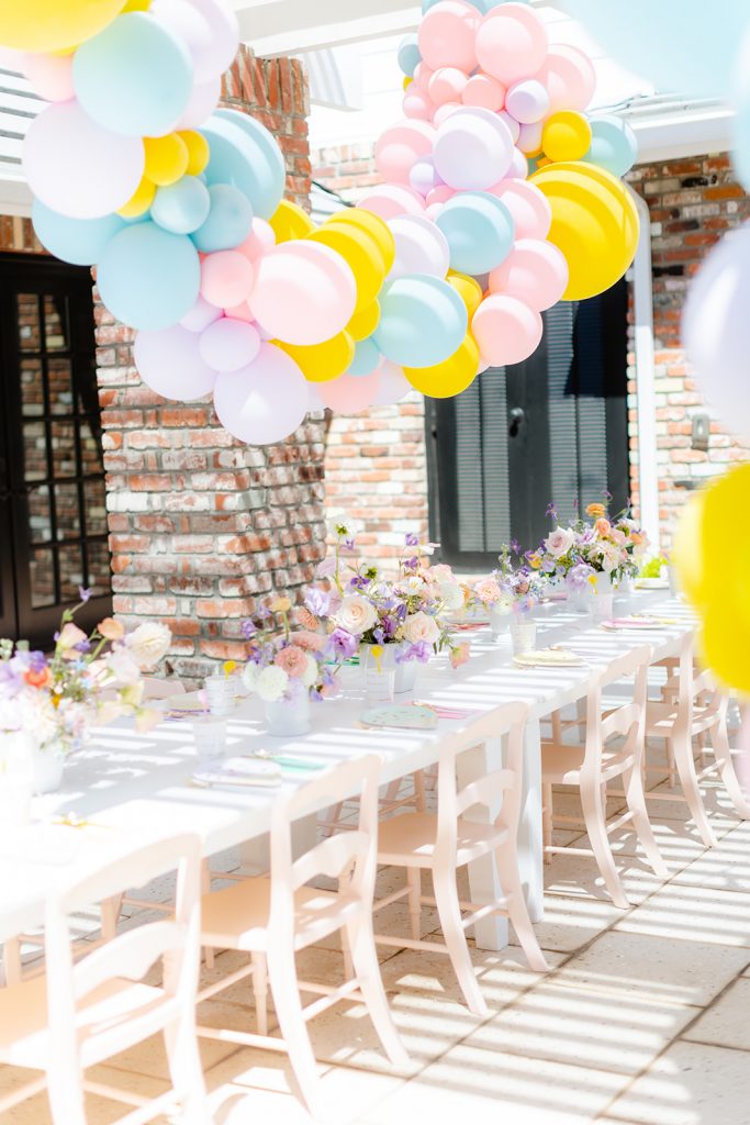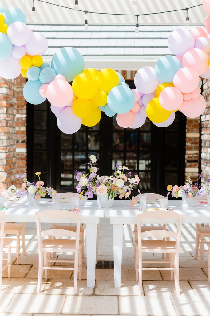 The table was set and ready for kiddos! Obviously, we used Sweet Salvage Rentals’ adorable kid’s collection! I always love using those pretty pink chairs! The gorgeous flowers you see are by The Lamb & Poppy, she took our color scheme and made it even better! And look at that balloon installation! Always amaing work from The Pop Shop…