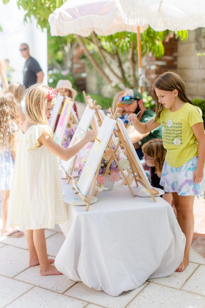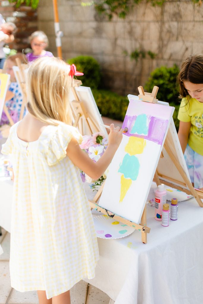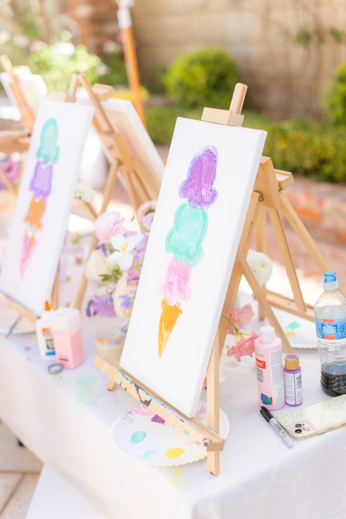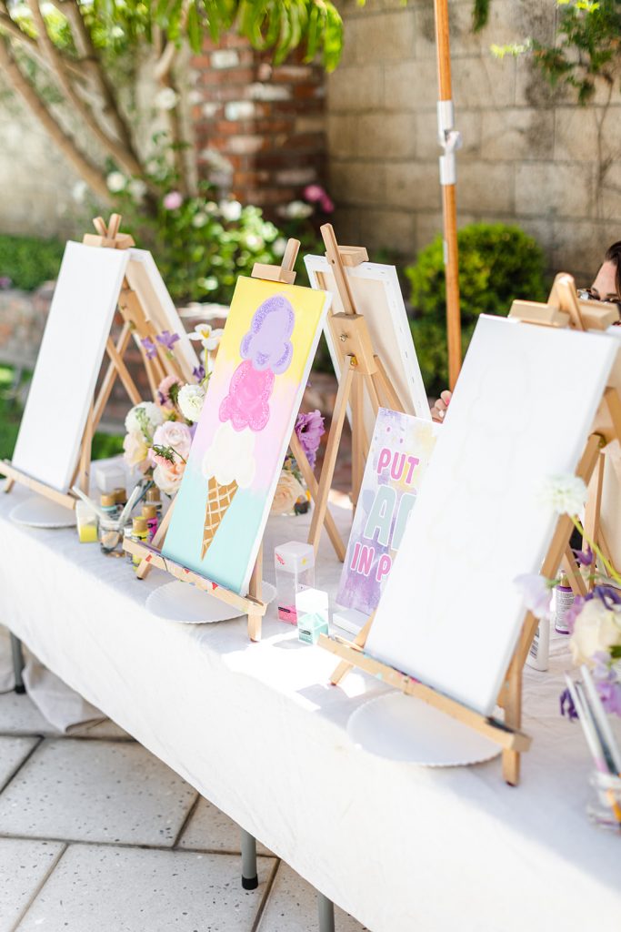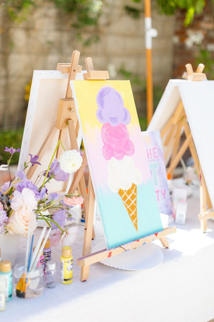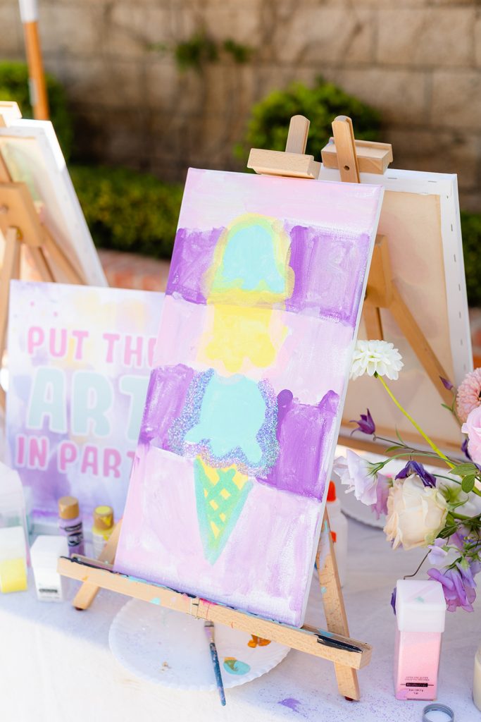 Camp Lila came and brought the art! The kids painted Ice Cream scoops and it was colorful and all things adorable! You know this but we always love adding a fun activity for kids at our parties that bring out their creativity as well. Nothing better than seeing kids have fun with art!