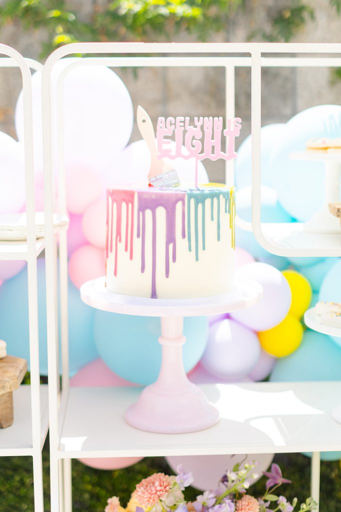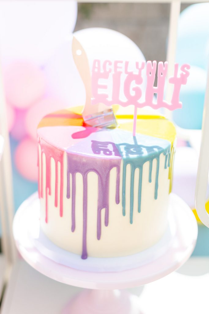 A paint drip cake by Sweet & Saucy Shop with the cutest topper from Poppy Jack Shop, and a paint brush, of course!