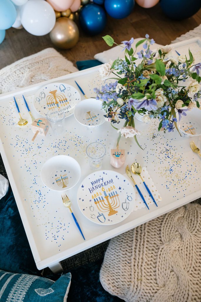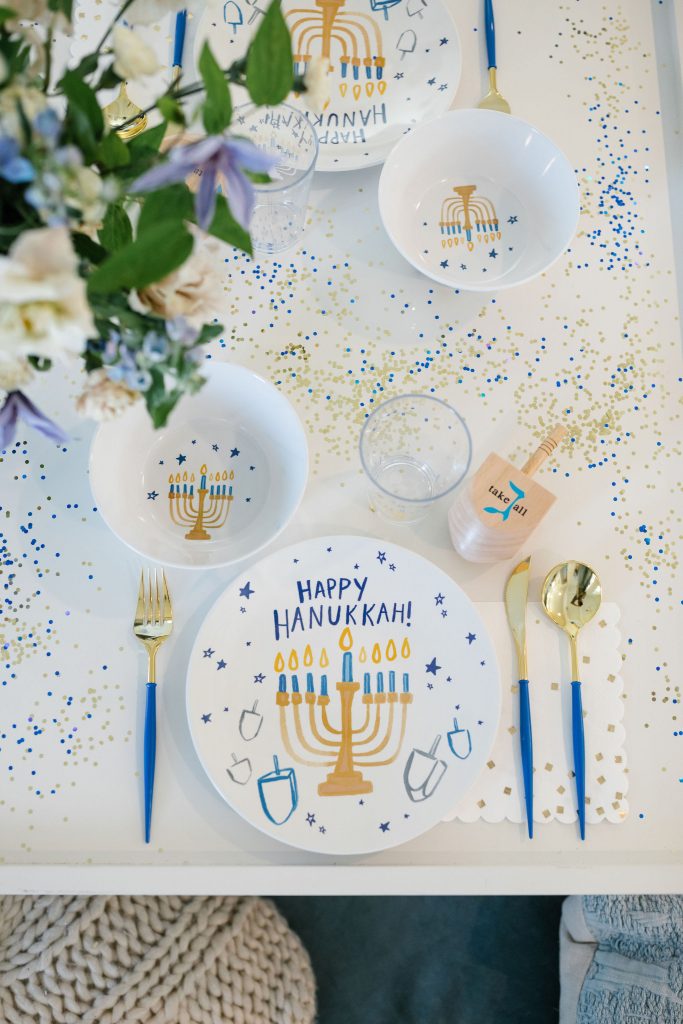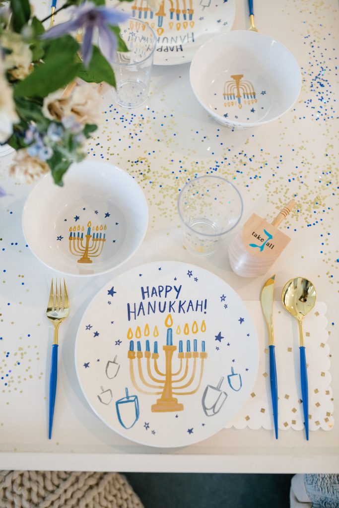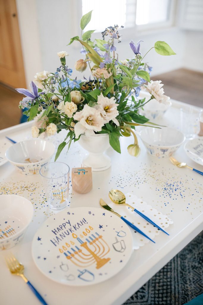 Of course, Pottery Barn Kids has the most adorable tabletop items for Hanukkah! This set is perfect to have at the table for the littles. There is a plate, bowl, and cup included! I just added this amazing blue and gold flatware from Sophistiplate and white and gold napkins from Meri Meri. After that just add gorgeous florals, these are by Earth & Grace and sprinkle some confetti, and voila your kid’s table is ready!!