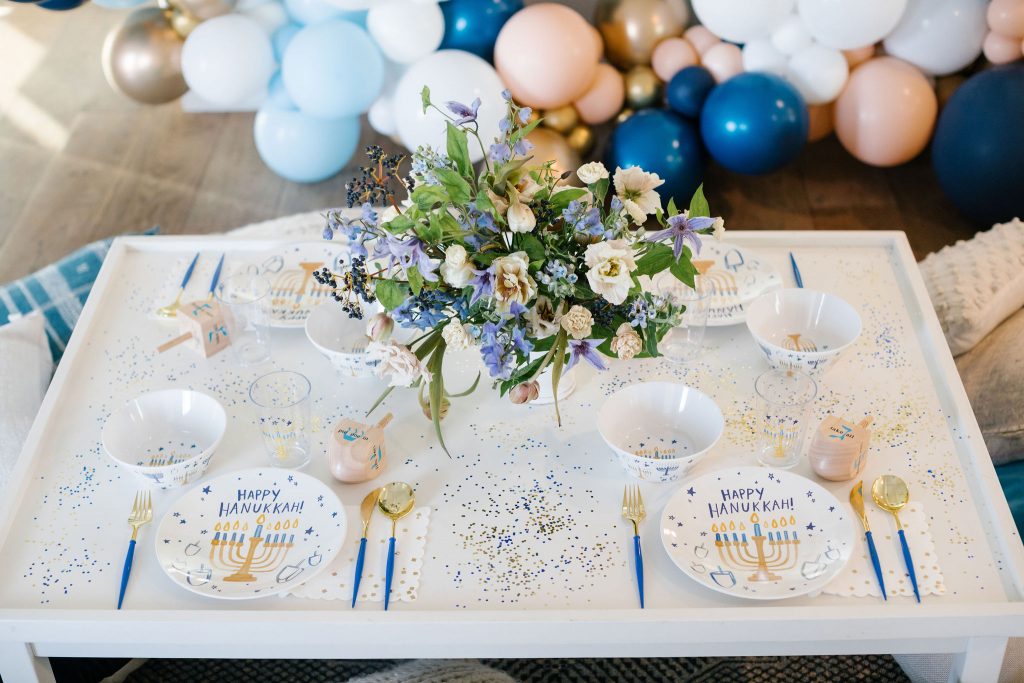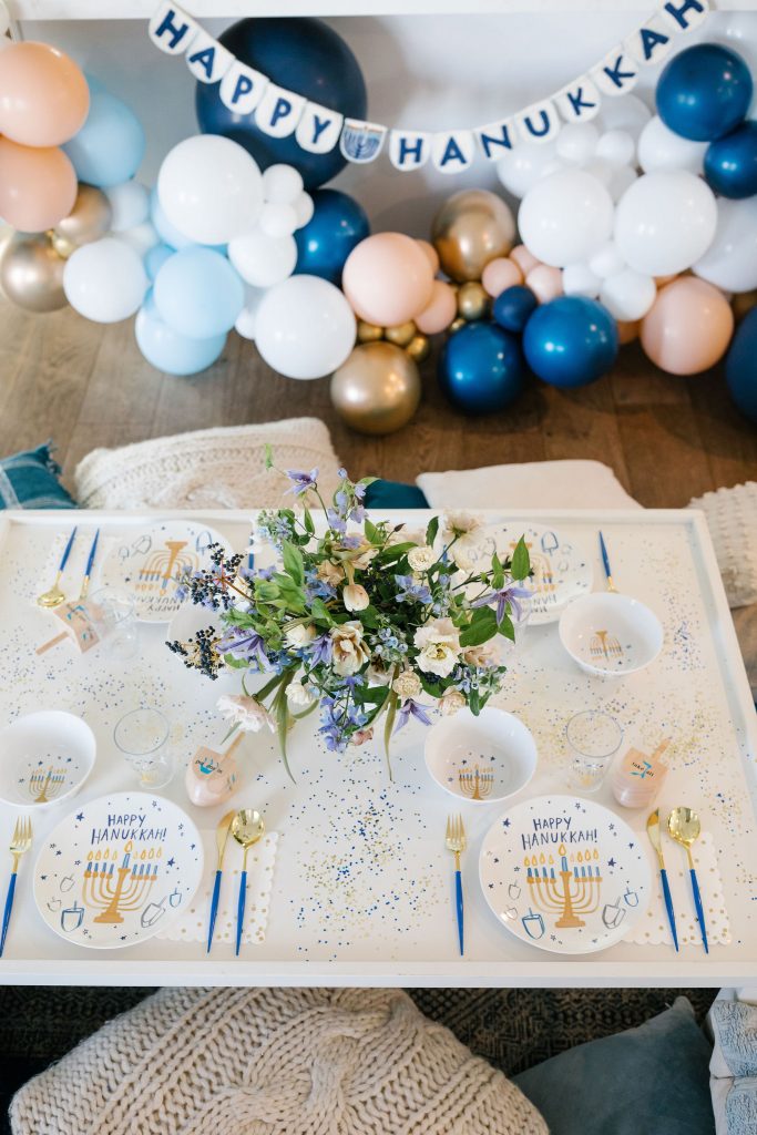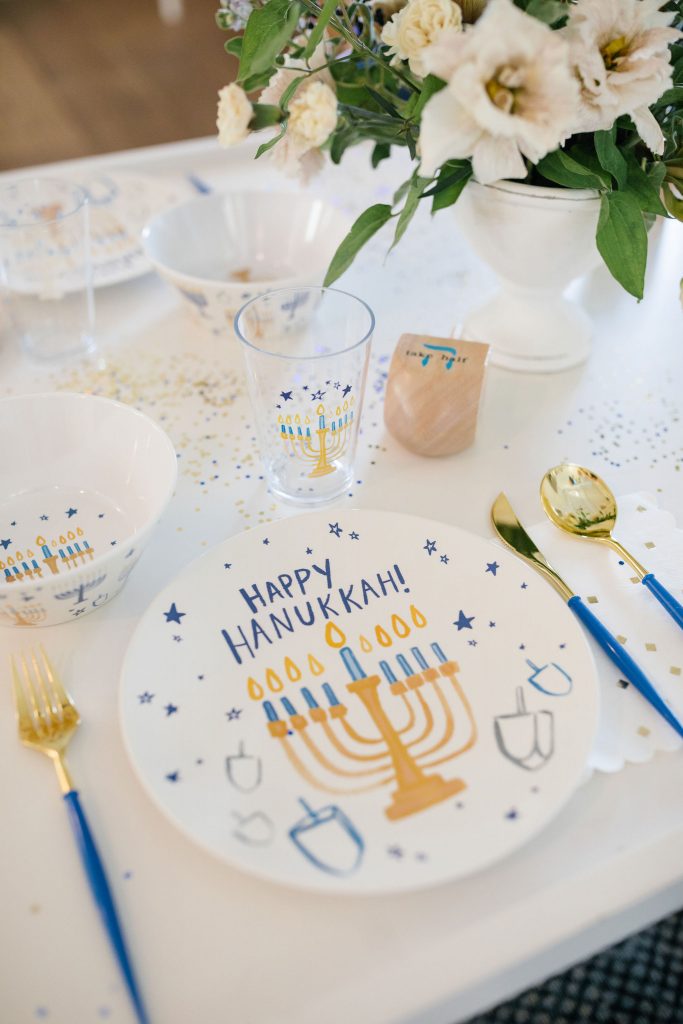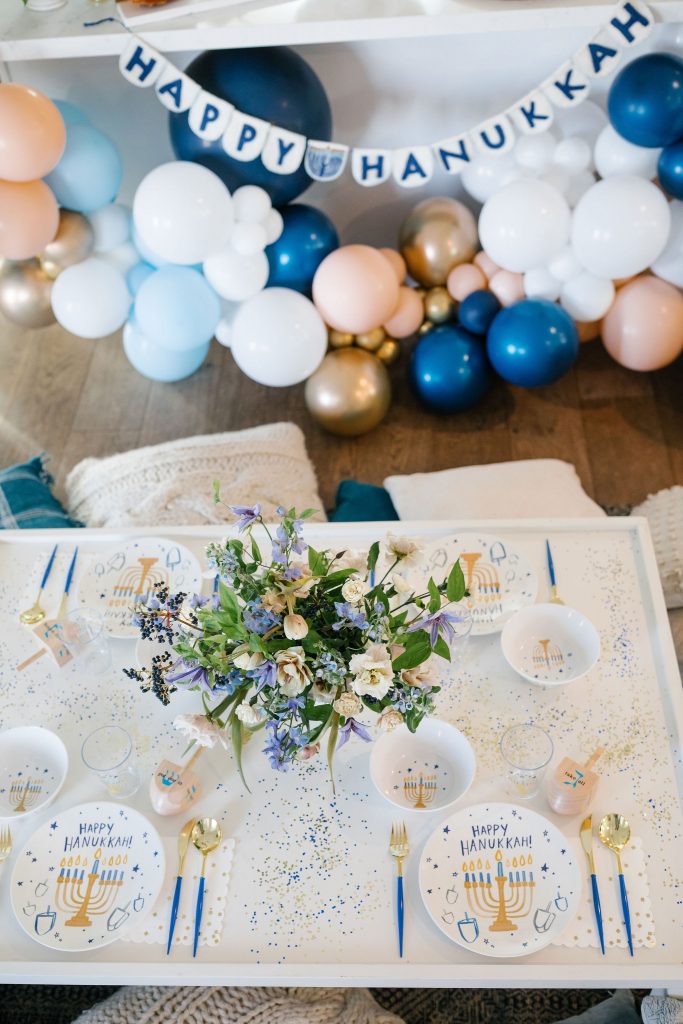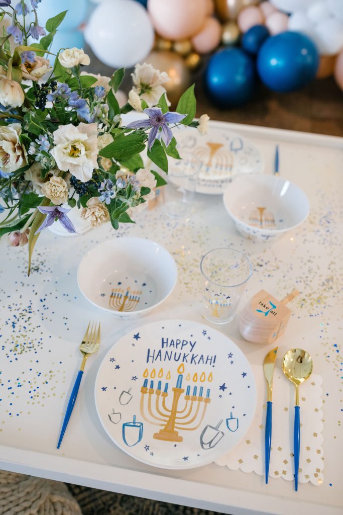 Of course, Pottery Barn Kids has the most adorable tabletop items for Hanukkah! This set is perfect to have at the table for the littles. There is a plate, bowl, and cup included! I just added this amazing blue and gold flatware from Sophistiplate and white and gold napkins from Meri Meri. After that just add gorgeous florals, these are by Earth & Grace and sprinkle some confetti, and voila your kid’s table is ready!!