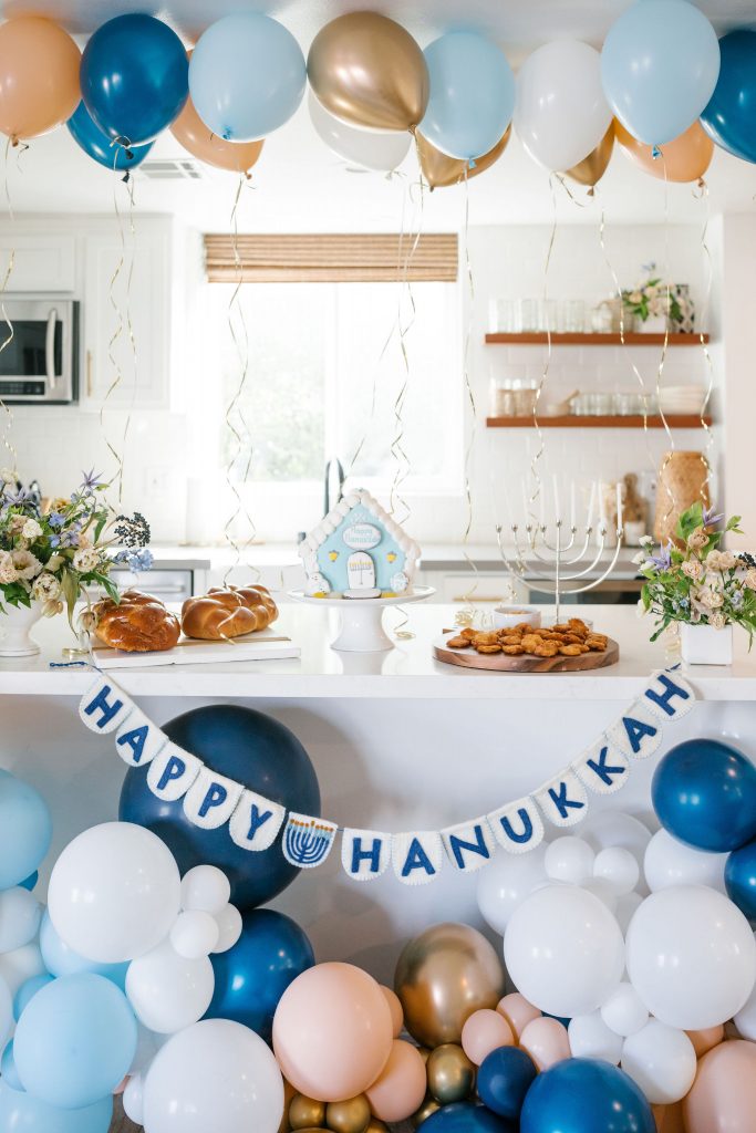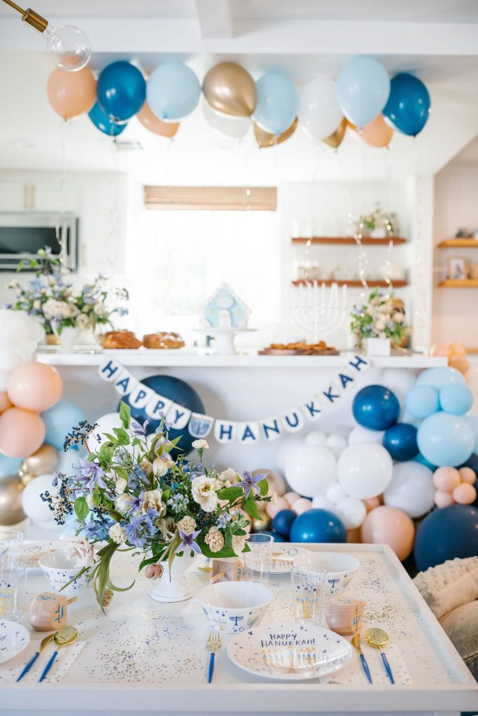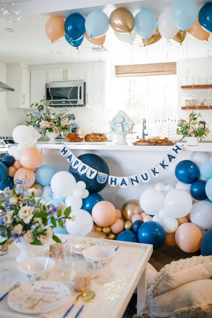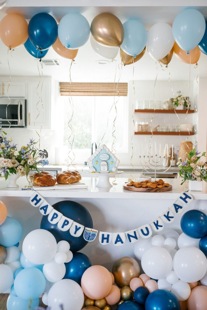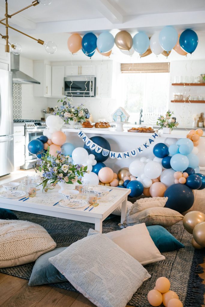 As with any occasion I thought balloons were a must!! Ellen of The Pop Shop came over and decker out my kitchen area with the prettiest Hanukkah color scheme I ever did see. I love the addition of blush and the different shades of blue. We added Pottery Barn Kid’s adorable Hanukkah banner to make it even more festive!