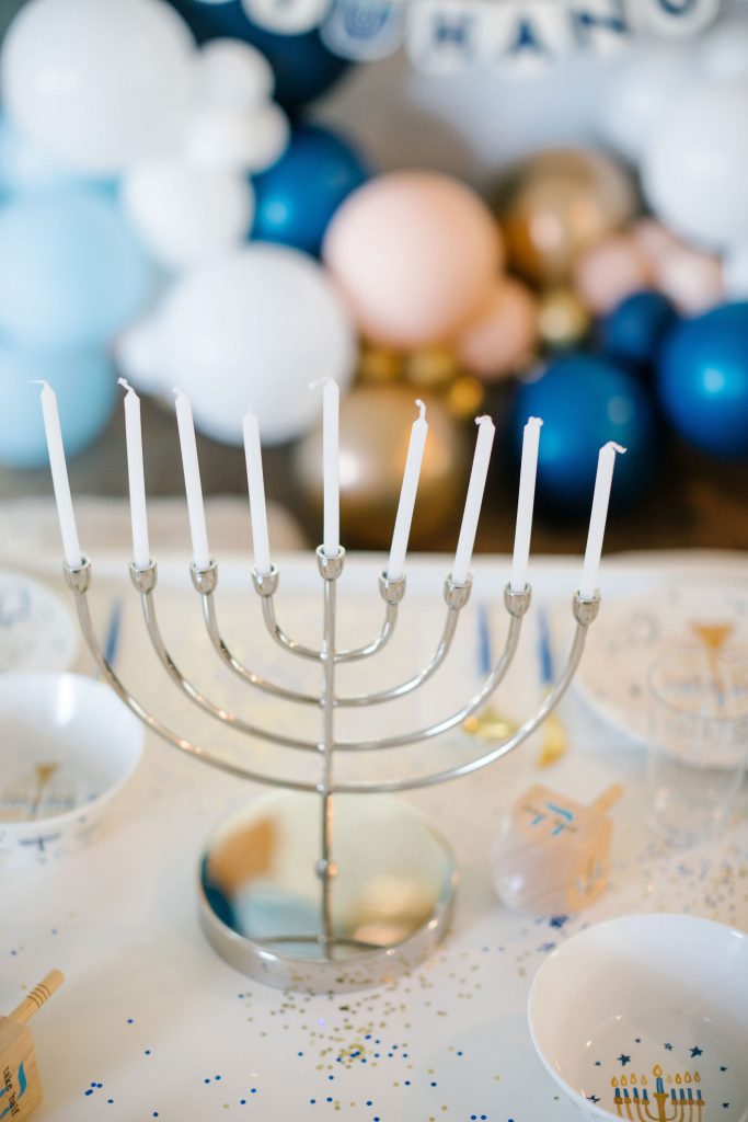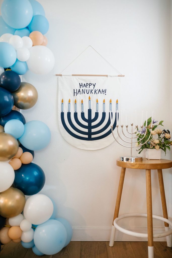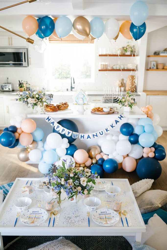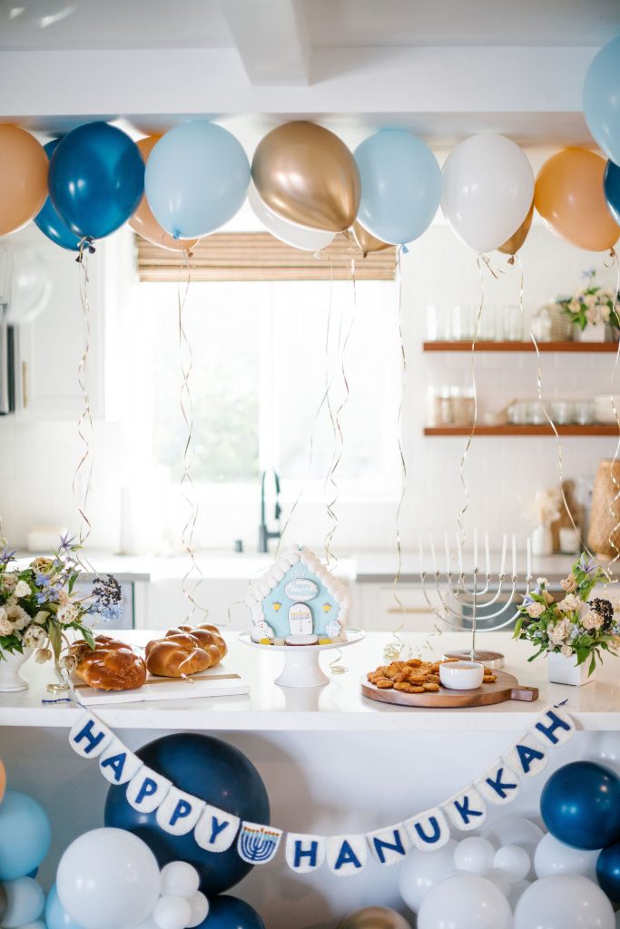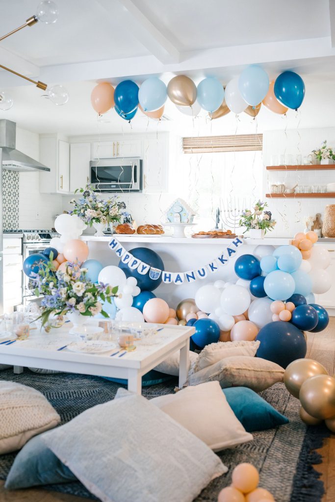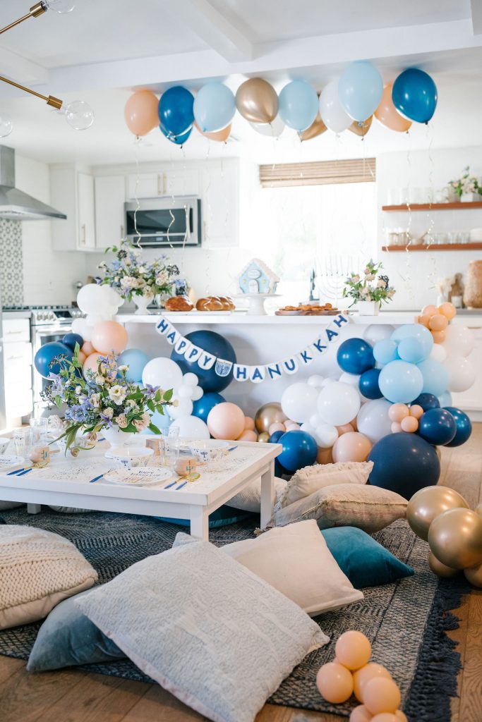 As with any occasion I thought balloons were a must!! Ellen of The Pop Shop came over and decker out my kitchen area with the prettiest Hanukkah color scheme I ever did see. I love the addition of blush and the different shades of blue. We added Pottery Barn Kid’s adorable Hanukkah banner to make it even more festive!
