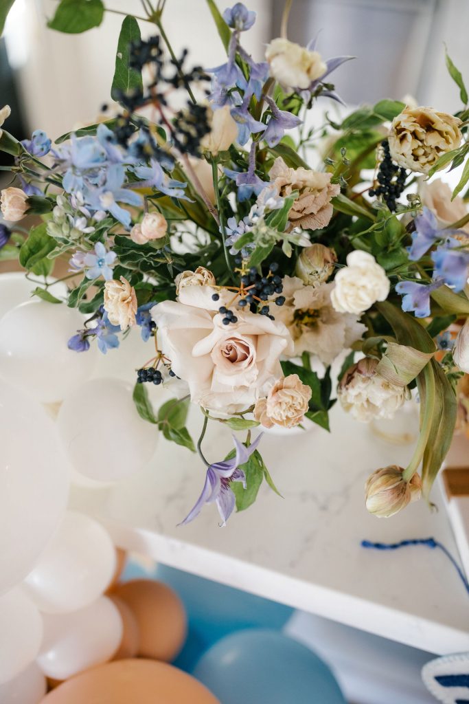 Speaking of festive, did you notice the gorgeous floral arrangements by Earth & Grace? Flowers always add so much to a space for an event and this was no exception. Just like the balloons I loved the colors she used, mixing blues and tans with greenery was just brilliant!
