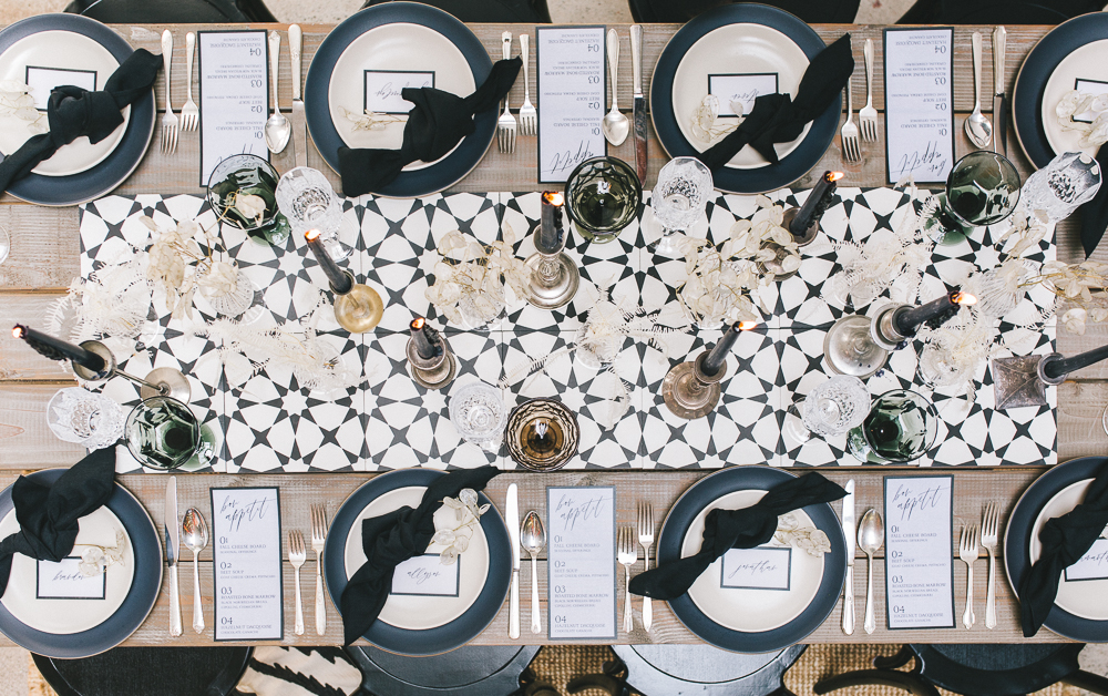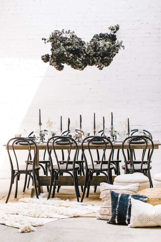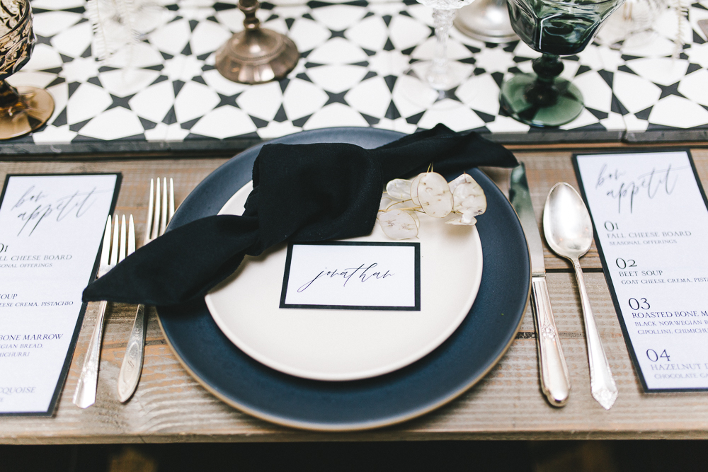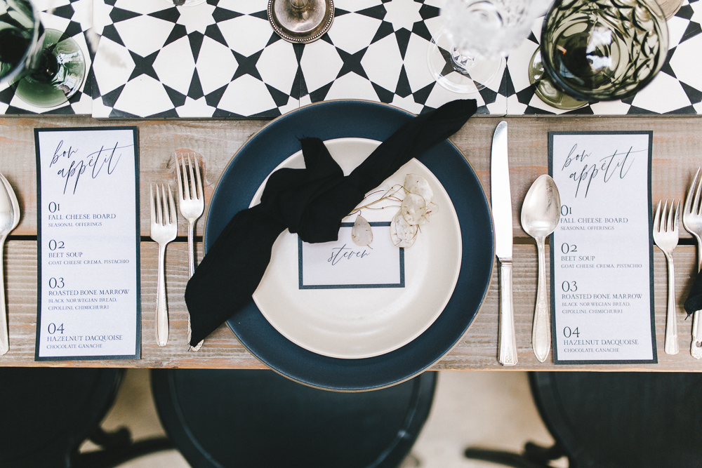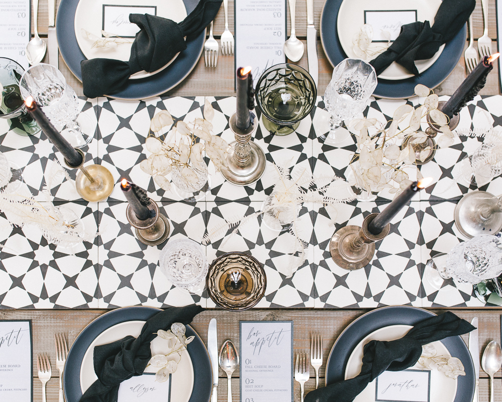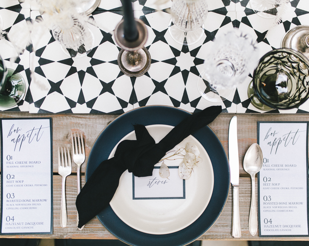 If you want a modern vibe – go Minimal… With the stand out pieces being the tiles and the floral installation (more on that later) I kept everything else fairly clean and simple. From the paper goods by River & Bridge to the gorgeous tabletop from Cherished Rentals. We also used sparse flowers on top of the table to let the tiles do the talking – but black tapered candles are definitely a must!