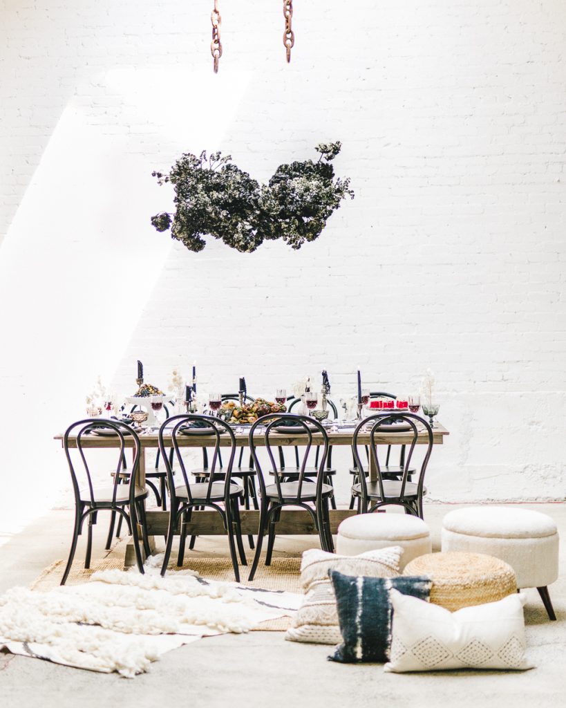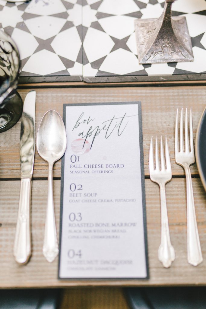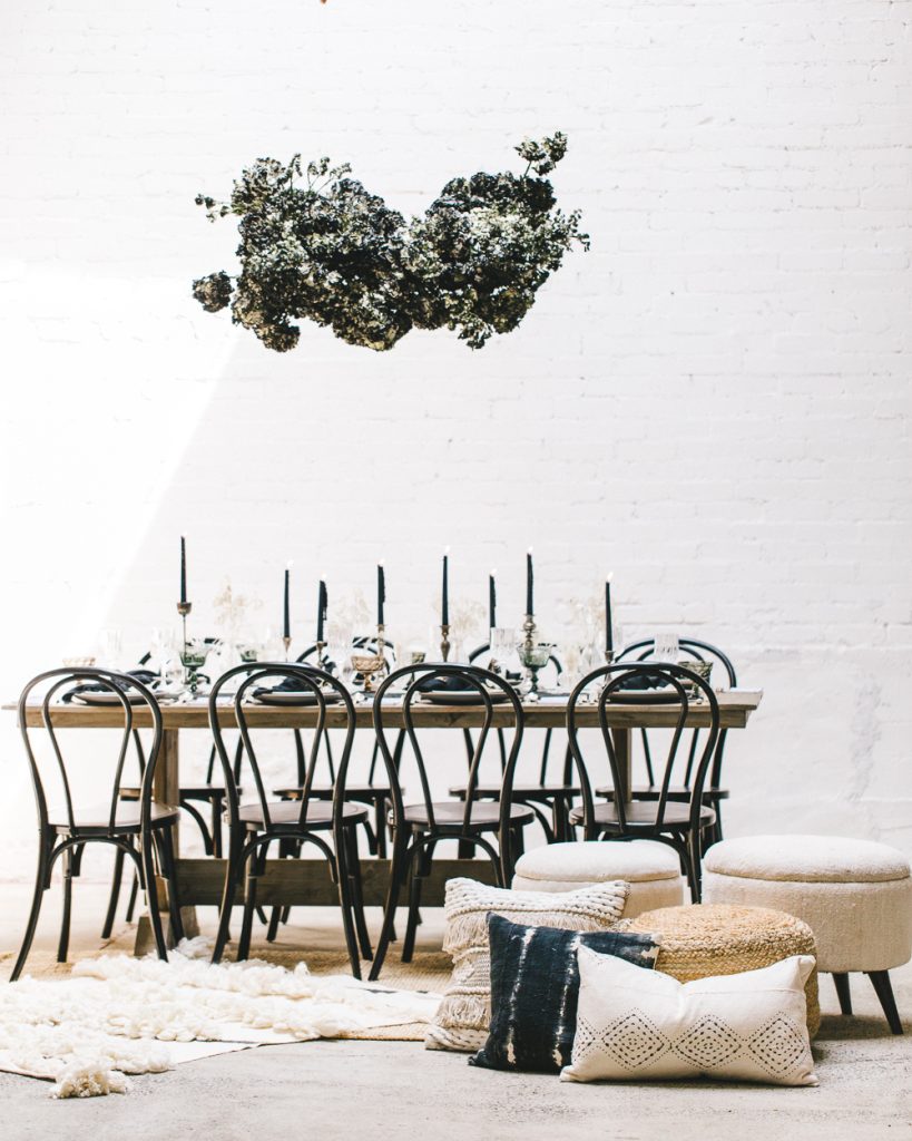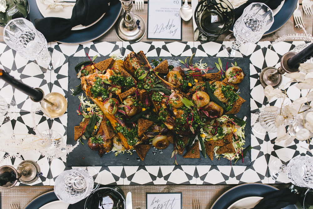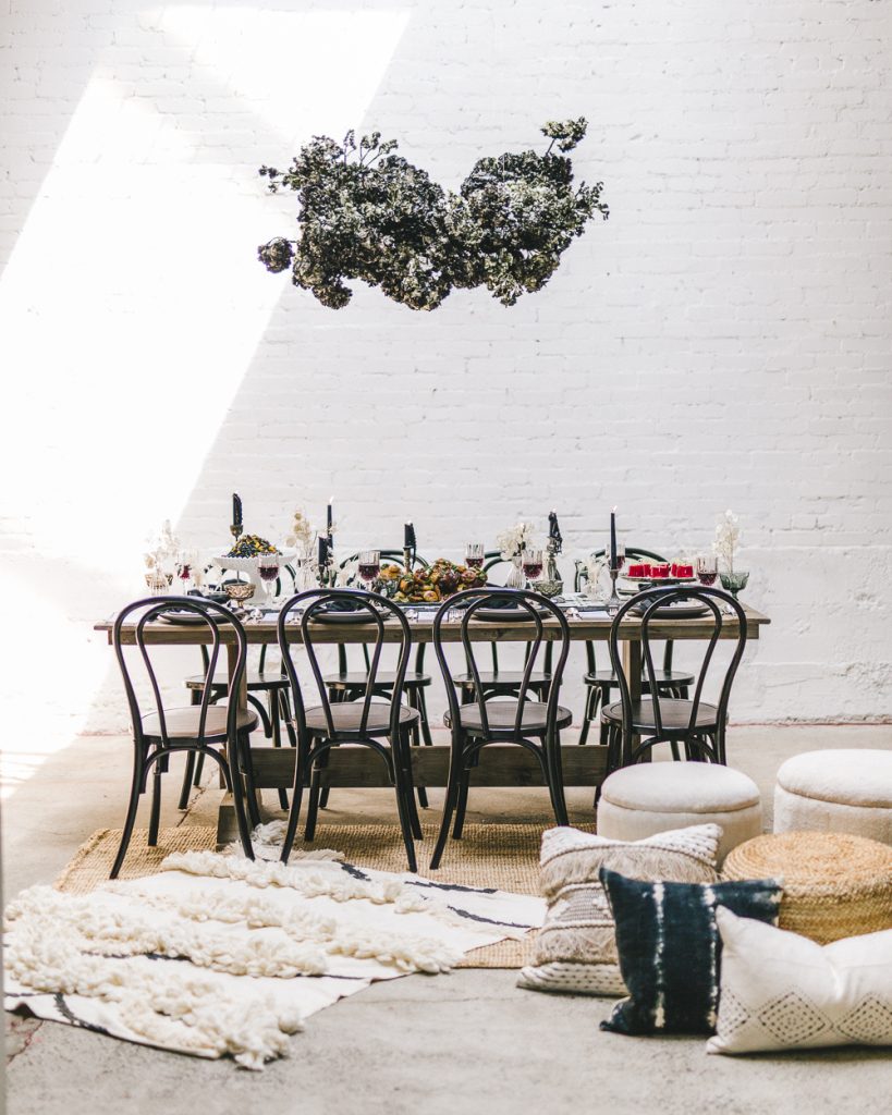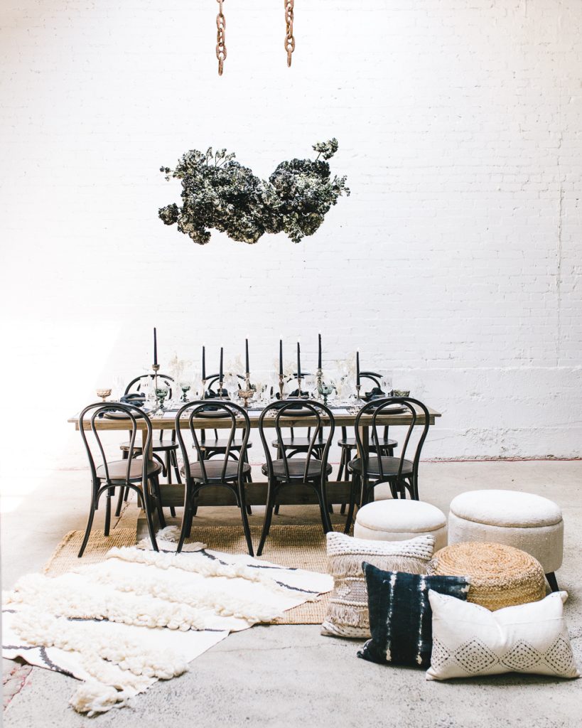 If you want a modern vibe – go Minimal… With the stand out pieces being the tiles and the floral installation (more on that later) I kept everything else fairly clean and simple. From the paper goods by River & Bridge to the gorgeous tabletop from Cherished Rentals. We also used sparse flowers on top of the table to let the tiles do the talking – but black tapered candles are definitely a must!