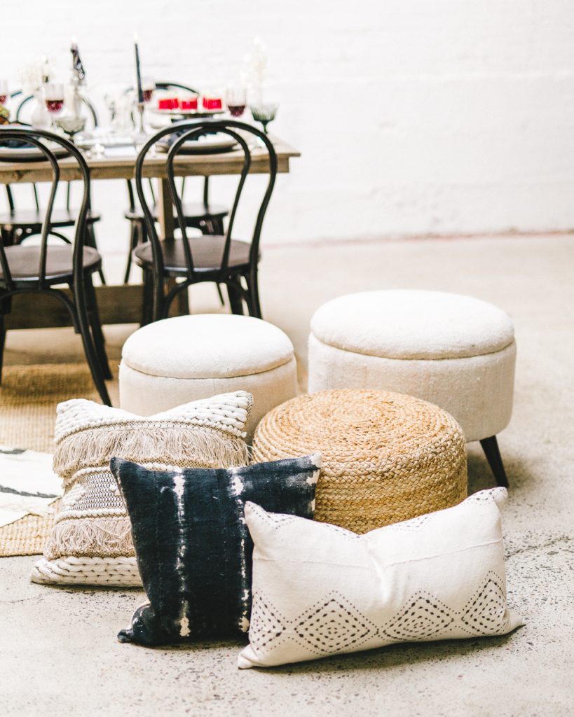 My next tip, when hosting at home, keep it cozy – It’s important to make your home feel inviting when hosting a party. We love using all of Sweet Salvage Rentals beautiful goodies, and all of their rugs, poufs, pillows are the perfect touch to make anyone feel at ease.