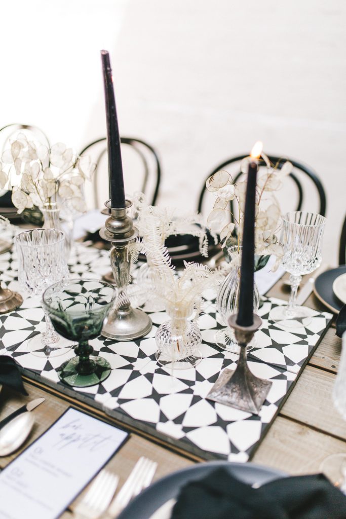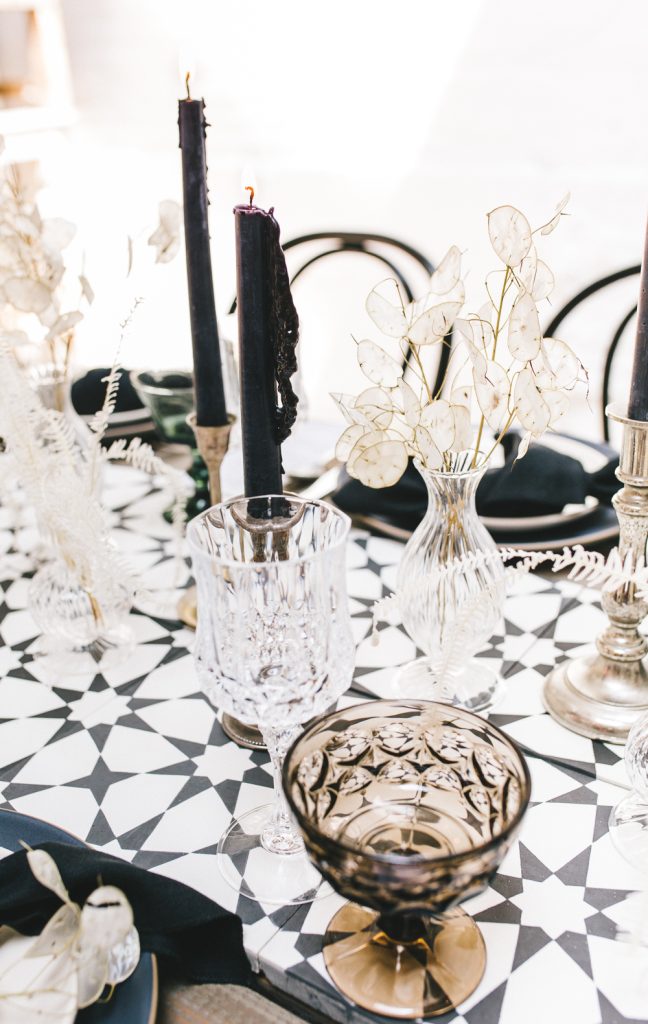 There’s that pretty and minimal tabletop and glassware I was talking about! With the Cement Tile runner you really don’t need to go crazy on that front. Keep it simple and modern and the results will turn out great! Plus, adding some black tapered candles on Halloween is ALWAYS a good idea!
