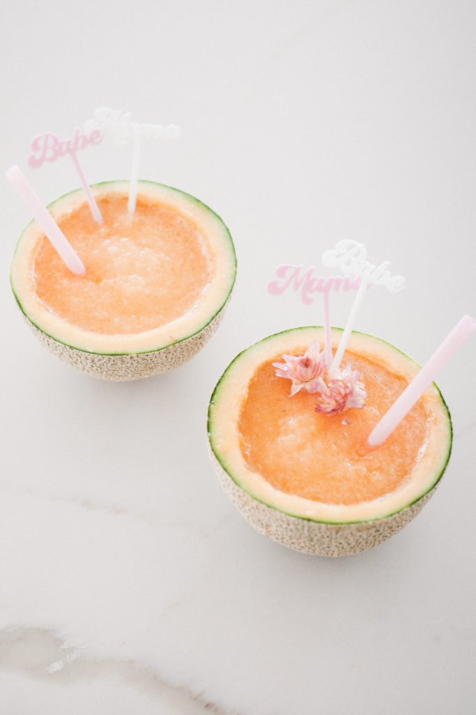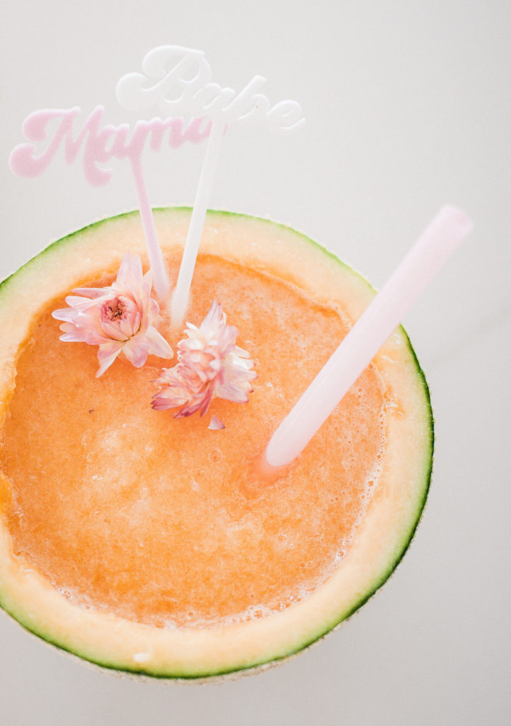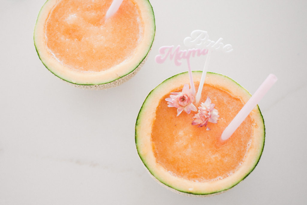 There is something so fun about the unexpected pairings of food. Like today, fresh cantaloupe and coconut. A perfect summertime match. My kids love and I mean LOVE cantaloupe, so it is always in the house. I thought to myself that has got to be a good base for a cocktail, and oh boy was I right! Do you know the best part? You don’t need any glassware! Serve it up in the cantaloupe itself! This is one fun cocktail! With it being Mother’s day this weekend, I added in some fun mama and babe cocktail stirs from The Roc Shop. Serve this up on Sunday, and all the mamas will be thanking you!