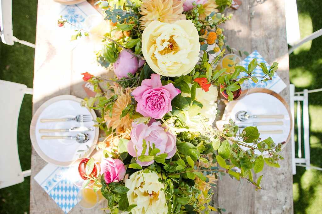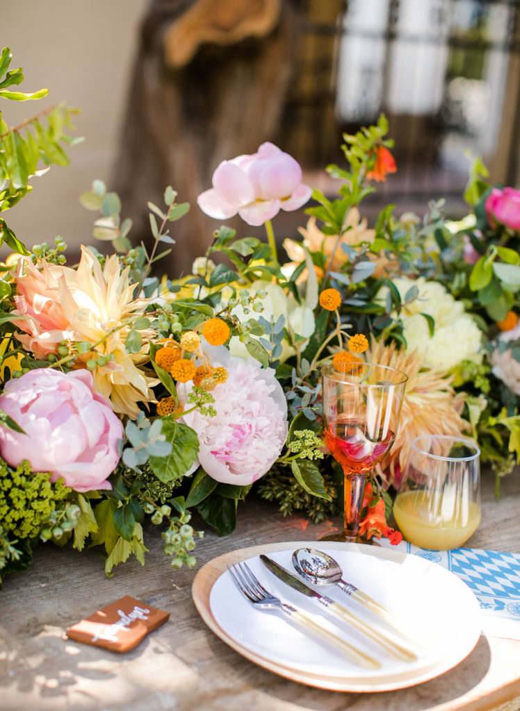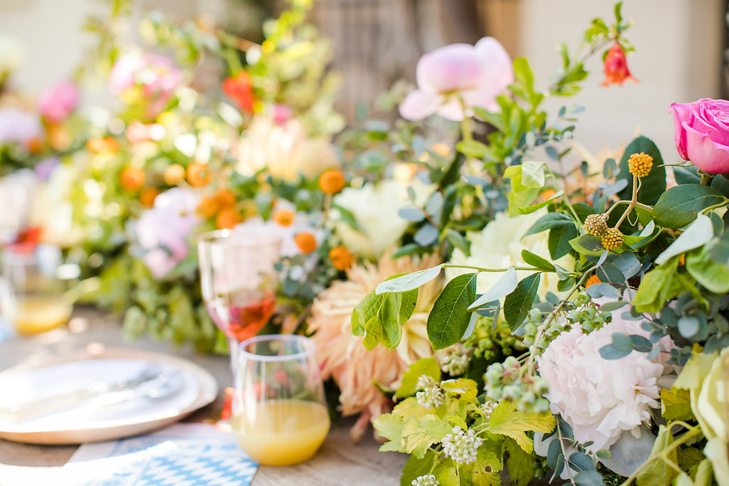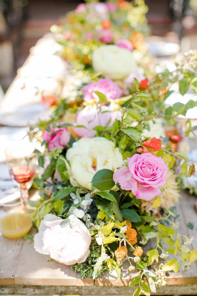 Now isn’t this the prettiest summer table you’ve ever seen?! I love how fun and colorful it is!! The amazing rentals are from Sweet Salvage Rentals and the gorgeous flowers are by The Urban Gardener. Loving the look of a living runner and Tiffany from Urban Gardener executed it perfectly!!