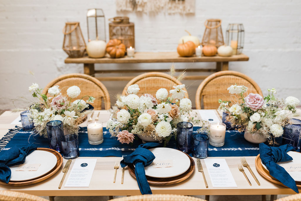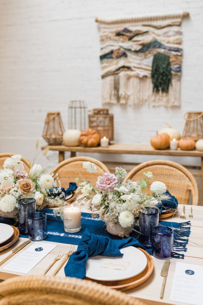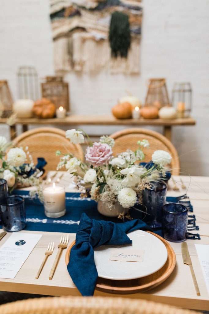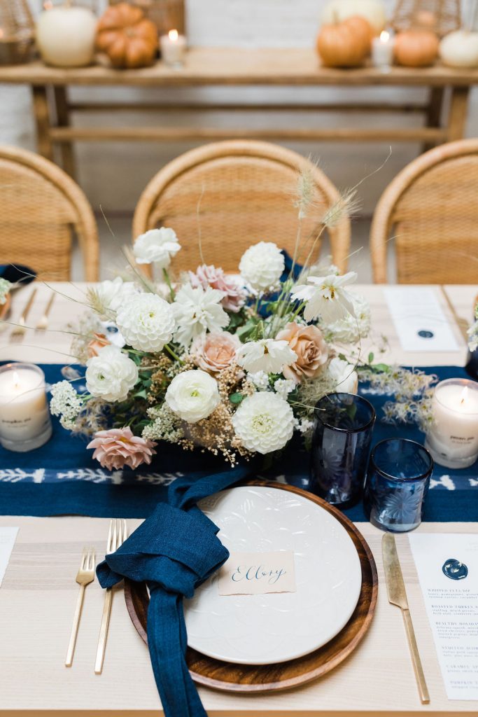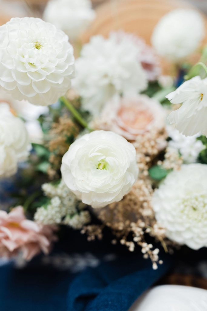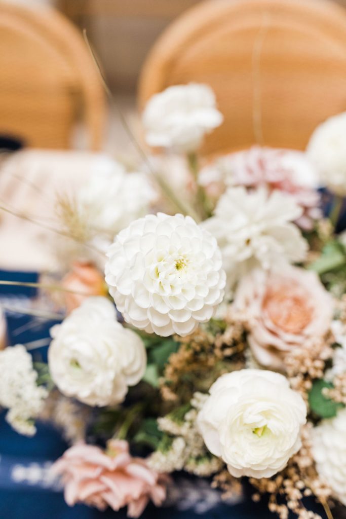 I’m really digging the contrast of the deep indigo and the neutral florals. Speaking of those lovely floral arrangements they were made by our gal Alex from Third & Park. She masters in neutral tones and blush so she was the perfect girl to call for this one!