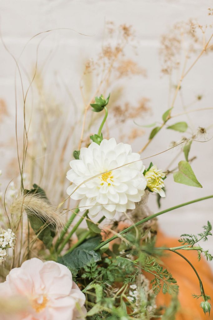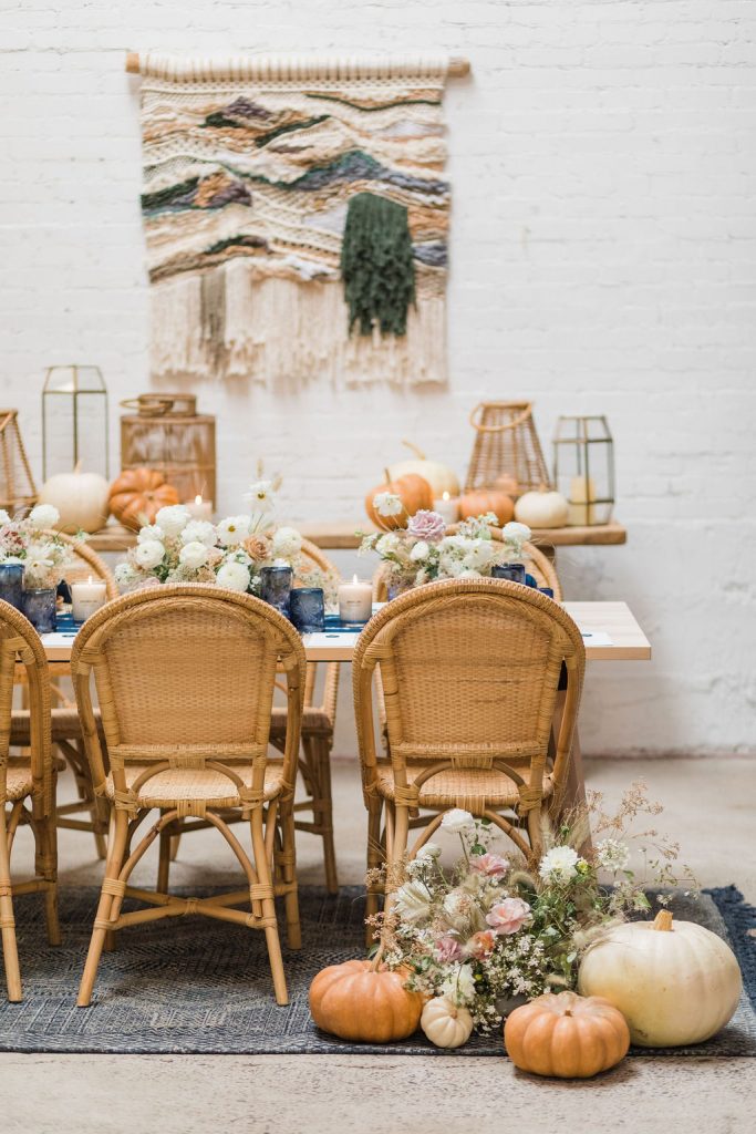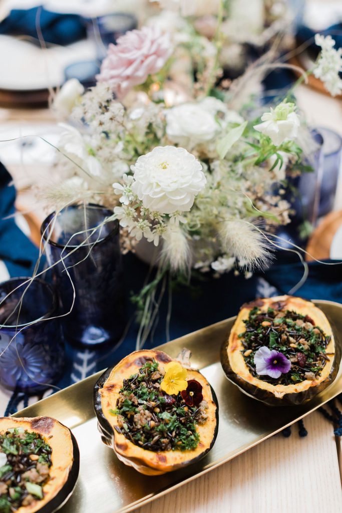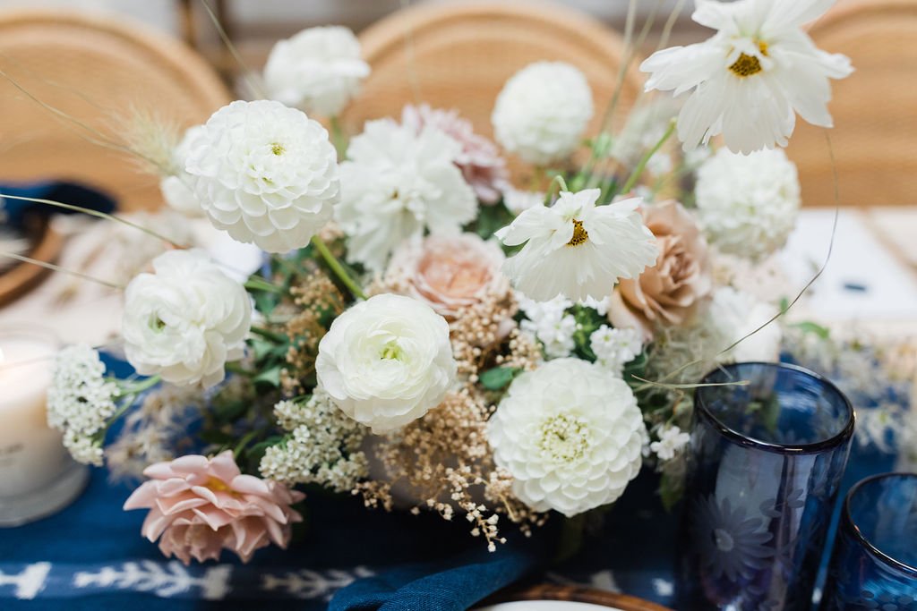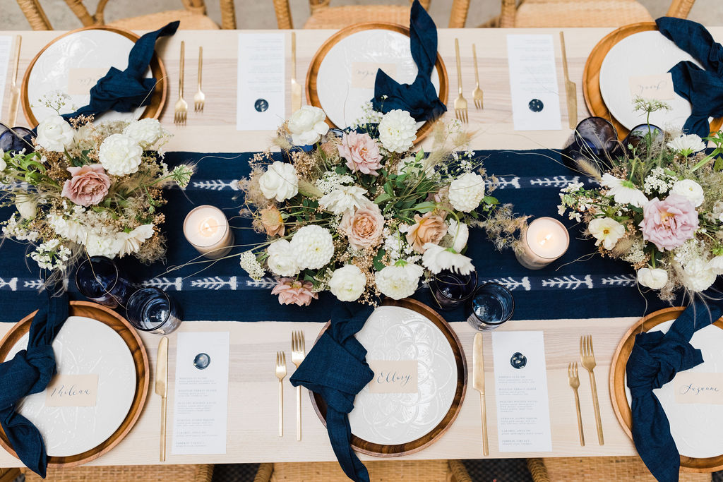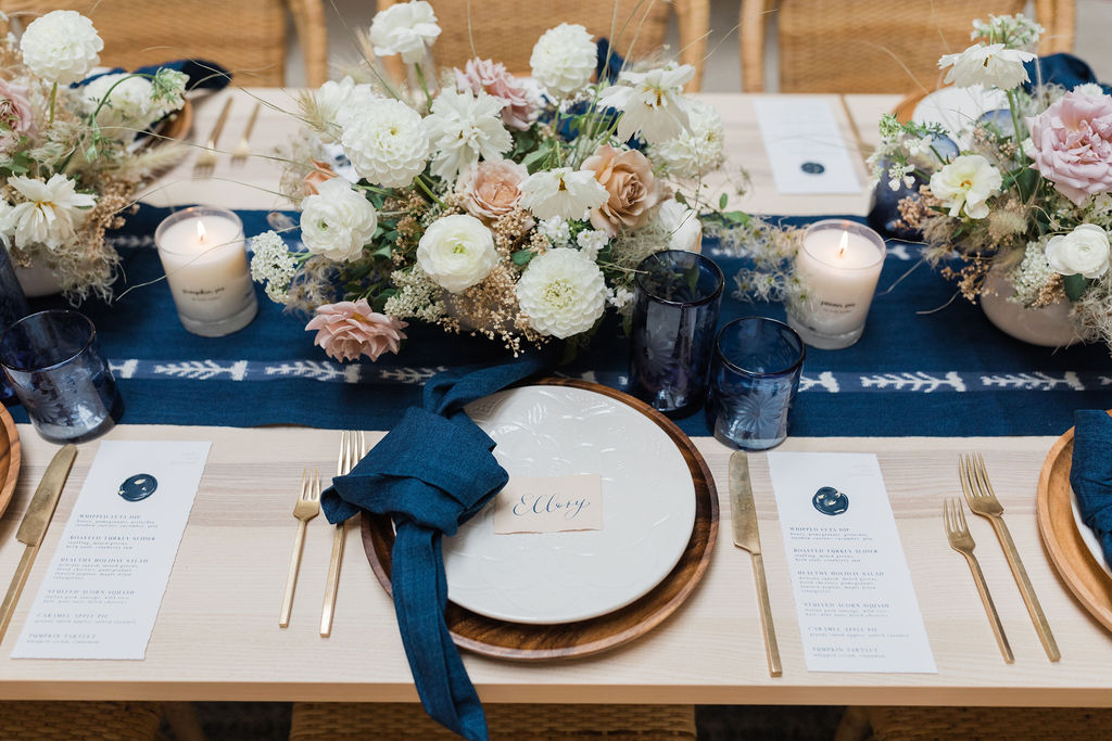 I’m really digging the contrast of the deep indigo and the neutral florals. Speaking of those lovely floral arrangements they were made by our gal Alex from Third & Park. She masters in neutral tones and blush so she was the perfect girl to call for this one!