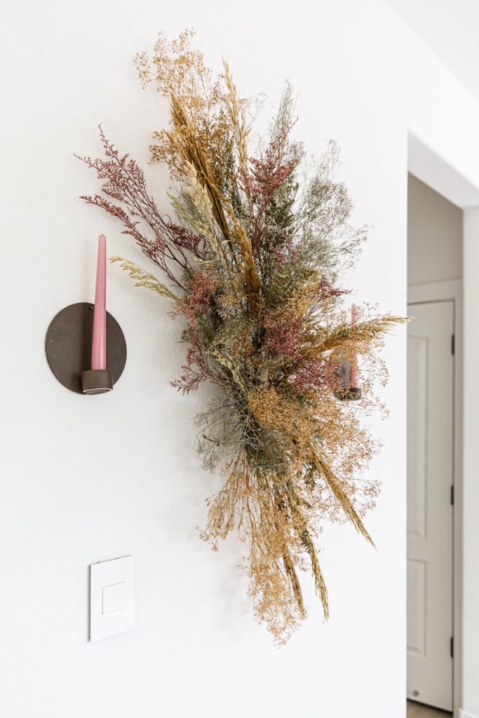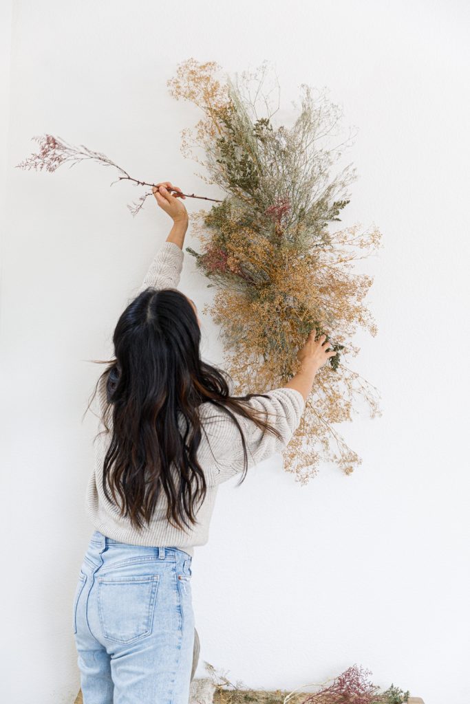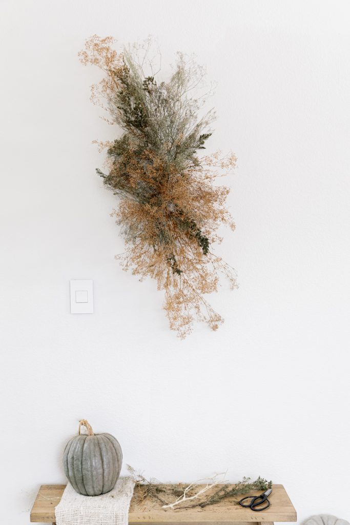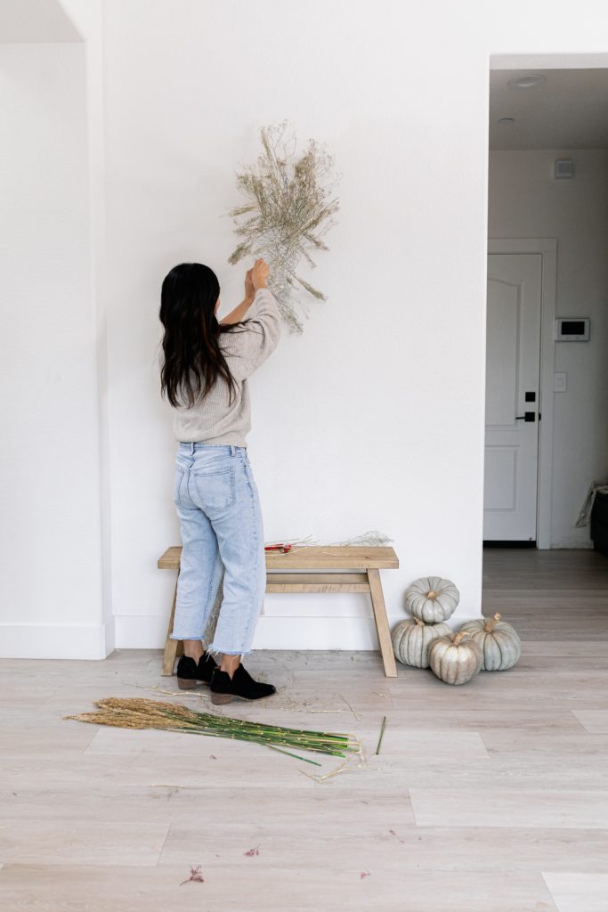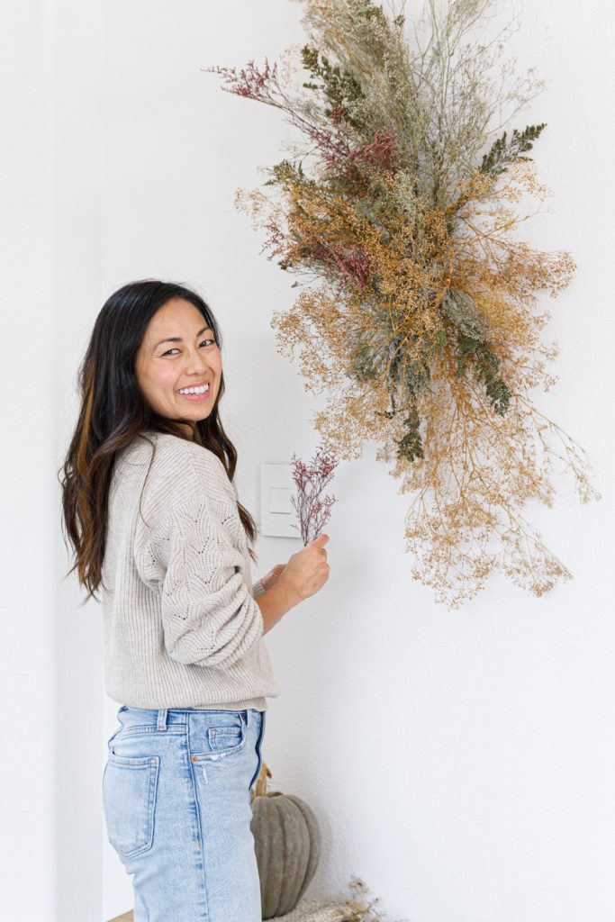 Sammy makes it super easy for us! It’s all about adding layers upon layers. Have about three different types of dried florals to work with for this fall DIY.